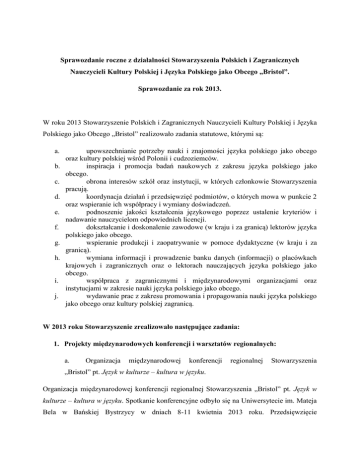 Sprawozdanie roczne z działalności Stowarzyszenia Polskich i Zagranicznych Nauczycieli Kultury Polskiej i Języka Polskiego jako Obcego „Bristol”. Sprawozdanie za rok 2013. W roku 2013 Stowarzyszenie Polskich i Zagranicznych Nauczycieli Kultury Polskiej i Języka Polskiego jako Obcego „Bristol” realizowało zadania statutowe, którymi są: a. b. c. d. e. f. g. h. i. j. upowszechnianie potrzeby nauki i znajomości języka polskiego jako obcego oraz kultury polskiej wśród Polonii i cudzoziemców. inspiracja i promocja badań naukowych z zakresu języka polskiego jako obcego. obrona interesów szkół oraz instytucji, w których członkowie Stowarzyszenia pracują. koordynacja działań i przedsięwzięć podmiotów, o których mowa w punkcie 2 oraz wspieranie ich współpracy i wymiany doświadczeń. podnoszenie jakości kształcenia językowego poprzez ustalenie kryteriów i nadawanie nauczycielom odpowiednich licencji. dokształcanie i doskonalenie zawodowe (w kraju i za granicą) lektorów języka polskiego jako obcego. wspieranie produkcji i zaopatrywanie w pomoce dydaktyczne (w kraju i za granicą). wymiana informacji i prowadzenie banku danych (informacji) o placówkach krajowych i zagranicznych oraz o lektorach nauczających języka polskiego jako obcego. współpraca z zagranicznymi i międzynarodowymi organizacjami oraz instytucjami w zakresie nauki języka polskiego jako obcego. wydawanie prac z zakresu promowania i propagowania nauki języka polskiego jako obcego oraz kultury polskiej zagranicą. W 2013 roku Stowarzyszenie zrealizowało następujące zadania: 1. Projekty międzynarodowych konferencji i warsztatów regionalnych: a. Organizacja międzynarodowej konferencji regionalnej Stowarzyszenia „Bristol” pt. Język w kulturze – kultura w języku. Organizacja międzynarodowej konferencji regionalnej Stowarzyszenia „Bristol” pt. Język w kulturze – kultura w języku. Spotkanie konferencyjne odbyło się na Uniwersytecie im. Mateja Bela w Bańskiej Bystrzycy w dniach 8-11 kwietnia 2013 roku. Przedsięwzięcie współorganizowane było przez Instytut Polski w Bratysławie, Centrum Języka i Kultury Polskiej i Katedrę Języków Słowiańskich Wydziału Nauk Humanistycznych UMP oraz Szkołę Języka i Kultury Polskiej Uniwersytetu Śląskiego. Stowarzyszenie pozyskało środki na organizację projektu. W spotkaniu naukowym na Słowacji wzięli udział członkowie Stowarzyszenia „Bristol”: prof. UŚ, dr hab. Jolanta Tambor (UŚ), prof. UŚ, dr hab. Romuald Cudak (UŚ), prof. dr hab. Laszlo Nagy (Uniwersytet w Debreczynie), prof. dr hab. Piotr Horbatowski (UJ), dr hab. Anna Seretny (UJ), dr Liliana Madelska (Uniwersytet Wiedeński), dr Anna Butcher (UMCS), dr Gabriela Olchowa (UMB), dr Aleksandra Achtelik (UŚ), dr Marcin Maciołek (UŚ). Ponadto w konferencji uczestniczyli przedstawiciele polonistyk działających na Słowacji (Uniwersytet w Bratysławie, Uniwersytet w Preszowie), poloniści z polskich jednostek akademickich (Uniwersytet w Rzeszowie). Dodatkowo, odbyły się warsztaty z języka i kultury polskiej dla studentów słowackich polonistyk. Inaugurację konferencji zaszczycił swą obecnością Tomasz Chłoń, ambasador RP na Słowacji i Andrzej Jagodziński, dyrektor Instytutu Polskiego w Bratysławie. W czasie konferencji odbyło się także spotkanie promujące działalność Stowarzyszenia „Bristol” połączone z prezentacją multimedialną. Szczegółowe informacje o projekcie zostały pomieszczone na stronach internetowych Stowarzyszenia. b. Organizacja międzynarodowych warsztatów języka i kultury polskiej dla nauczycieli jpjo pracujących na terenie Rosji. Organizacja międzynarodowych warsztatów języka i kultury polskiej dla nauczycieli jpjo pracujących na terenie Rosji. Warsztaty odbyły się w Tomsku w dniach 11-12 października 2013 roku. W spotkaniu wzięli udział nauczyciele języka polskiego w Rosji z obwodu moskiewskiego i irkuckiego. Warsztaty zostały zorganizowane przez Konsulat RP w Irkucku, Stowarzyszenie „Bristol” Polskich i Zagranicznych Nauczycieli Kultury Polskiej i Języka Polskiego jako Obcego, Szkołę Języka i Kultury Polskiej Uniwersytetu Śląskiego, Tomski Państwowy Uniwersytet Pedagogiczny oraz Centrum Języka Polskiego i Kultury w Tomsku. W projekcie wzięło udział 48 nauczycieli uczących języka polskiego w szkołach, centrach kultury polskiej i stowarzyszeniach polonijnych działających w obwodzie irkuckim i moskiewskim. Program warsztatów przygotowany przez Stowarzyszenie „Bristol” Polskich i Zagranicznych Nauczycieli Kultury Polskiej i Języka Polskiego jako Obcego oraz Szkołę Języka i Kultury Polskiej Uniwersytetu Śląskiego przeprowadziły: mgr Urszula Dobesz, mgr Kinga Groszewska, dr Małgorzata Smereczniak. Poszczególne spotkania warsztatowe były poświęcone m.in. zagadnieniom promocji języka polskiego, sposobom wprowadzania na lekcjach języka polskiego jako obcego elementów z zakresu realioznawstwa i kultury polskiej, wykorzystywaniu na zajęciach lektoratowych gier i zabaw dydaktycznych oraz materiałów multimedialnych, doskonaleniu umiejętności pisania. Ponadto odbyło się spotkanie promujące działalność Stowarzyszenia „Bristol” oraz działalność Szkoły Języka i Kultury Polskiej Uniwersytetu Śląskiego, która współorganizowała przedsięwzięcie. Wszystkie spotkania miały charakter warsztatowy, co dało możliwość aktywnego uczestnictwa biorącym w nich udział nauczycielom, prowadzącym zaś pozwoliło poszerzyć możliwość uaktywniania uczestników, a prowadzący mogli poszerzyć swą wiedzę na temat specyfiki pracy nauczycieli we Wschodniej Rosji. W części warsztatów brał udział również Marek Zieliński, konsul generalny RP w Irkucku oraz Joanna Szeliga, wicekonsul RP w Irkucku. Przedstawiciele władz konsularnych nie tylko obserwowali zajęcia prowadzone przez wykładowców z Polski, ale uczestniczyli także w spotkaniu prezentu