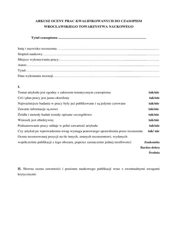 ARKUSZ OCENY PRAC KWALIFIKOWANYCH DO CZASOPISM WROCŁAWSKIEGO TOWARZYSTWA NAUKOWEGO Tytuł czasopisma ................................................................................................... Imię i nazwisko recenzenta: ………………………………………………………..........................… Stopień naukowy………………………………………………………………....................………… Miejsce wykonywania pracy:………………………………………………..........................……….. Autor:……………………………………………………………………............................…………. Tytuł:……………………………………………………………………..............…………………… Data wykonania recenzji………………………………………………...........................……………. I. Temat artykułu jest zgodny z zakresem tematycznym czasopisma tak/nie Cel i plan pracy jest jasno określony tak/nie Najważniejsze badania w pracy były już publikowane i są jedynie cytowane tak/nie Zawarte informacje są nowe tak/nie Źródła i metody badań zostały opisane szczegółowo tak/nie Wniosek jest obiektywny tak/nie Podsumowanie pracy oddaje w pełni zawartość artykułu tak/nie Czy artykuł po wprowadzeniu uwag wymaga ponownego sprawdzenia przez recenzenta tak/ nie Ocena recenzowanej pozycji na tle innych, znanych recenzentowi, wydanych współcześnie publikacji z tego obszaru, poprzez zaznaczenie jednej możliwości: Znakomita Bardzo dobra Średnia II. Słowna ocena zawartości i poziomu naukowego publikacji wraz z ewentualnymi uwagami krytycznymi: