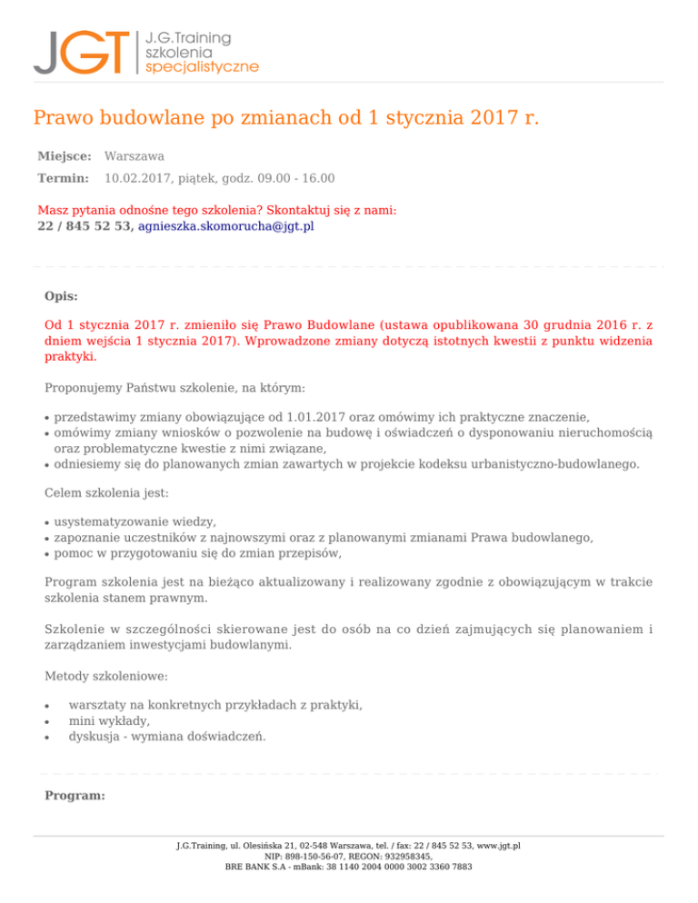 Prawo budowlane po zmianach od 1 stycznia 2017 r. Miejsce: Warszawa Termin: 10.02.2017, piątek, godz. 09.00 - 16.00 Masz pytania odnośne tego szkolenia? Skontaktuj się z nami: 22 / 845 52 53, [email protected] Opis: Od 1 stycznia 2017 r. zmieniło się Prawo Budowlane (ustawa opublikowana 30 grudnia 2016 r. z dniem wejścia 1 stycznia 2017). Wprowadzone zmiany dotyczą istotnych kwestii z punktu widzenia praktyki. Proponujemy Państwu szkolenie, na którym: ● ● ● przedstawimy zmiany obowiązujące od 1.01.2017 oraz omówimy ich praktyczne znaczenie, omówimy zmiany wniosków o pozwolenie na budowę i oświadczeń o dysponowaniu nieruchomością oraz problematyczne kwestie z nimi związane, odniesiemy się do planowanych zmian zawartych w projekcie kodeksu urbanistyczno-budowlanego. Celem szkolenia jest: ● ● ● usystematyzowanie wiedzy, zapoznanie uczestników z najnowszymi oraz z planowanymi zmianami Prawa budowlanego, pomoc w przygotowaniu się do zmian przepisów, Program szkolenia jest na bieżąco aktualizowany i realizowany zgodnie z obowiązującym w trakcie szkolenia stanem prawnym. Szkolenie w szczególności skierowane jest do osób na co dzień zajmujących się planowaniem i zarządzaniem inwestycjami budowlanymi. Metody szkoleniowe: ● ● ● warsztaty na konkretnych przykładach z praktyki, mini wykłady, dyskusja - wymiana doświadczeń. Program: J.G.Training, ul. Olesińska 21, 02-548 Warszawa, tel. / fax: 22 / 845 52 53, www.jgt.pl NIP: 898-150-56-07, REGON: 932958345, BRE BANK S.A - mBank: 38 1140 2004 0000 3002 3360 7883 1. Podsumowanie zmian ustawy Prawo Budowlane w latach 2015 - 2017. 2. Reorganizacja techniczno – formalna zapisów normatywnych Prawa Budowlanego obowiązująca od 1 stycznia 2017 r. 3. Ułatwienia dla realizacji niektórych inwestycji budowlanych: A. Zmiana katalogu prac na zgłoszenie, B. Rozszerzenie katalogu prac zwolnionych z reglamentacji budowlanej, C. Ułatwienia w zakresie przebudowy budynków, D. Nowe terminy dla zgłoszenia sprzeciwu do zgłoszeń budowy, E. Nowa instytucja - Zaświadczenia o braku sprzeciwu przed upływem terminu milczącej zgody. 4. Zmiany w procedurze oddania do użytkowania obiektu budowlanego oraz zmianie sposobu użytkowania obiektu budowlanego. 5. Istotne odstąpienie od projektu budowlanego – doprecyzowanie norm. 6. Ujednolicenia postępowań legalizacyjnych w przypadkach wykonania samowoli budowlanej. 7. Nowe wzory wniosków o pozwolenie na budowę oraz oświadczenia o dysponowaniu nieruchomością na cele budowlane. 8. Najistotniejsze zmiany w ustawach powiązanych dotyczących procesu budowlanego. 9. Kodeks Budowlany – kompleksowa regulacja całego procesu budowlanego: A. Rozwiązania prawne kluczowych instytucji i postępowań, B. Zakres czasowy wprowadzanych zmian. 10. Najnowsze orzecznictwo sądowe w sprawach budowlanych. 11. Odpowiedzi na pytania, dyskusja. Wykładowca: Ekspert w zakresie prawa budowlanego, zagospodarowania przestrzennego oraz nieruchomości. Prawnik, członek Warszawskiej Izby Adwokackiej. Zajmuje się kompleksową obsługą kontraktów budowlanych, reprezentuje firmy z branży budowlanej w sporach dotyczących wykonawstwa robót, doradza, sporządza opinie i ekspertyzy, prowadzi liczne szkolenia. J.G.Training, ul. Olesińska 21, 02-548 Warszawa, tel. / fax: 22 / 845 52 53, www.jgt.pl NIP: 898-150-56-07, REGON: 932958345, BRE BANK S.A - mBank: 38 1140 2004 0000 3002 3360 7883 Miejsce: Miejsce szkolenia zlokalizowane w centrum Warszawy, czas dojazdu tramwajem z Dworca Centralnego - około 5 minut. Na 4 dni robocze przed planowanym terminem szkolenia skontaktujemy się z Państwem i przekażemy szczegółowe informacje na temat lokalizacji szkolenia. Hotele w pobliżu miejsca szkolenia: Hotel Campanile, ul. Towarowa 2, Warszawa Cena noclegu zależy od terminu i wolnych miejsc w Hotelu. Koszt od 279 zł (jedynka ze śniadaniem), tel. 22 582 72 00, http://www.campanile-warszawa.pl/pl Hotel Golden Tulip, ul. Towarowa 2, Warszawa Cena noclegu zależy od terminu i wolnych miejsc w Hotelu. Koszt od 315 zł (jedynka ze śniadaniem), tel. 22 582 75 00, http://www.goldentulipwarsawcentre.com/pl Hotel Premiere Classe, ul. Towarowa 2, Warszawa Cena noclegu zależy od terminu i wolnych miejsc w Hotelu. Koszt od 177 zł (jedynka ze śniadaniem), tel. 22 624 08 00, http://www.premiere-classe-warszawa.pl/pl Cena: 590,00 zł + 23% VAT = 725,70 zł brutto 590,00 zł + VAT zw = 590,00 zł brutto - w przypadku, gdy udział w szkoleniu jest finansowany co najmniej w 70% ze środków publicznych. Cena obejmuje: wykłady, materiały szkoleniowe, serwis kawowy, lunch, certyfikat ukończenia szkolenia, możliwość konsultacji poszkoleniowych. J.G.Training, ul. Olesińska 21, 02-548 Warszawa, tel. / fax: 22 / 845 52 53, www.jgt.pl NIP: 898-150-56-07, REGON: 932958345, BRE BANK S.A - mBank: 38 1140 2004 0000 3002 3360 7883
