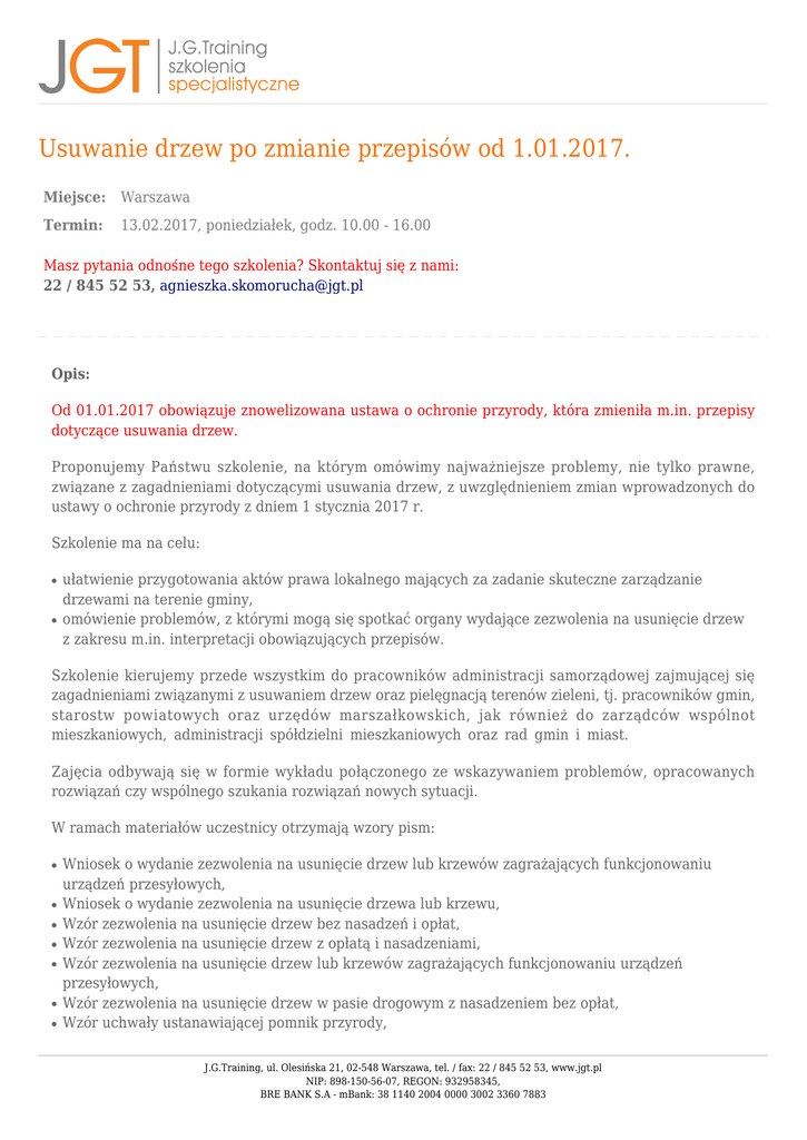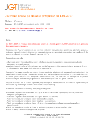 Usuwanie drzew po zmianie przepisów od 1.01.2017. Miejsce: Warszawa Termin: 13.02.2017, poniedziałek, godz. 10.00 - 16.00 Masz pytania odnośne tego szkolenia? Skontaktuj się z nami: 22 / 845 52 53, [email protected] Opis: Od 01.01.2017 obowiązuje znowelizowana ustawa o ochronie przyrody, która zmieniła m.in. przepisy dotyczące usuwania drzew. Proponujemy Państwu szkolenie, na którym omówimy najważniejsze problemy, nie tylko prawne, związane z zagadnieniami dotyczącymi usuwania drzew, z uwzględnieniem zmian wprowadzonych do ustawy o ochronie przyrody z dniem 1 stycznia 2017 r. Szkolenie ma na celu: ● ● ułatwienie przygotowania aktów prawa lokalnego mających za zadanie skuteczne zarządzanie drzewami na terenie gminy, omówienie problemów, z którymi mogą się spotkać organy wydające zezwolenia na usunięcie drzew z zakresu m.in. interpretacji obowiązujących przepisów. Szkolenie kierujemy przede wszystkim do pracowników administracji samorządowej zajmującej się zagadnieniami związanymi z usuwaniem drzew oraz pielęgnacją terenów zieleni, tj. pracowników gmin, starostw powiatowych oraz urzędów marszałkowskich, jak również do zarządców wspólnot mieszkaniowych, administracji spółdzielni mieszkaniowych oraz rad gmin i miast. Zajęcia odbywają się w formie wykładu połączonego ze wskazywaniem problemów, opracowanych rozwiązań czy wspólnego szukania rozwiązań nowych sytuacji. W ramach materiałów uczestnicy otrzymają wzory pism: ● ● ● ● ● ● ● Wniosek o wydanie zezwolenia na usunięcie drzew lub krzewów zagrażających funkcjonowaniu urządzeń przesyłowych, Wniosek o wydanie zezwolenia na usunięcie drzewa lub krzewu, Wzór zezwolenia na usunięcie drzew bez nasadzeń i opłat, Wzór zezwolenia na usunięcie drzew z opłatą i nasadzeniami, Wzór zezwolenia na usunięcie drzew lub krzewów zagrażających funkcjonowaniu urządzeń przesyłowych, Wzór zezwolenia na usunięcie drzew w pasie drogowym z nasadzeniem bez opłat, Wzór uchwały ustanawiającej pomnik przyrody, J.G.Training, ul. Olesińska 21, 02-548 Warszawa, tel. / fax: 22 / 845 52 53, www.jgt.pl NIP: 898-150-56-07, REGON: 932958345, BRE BANK S.A - mBank: 38 1140 2004 0000 3002 3360 7883 ● Spis wybranego orzecznictw. Na szkoleniu udzielimy odpowiedzi m.in. na następujące pytania: ❍ ❍ ❍ ❍ ❍ ❍ ❍ ❍ ❍ ❍ ❍ ❍ ❍ ❍ ❍ ❍ ❍ ❍ ❍ ❍ ❍ ❍ ❍ ❍ ❍ ❍ ❍ ❍ ❍ ❍ ❍ ❍ ❍ Po co należy chronić drzewa? Czy można usuwać drzewa bez zezwoleń? Kto może to robić? Czy osoba fizyczna zawsze może usuwać drzewa bez zezwolenia i ponoszenia opłat? Jeżeli mogę usunąć drzewo bez zezwolenia, to czy muszę brać pod uwagę przepisy z zakresu form ochrony przyrody, np. dotyczące pomników przyrody, parków krajobrazowych, obszarów Natura 2000 czy ochrony gatunkowej? Jakie elementy musi zawierać wniosek i zezwolenie na usunięcie drzew? Czy zgoda właściciela powinna być zawsze dołączana do wniosku? Czy do wniosku zawsze powinien być dołączony plan nasadzeń? Jak powinien wyglądać? Kiedy można usuwać drzewa bez zezwolenia? Czy opłata za usunięcie drzew jest pobierana zawsze? Kiedy można odmówić wydania zezwolenia na usunięcie drzew? Jak ustalać opłatę w przypadku drzew wielopniowych, z których kilka pni ma obwody nie kwalifikujące się do naliczenia opłaty w rozumieniu ustawy? Czy zezwolenie na usunięcie drzew może być przeniesione na inny podmiot? Jak powinna wyglądać procedura wydania zezwolenia na usunięcie drzewa z nieruchomości o nieuregulowanym stanie prawnym? Jak postępować w przypadku, gdy zagrażające upadkiem drzewo rośnie na działce o nieuregulowanym stanie prawnym, co robić w takiej sytuacji? Jak powinna wyglądać procedura w przypadku usuwania drzew z rodzinnych ogrodów działkowych? Nasadzenia zastępcze - jak postąpić, jeśli właściciel sprzedał działkę? Jak określić kompensację przyrodniczą? Czy nasadzenia mogą być w innym miejscu niż usuwane drzewa? Jak postąpić w przypadku nieużytkowanej działki rolnej, na której wyrósł las? Decyzje bez naliczania opłat – czy rekompensatą za usunięcie drzew mogą być krzewy nasadzone w odpowiednich ilościach? Czy i kiedy można zwolnić rolnika z opłaty za wycinkę drzew na gruntach rolnych? Kiedy można usunąć podtopione drzewa z obszaru objętego programem Natura 2000? Jak postępować ze sprawami wszczętymi na starych przepisach? Jak naliczyć karę administracyjną za drzewa usunięte przed wejściem w życie nowych przepisów? Czy zawsze należy nakładać i pobierać kary za usunięcie drzew bez zezwolenia? Jak postępować w sprawie usuwania drzew na gruntach rolnych, objętymi dopłatami? Czy można przycinać gałęzie drzewa, które zacieniają mieszkanie? W jakim zakresie można teraz przycinać koronę drzew? Czy można wydać zezwolenie na usunięcie drzewa, które jest pomnikiem przyrody? Czy można wydać zezwolenie na usunięcie drzewa, na którym są gniazda gawronów? Co powinno być pierwsze: pozwolenie na budowę czy zezwolenie na usunięcie drzew? Jakie ograniczenia w zakresie usuwania drzew może wprowadzić rada gminy? Czy bez zezwolenia będzie można usuwać drzewa na terenach wpisanych do rejestru zabytków? J.G.Training, ul. Olesińska 21, 02-548 Warszawa, tel. / fax: 22 / 845 52 53, www.jgt.pl NIP: 898-150-56-07, REGON: 932958345, BRE BANK S.A - mBank: 38 1140 2004 0000 3002 3360 7883 Program: 1. Wprowadzenie: dlaczego drzewa są tak cenne? Omówienie podstawowych funkcji drzew i krzewów. 2. Omówienie podstawowych definicji, organy wydające zezwolenie na usunięcie drzew. 3. Strony postępowania: spółdzielnie i wspólnoty mieszkaniowe, współwłasność, posiadacz zależny, nieruchomości o nieuregulowanym stanie prawnym. 4. Usuwanie drzew bez zezwolenia: omówienie rozszerzonego katalogu przypadków. 5. Wymogi formalne wniosku o wydanie zezwolenia na usuwanie drzew i