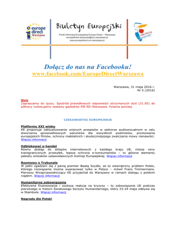 Dołącz do nas na Facebooku! www.facebook.com/EuropeDirectWarszawa Warszawa, 31 maja 2016 r. Nr 5 (2016) Quiz Zapraszamy do quizu. Spośród prawidłowych odpowiedzi otrzymanych dziś (31.05) do północy rozlosujemy zestawy gadżetów PIE ED-Warszawa. Pytanie poniżej. CIEKAWOSTKI EUROPEJSKIE Platformy XXI wieku KE proponuje zaktualizowanie unijnych przepisów w sektorze audiowizualnym w celu stworzenia sprawiedliwszych warunków dla wszystkich podmiotów, promowania europejskich filmów, ochrony małoletnich i skuteczniejszego zwalczania mowy nienawiści. Więcej informacji Odblokować e-handel Równy dostęp do sklepów internetowych z każdego kraju UE, niższe ceny transgranicznych przesyłek, lepsza ochrona e-konsumentów – to główne elementy pakietu wniosków ustawodawczych Komisji Europejskiej. Więcej informacji Rozmowy o Trybunale W pełni zgadzam się z panią premier Beatą Szydło, że to wewnętrzny problem Polski, którego rozwiązanie można wypracować tylko w Polsce – mówił Frans Timmermans. Pierwszy Wiceprzewodniczący KE przyjechał do Warszawy w ramach dialogu z polskim rządem. Więcej informacji Humanitarne zobowiązania Efektywne finansowanie i szybsza reakcja na kryzysy – to zobowiązanie UE podczas pierwszego w historii Światowego Szczytu Humanitarnego, który 23-24 maja odbywa się w Stambule. Więcej informacji Nagroda dla Polski Polskie Centrum bezpieczeństwa ruchu drogowego znalazło się wśród laureatów tegorocznej Nagrody Doskonałości w ramach Europejskiej karty bezpieczeństwa ruchu drogowego. Więcej informacji Papierosy bez smaku! Ostrzeżenia o szkodliwości palenia na 65 proc. powierzchni paczki papierosów, zakaz sprzedaży aromatyzowanych produktów tytoniowych, wycofanie z obrotu paczek mniejszych niż 20 sztuk papierosów - to zmiany, jakie wprowadza Dyrektywa w sprawie wyrobów tytoniowych. Więcej informacji Prawa podstawowe w UE Komisja Europejska opublikowała sprawozdanie ze stosowania Karty praw podstawowych UE za 2015 r., w którym przedstawiła, jakie projekty promujące prawa podstawowe przedłożyła w ubiegłym roku i w jaki sposób uwzględniła postanowienia Karty w swoich pracach ustawodawczych i politycznych. Więcej informacji Zalecenia dla Europy Komisja Europejska przedstawiła proponowane zalecenia dla poszczególnych krajów na 2016 r., w których zawarła wytyczne dotyczące polityki gospodarczej na okres najbliższych 12–18 miesięcy. Więcej informacji Powrót do Schengen Niemcy, Austria, Szwecja, Dania i Norwegia mogą przez najbliższe pół roku utrzymać kontrole graniczne zgodnie z kodeksem Schengen – uznała Komisja Europejska. Więcej informacji Unia celna: prostsza i sprawniejsza 1 maja weszły w życie nowe przepisy prawa celnego. Ułatwią one handel w Europie, a konsumentom zapewnią lepszą ochronę przed nielegalnymi i podrobionymi towarami. Więcej informacji Zmiany w systemie azylowym Powołanie Agencji UE ds. Azylu, wzmocnienie unijnej bazy danych odcisków palców Eurodac, możliwość czasowego wstrzymania udziału państwa członkowskiego w systemie relokacji – to nowe wnioski KE zmierzające w kierunku budowy zrównoważonego i sprawiedliwego systemu azylowego. Więcej informacji Prognoza wzrostu Polska będzie wśród europejskich liderów biorąc pod uwagę tempo gospodarczego – przewiduje wiosenna prognoza gospodarcza. Więcej informacji rozwoju Internet bez barier Strony internetowe instytucji publicznych w UE będą wkrótce dostępne dla osób niepełnosprawnych – niewidomych, niesłyszących i niedosłyszących. Więcej informacji INFORMACJE O AKTUALNIE TRWAJĄCYCH KONKURSACH RPO WM. 2.1 E-usługi. Poddziałanie 2.1.1 E-usługi dla Mazowsza Wsparciem zostaną objęte projekty polegające na wykorzystaniu TIK do obsługi procesów związanych z edukacją na uczelniach wyższych, celem świadczenia usług drogą elektroniczną, aby podnieść dostępność, jakość i efektywność kształcenia w regionie, jak np. rekrutacja przez Internet, czy e-learning. Więcej informacji RPO WM. 5.3 Dziedzictwo kulturowe - typ projektów „Wzrost regionalnego potencjału turystycznego poprzez ochronę obiektów zabytkowych” W ramach konkursu wspierane będą projekty dotyczące: konserwacji, renowacji, rewaloryzacji, modernizacji, adaptacji historycznych obiektów i zespołów zabytkowych wraz z ich otoczeniem, umożliwiające zachowanie dotychczasowych funkcji obiektów zabytkowych, a także służąca nadaniu im nowych funkcji użytkowych (z przeznaczeniem w szczególności na cele kulturalne i edukacyjne), w tym również w połączeniu z działalnością komercyjną, ochrony i zachowania zabytkowych ogrodów i parków. Więcej informacji RPO WM. 3.2 Internacjonalizacja MŚP. Poddziałanie 3.2.2 Modele biznesowe Wsparciem zostaną objęte projekty polegające na internacjonalizacji przedsiębiorstw poprzez wdrożenie nowego modelu biznesowego. Więcej informacji WARSZTATY, KONKURSY, SZKOLENIA Europejskie Wykłady Otwarte Punkt Informacji Europejskiej Europe Direct – Warszawa ma przyjemność zaprosić Państwa do udziału w bezpłatnych Europejskich Wykładach Otwartych dotyczących tematyki europejskiej. Wykłady otwarte mają na celu zwiększenie wiedzy Warszawiaków na temat procesu integracji Polski z Unią Europejską, w tym pozyskiwania środków z jej budżetu. Spotkania odbywają się co drugi tydzień o godz. 16.00 w sali konferencyjnej Centrum Przedsiębiorczości Smolna przy ul. Smolnej 4. Jednocześnie przypominamy, że czwartkowe spotkania wymagają wcześniejszej rejestracji pod adresem: [email protected]. Europejskie Wykłady Otwarte prowadzone są przez Biuro Funduszy Europejskich i Rozwoju Gospodarczego Urzędu m.st. Warszawy. Więcej informacji Konkurs PLF - cenne nagrody! Uczestnicy i koordynatorzy projektów realizowanych ze środków Polsko-Litewskiego Funduszu Młodzieży mogą wziąć udział w konkursach „PL♥LT” oraz „Budując przyjaźń”. Wię