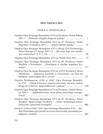 Spis treści 2011 Stolica Apostolska Orędzie Ojca Świętego Benedykta XVI na Światowy Dzień Pokoju 2011 r. – „Wolność religijna drogą do pokoju” ........................... 1 Orędzie Ojca Świętego Benedykta XVI na 97. Światowy Dzień Migranta i Uchodźcy 2011 r. – „Jedna rodzina ludzka” ............ 15 Orędzie Ojca Świętego Benedykta XVI z okazji XIX Światowego Dnia Chorego (11 lutego 2011 r.) – „[Krwią] Jego ran zostaliście uzdrowieni” (1 P 2, 24) ....................................................... 20 Orędzie Ojca Świętego Benedykta XVI na Wielki Post 2011 . ........ 73 Orędzie Ojca Świętego Benedykta XVI na 48. Światowy Dzień Modlitw o Powołania – „Powołania w służbie wspólnot Kościoła” ......................................................................................... 117 Orędzie Ojca Świętego Benedykta XVI na XXVI Światowy Dzień Młodzieży – „Zapuśćcie korzenie w Chrystusie i na Nim się budujcie, umacniajcie się w wierze” .......................................... 121 Orędzie Wielkanocne „Urbi et Orbi” Ojca Świętego Benedykta XVI – „Niech Chrystus zmartwychwstały otworzy ludom drogę do wolności, sprawiedliwości i pokoju” ........................... 130 Orędzie Ojca Świętego Benedykta XVI na Światowy Dzień Misyjny 2011 r. – „Zglobalizowany świat pilnie potrzebuje ewangelizacji” ........................................................................................ 402 Orędzie Ojca Świętego Benedykta XVI na 45. Światowy Dzień Środków Społecznego Przekazu – „Nowe technologie komunikacyjne i głoszenie Ewangelii” ............................................... 406 Orędzie „Urbi et Orbi” 2011 Ojca Świętego Benedykta XVI – „Boskie Dzieciątko przyniosło na świat uniwersalne przesłanie pojednania i pokoju” ...................................................................... 469 532 List apostolski w formie motu proprio „Ubicumque et semper” Papieża Benedykta XVI powołujący do życia Papieską Radę ds. Krzewienia Nowej Ewangelizacji – „Ewangelia zawsze i wszędzie” ................................................................................. 27 List apostolski motu proprio dotyczący zapobiegania nielegalnej działalności w dziedzinie finansowej i monetarnej oraz zwalczania tych zjawisk . ................................................................... 32 List Apostolski w formie motu proprio „Porta fidei” ogłaszający Rok Wiary .................................................................................. 389 Przesłanie na Światowy Dzień Wyżywienia – „Walka z głodem – rozwój oparty na braterstwie” .................................................... 24 Homilia Ojca Świętego Benedykta XVI wygłoszona podczas Mszy św. Krzyżma w Wielki Czwartek 21 IV 2011 r. – „Bądźmy prawdziwymi chrześcijanami, godnymi tego miana” . .............. 133 Homilia Ojca Świętego Benedykta XVI wygłoszona podczas Mszy św. beatyfikacyjnej 1 maja 2011 r. – „Błogosławiony jesteś, umiłowany Janie Pawle II” . ....................................................... 189 Homilia Ojca Świętego Benedykta XVI wygłoszona 18 VIII 2011 r. podczas Liturgii Słowa na Plaza de Cibeles – „Słuchajcie słów Pana, aby były w was «duchem i życiem»” ............................... 249 Homilia Ojca Świętego Benedykta XVI wygłoszona 20 VIII 2011 r. podczas Mszy św. w katedrze Santa Maria la Real de la Almudena – „Słudzy i towarzysze drogi” . ......................................... 252 Homilia Ojca Świętego Benedykta XVI wygłoszona 21 VIII 2011 r. podczas Mszy św. na zakończenie ŚDM na lotnisku Cuatro Vientos – „Świat potrzebuje radości, którą rodzi wiara” . ......... 256 Przemówienie Ojca Świętego Benedykta XVI wygłoszone w Bundestagu 22 IX 2011 r. – „Serce rozumne. Refleksje na temat podstaw prawa” .......................................................................... 410 Homilia Ojca Świętego Benedykta XVI wygłoszona 22 IX 2011 r. w Berlinie – „Wierzymy wraz z całym Kościołem” .................. 416 Homilia Ojca Świętego Benedykta XVI wygłoszona 24 IX 2011 r. w Erfucie – „Świętość nie zna granic i przemienia świat” . ...... 420 533 Homilia Ojca Świętego Benedykta XVI wygłoszona 25 IX 2011 r. we Fryburgu – „Te same dążenia, ta sama miłość i wspólny duch” ... 424 Homilia Ojca Świętego Benedykta XVI wygłoszona 24 XII 2011 r. podczas Pasterki w Bazylice św. Piotra – „Prawdziwa radość i światło Bożego Narodzenia” .................................................... 472 List kard. W. Levady do przewodniczącego KEP w związku z okólnikiem na temat nadużyć seksualnych ze strony duchownych wobec osób nieletnich ................................................................ 138 Okólnik do Konferencji Episkopatów w sprawie opracowania „Wytycznych” dotyczących sposobów postępowania w przypadku nadużyć seksualnych popełnionych przez duchownych wobec osób niepełnoletnich . ................................................................. 139 Przebieg procesu kanonicznego bł. Jana Pawła II ............................ 185 Dekret dotyczący kultu liturgicznego Błogosławionego Jana Pawła II, Papieża ............................................................................... 187 Załącznik do dekretu dotyczącego kultu liturgicznego Błogosławionego Jana Pawła II: kolekta .................................................. 188 Homilia kard. Tarcisia Bertone wygłoszona 2 maja 2011 r. podczas Mszy św. dziękczynnej za beatyfikację – „Wdzięczni Panu za dar świętego Przewodnika na przełomie tysiącleci” . ................ 194 Przemówienie kard. Stanisława Dziwisza wygłoszone podczas Mszy św. dziękczynnej 2 maja 2011 r. ....................................... 198 Kongregacja ds. Kultu Bo