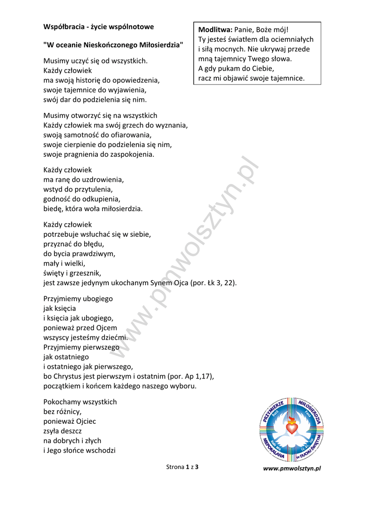 Współbracia - życie wspólnotowe "W oceanie Nieskończonego Miłosierdzia" Musimy uczyć się od wszystkich. Każdy człowiek ma swoją historię do opowiedzenia, swoje tajemnice do wyjawienia, swój dar do podzielenia się nim. Modlitwa: Panie, Boże mój! Ty jesteś światłem dla ociemniałych i siłą mocnych. Nie ukrywaj przede mną tajemnicy Twego słowa. A gdy pukam do Ciebie, racz mi objawić swoje tajemnice. .pl Musimy otworzyć się na wszystkich Każdy człowiek ma swój grzech do wyznania, swoją samotność do ofiarowania, swoje cierpienie do podzielenia się nim, swoje pragnienia do zaspokojenia. lsz tyn Każdy człowiek ma ranę do uzdrowienia, wstyd do przytulenia, godność do odkupienia, biedę, która woła miłosierdzia. pm wo Każdy człowiek potrzebuje wsłuchać się w siebie, przyznać do błędu, do bycia prawdziwym, mały i wielki, święty i grzesznik, jest zawsze jedynym ukochanym Synem Ojca (por. Łk 3, 22). ww w. Przyjmiemy ubogiego jak księcia i księcia jak ubogiego, ponieważ przed Ojcem wszyscy jesteśmy dziećmi. Przyjmiemy pierwszego jak ostatniego i ostatniego jak pierwszego, bo Chrystus jest pierwszym i ostatnim (por. Ap 1,17), początkiem i końcem każdego naszego wyboru. Pokochamy wszystkich bez różnicy, ponieważ Ojciec zsyła deszcz na dobrych i złych i Jego słońce wschodzi Strona 1 z 3 www.pmwolsztyn.pl nad świętymi i grzesznikami (por. Mt 5, 45). Przyjmiemy małego i wielkiego, bo wszyscy jesteśmy mali i wielcy (por. Łk 9, 48) przed Ojcem, dziećmi, braćmi. tyn lsz w. pm wo Oni będą przyjmować nas na wieczną ucztę Królestwa (por. Łk 16, 9), kiedy będąc jednym z nas i jednym z nimi, będziemy jednym z Chrystusem, jednym z Ojcem, w Duchu Świętym. .pl Zaprosimy biednych, kalekich, chromych na ucztę królewską (por. Łk 14, 13-14). Zawołamy pracowników ostatniej godziny, tych, których nikt nie woła (por. Mt 20,6), bo Bóg potrzebuje ich w swojej winnicy... i będzie uczta dla wszystkich. ww Rozpoznamy wtedy, poprzez świadectwo czynów to, czym uczestniczyliśmy ze świadectwem wiary, w pewności, że wszystko to, co zrobiliśmy jednemu z tych najmniejszych, Jemu uczyniliśmy (por. Mt 25, 40). Już teraz kosztujemy nowalijek Królestwa, w zjednoczeniu z biednymi, „ostatnimi”, grzesznymi. Strona 2 z 3 www.pmwolsztyn.pl DZ 2, 42-47 "Trwali oni w nauce Apostołów i we wspólnocie, w łamaniu chleba i w modlitwie. Bojaźń ogarniała każdego, gdyż Apostołowie czynili wiele znaków i cudów. Ci wszyscy, co uwierzyli, przebywali razem i wszystko mieli wspólne. Sprzedawali majątki i dobra i rozdzielali je każdemu według potrzeby. Codziennie trwali jednomyślnie w świątyni, a łamiąc chleb po domach, przyjmowali posiłek z radością i prostotą serca. Wielbili Boga, a cały lud odnosił się do nich życzliwie. Pan zaś przymnażał im codziennie tych, którzy dostępowali zbawienia." ww w. pm wo lsz tyn .pl Modlitwa do Ducha Św. Duchu Święty, Boże, Miłości przedwieczna Ojca i Syna! Racz mi udzielić miłości swojej, abym nią miłował Boga i bliźniego. Udziel mi wesela swego, abym w Tobie tylko szukał pociechy i radował się z łask od Ciebie otrzymywanych. Udziel mi swego pokoju, abym go zachował w stosunkach z Bogiem i z ludźmi. Daj mi cierpliwość, abym wszystkie przykrości zniósł z uległością i łagodnie, bez goryczy i buntu. Natchnij mnie dobrocią swoją, abym był dla bliźnich swoich uczynny, usłużny, uprzejmy, pożyteczny, ku ich radości i zbudowaniu. Obdarz mnie dobroczynnością, abym potrzebom bliźnich chętnie i szybko zaradzał. Udziel mi cierpliwości, abym z rozwagą i roztropnością podejmował się zobowiązań i sumiennie je wypełniał. Obdarz mnie cichością, abym znosił wady i ułomności bliźnich, a wszystkie urazy chętnie darował. Uzbrój mnie w zaufanie, abym był daleki od podejrzliwości względem moich bliźnich i chętnie, szczerze z nimi przestawał. Udziel mi pokory i skromności w myślach, słowach i uczynkach. Udziel mi, proszę, cnoty czystości, abym nigdy świadomie i dobrowolnie nie skalał swej duszy ani swego ciała. Daj, abym był umiarkowany i opanowany we wszystkim, także w pokarmach i napojach, skromny w ubiorze i zachowaniu. Obym cię Boski Gościu mej duszy nigdy nie zasmucił żadnym grzechem, a zwłaszcza odmową miłości. Duchu Święty, Duchu Boży – Przyjdź! Niech Cię błogosławi Pan ! „Bądźmy razem w sercu Boga” Strona 3 z 3 www.pmwolsztyn.pl