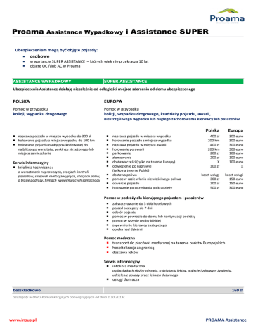 Proama Assistance Wypadkowy i Assistance SUPER Ubezpieczeniem mogą być objęte pojazdy: osobowe w wariancie SUPER ASSISTANCE – których wiek nie przekracza 10 lat objęte OC i\lub AC w Proama ASSISTANCE WYPADKOWY SUPER ASSISTANCE Ubezpieczenia Assistance działają niezależnie od odległości miejsca zdarzenia od domu ubezpieczonego POLSKA EUROPA Pomoc w przypadku Pomoc w przypadku kolizji, wypadku drogowego kolizji, wypadku drogowego, kradzieży pojazdu, awarii, nieszczęśliwego wypadku lub nagłego zachorowania kierowcy lub pasażerów naprawa pojazdu w miejscu wypadku do 300 zł holowanie pojazdu z miejsca wypadku do 100 km holowanie pojazdu osoby poszkodowanej do najbliższego warsztatu, parkingu strzeżonego lub miejsca zamieszkania Serwis informacyjny Infolinia techniczna: o warsztatach naprawczych, stacjach kontroli pojazdów, sklepach motoryzacyjnych, stacjach paliw, o trasie podróży, firmach wynajmujących samochody naprawa pojazdu w miejscu wypadku holowanie pojazdu z miejsca wypadku naprawa pojazdu w miejscu awarii holowanie po awarii parkowanie złomowanie dostawa części (tylko na terenie Europy) odwiezienie po naprawie (tylko na terenie Polski) dostawa paliwa pomoc w razie wlania niewłaściwego paliwa otwarcie pojazdu holowanie po odzyskaniu po kradzieży Polska Europa 400 zł 200 km 400 zł 200 km 200 zł 200 zł X 300 zł 300 euro 300 euro 300 euro 300 euro 100 euro 100 euro 100 euro X koszt usługi 300 zł 200 zł 500 zł koszt usługi 150 euro 150 euro 300 euro Pomoc w podróży dla kierującego pojazdem i pasażerów zakwaterowanie do 3 dób hotelowych pojazd zastępczy do 7 dni odbiór pojazdu pomoc w powrocie do domu lub kontynuacji podróży pomoc w wizycie osoby bliskiej zapewnienie kierowcy zastępczego opieka nad dziećmi Pomoc medyczna transport do placówki medycznej na terenie państw Europejskich hospitalizacja za granicą dostawa leków Serwis informacyjny infolinia medyczna o placówkach służby zdrowia, o działaniu leków, o diecie i zdrowym żywieniu, udzielenie porady przez lekarza dyżurnego usługi tłumacza bezskładkowo 169 zł Szczegóły w OWU Komunikacyjnych obowiązujących od dnia 1.10.2013r. www.insus.pl PROAMA Assistance
