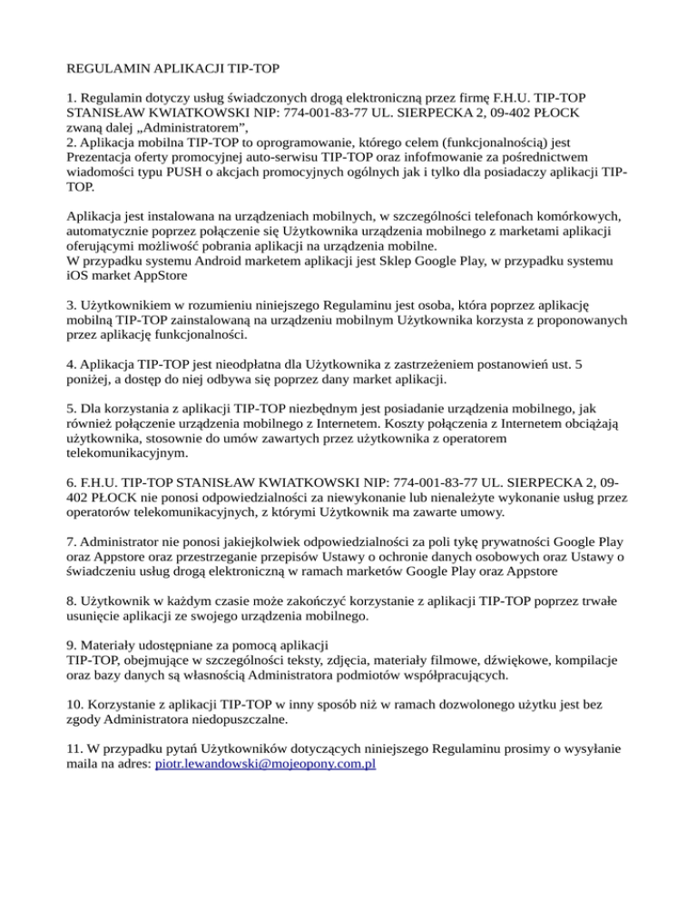 REGULAMIN APLIKACJI TIP-TOP 1. Regulamin dotyczy usług świadczonych drogą elektroniczną przez firmę F.H.U. TIP-TOP STANISŁAW KWIATKOWSKI NIP: 774-001-83-77 UL. SIERPECKA 2, 09-402 PŁOCK zwaną dalej „Administratorem”, 2. Aplikacja mobilna TIP-TOP to oprogramowanie, którego celem (funkcjonalnością) jest Prezentacja oferty promocyjnej auto-serwisu TIP-TOP oraz infofmowanie za pośrednictwem wiadomości typu PUSH o akcjach promocyjnych ogólnych jak i tylko dla posiadaczy aplikacji TIPTOP. Aplikacja jest instalowana na urządzeniach mobilnych, w szczególności telefonach komórkowych, automatycznie poprzez połączenie się Użytkownika urządzenia mobilnego z marketami aplikacji oferującymi możliwość pobrania aplikacji na urządzenia mobilne. W przypadku systemu Android marketem aplikacji jest Sklep Google Play, w przypadku systemu iOS market AppStore 3. Użytkownikiem w rozumieniu niniejszego Regulaminu jest osoba, która poprzez aplikację mobilną TIP-TOP zainstalowaną na urządzeniu mobilnym Użytkownika korzysta z proponowanych przez aplikację funkcjonalności. 4. Aplikacja TIP-TOP jest nieodpłatna dla Użytkownika z zastrzeżeniem postanowień ust. 5 poniżej, a dostęp do niej odbywa się poprzez dany market aplikacji. 5. Dla korzystania z aplikacji TIP-TOP niezbędnym jest posiadanie urządzenia mobilnego, jak również połączenie urządzenia mobilnego z Internetem. Koszty połączenia z Internetem obciążają użytkownika, stosownie do umów zawartych przez użytkownika z operatorem telekomunikacyjnym. 6. F.H.U. TIP-TOP STANISŁAW KWIATKOWSKI NIP: 774-001-83-77 UL. SIERPECKA 2, 09402 PŁOCK nie ponosi odpowiedzialności za niewykonanie lub nienależyte wykonanie usług przez operatorów telekomunikacyjnych, z którymi Użytkownik ma zawarte umowy. 7. Administrator nie ponosi jakiejkolwiek odpowiedzialności za poli tykę prywatności Google Play oraz Appstore oraz przestrzeganie przepisów Ustawy o ochronie danych osobowych oraz Ustawy o świadczeniu usług drogą elektroniczną w ramach marketów Google Play oraz Appstore 8. Użytkownik w każdym czasie może zakończyć korzystanie z aplikacji TIP-TOP poprzez trwałe usunięcie aplikacji ze swojego urządzenia mobilnego. 9. Materiały udostępniane za pomocą aplikacji TIP-TOP, obejmujące w szczególności teksty, zdjęcia, materiały filmowe, dźwiękowe, kompilacje oraz bazy danych są własnością Administratora podmiotów współpracujących. 10. Korzystanie z aplikacji TIP-TOP w inny sposób niż w ramach dozwolonego użytku jest bez zgody Administratora niedopuszczalne. 11. W przypadku pytań Użytkowników dotyczących niniejszego Regulaminu prosimy o wysyłanie maila na adres: [email protected] 12.F.H.U. TIP-TOP STANISŁAW KWIATKOWSKI NIP: 774-001-83-77 UL. SIERPECKA 2, 09-402 PŁOCK zastrzega sobie prawo zmiany niniejszego Regulaminu, o czym Użytkownicy zostaną powiadomieni na 14 dni przed wejściem w życie zmiany, przy czym zmiany w Regulaminie nie mogą naruszać praw nabytych przez posiadaczy Kart Rabatowych przed dokonaniem zmiany. 13. W przypadku braku akceptacji treści zmiany Regulaminu Użytkownikowi przysługuje prawo zakończenia korzystania z aplikacji TIP-TOP poprzez trwałe usunięcie aplikacji ze swojego urządzenia mobilnego. 14. Akceptacja regulaminu aplikacji mobilnej TIP-TOP przez użytkownika jest równoznaczna z akceptacją regulaminu Promocji „5% ZA USŁUGĘ” organizowanej w SERWISACH TIPTOP.