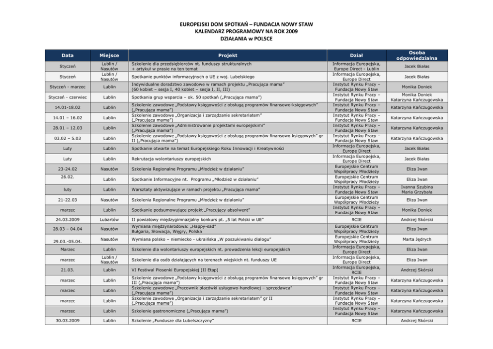 EUROPEJSKI DOM SPOTKAŃ – FUNDACJA NOWY STAW KALENDARZ PROGRAMOWY NA ROK 2009 DZIAŁANIA w POLSCE Data Styczeń Styczeń Miejsce Lublin / Nasutów Lublin / Nasutów Projekt Szkolenie dla przedsiębiorców nt. funduszy strukturalnych + artykuł w prasie na ten temat Spotkanie punktów informacyjnych o UE z woj. Lubelskiego Styczeń - marzec Lublin Indywidualne doradztwo zawodowe w ramach projektu „Pracująca mama” (60 kobiet – sesja I, 40 kobiet – sesja I, II, III) Styczeń - czerwiec Lublin Spotkania grup wsparcia – ok. 50 spotkań („Pracująca mama”) 14.01-18.02 Lublin 14.01 – 16.02 Lublin 28.01 – 12.03 Lublin 03.02 – 5.03 Lublin Luty Lublin Spotkanie otwarte na temat Europejskiego Roku Innowacji i Kreatywności Luty Lublin Rekrutacja wolontariuszy europejskich 23-24.02 Nasutów 26.02. Lublin Szkolenie zawodowe „Podstawy księgowości z obsługą programów finansowo-księgowych” („Pracująca mama”) Szkolenie zawodowe „Organizacja i zarządzanie sekretariatem” („Pracująca mama”) Szkolenie zawodowe „Administrowanie projektami europejskimi” („Pracująca mama”) Szkolenie zawodowe „Podstawy księgowości z obsługą programów finansowo księgowych” gr II („Pracująca mama”) Szkolenia Regionalne Programu „Młodzież w działaniu” Spotkanie Informacyjne nt. Programu „Młodzież w działaniu” luty Lublin 21-22.03 Nasutów marzec Lublin 24.03.2009 Lubartów II powiatowy międzygimnazjalny konkurs pt. „5 lat Polski w UE” Nasutów Wymiana międzynarodowa: „Happy-sad” Bułgaria, Słowacja, Węgry, Polska Nasutów Wymiana polsko – niemiecko - ukraińska „W poszukiwaniu dialogu” 28.03 – 04.04 29.03.-05.04. Warsztaty aktywizujące w ramach projektu „Pracująca mama” Szkolenia Regionalne Programu „Młodzież w działaniu” Spotkanie podsumowujące projekt „Pracujący absolwent” Marzec Lublin marzec Lublin / Nasutów Szkolenie dla wolontariuszy europejskich nt. prowadzenia lekcji europejskich 21.03. Lublin marzec Lublin marzec Lublin marzec Lublin marzec Lublin Szkolenie gastronomiczne („Pracująca mama”) 30.03.2009 Lublin Szkolenie „Fundusze dla Lubelszczyzny” Szkolenie dla osób działających na terenach wiejskich nt. funduszy UE VI Festiwal Piosenki Europejskiej (II Etap) Szkolenie zawodowe „Podstawy księgowości z obsługą programów finansowo księgowych” gr III („Pracująca mama”) Szkolenie zawodowe „Pracownik placówki usługowo-handlowej – sprzedawca” („Pracująca mama”) Szkolenie zawodowe „Organizacja i zarządzanie sekretariatem” gr II („Pracująca mama”) Dział Informacja Europejska, Europe Direct - Lublin Informacja Europejska, Europe Direct Instytut Rynku Pracy – Fundacja Nowy Staw Instytut Rynku Pracy – Fundacja Nowy Staw Instytut Rynku Pracy – Fundacja Nowy Staw Instytut Rynku Pracy – Fundacja Nowy Staw Instytut Rynku Pracy – Fundacja Nowy Staw Instytut Rynku Pracy – Fundacja Nowy Staw Informacja Europejska, Europe Direct Informacja Europejska, Europe Direct Europejskie Centrum Współpracy Młodzieży Europejskie Centrum Współpracy Młodzieży Instytut Rynku Pracy – Fundacja Nowy Staw Europejskie Centrum Współpracy Młodzieży Instytut Rynku Pracy – Fundacja Nowy Staw RCIE Europejskie Centrum Współpracy Młodzieży Europejskie Centrum Współpracy Młodzieży Informacja Europejska, Europe Direct Informacja Europejska, Europe Direct Informacja Europejska, RCIE Instytut Rynku Pracy – Fundacja Nowy Staw Instytut Rynku Pracy – Fundacja Nowy Staw Instytut Rynku Pracy – Fundacja Nowy Staw Instytut Rynku Pracy – Fundacja Nowy Staw RCIE Osoba odpowiedzialna Jacek Białas Jacek Białas Monika Doniek Monika Doniek Katarzyna Kańczugowska Katarzyna Kańczugowska Katarzyna Kańczugowska Katarzyna Kańczugowska Katarzyna Kańczugowska Jacek Białas Jacek Białas Eliza Iwan Eliza Iwan Ivanna Szubina Maria Grzybała Eliza Iwan Monika Doniek Andrzej Skórski Eliza Iwan Marta Jędrych Eliza Iwan Eliza Iwan Andrzej Skórski Katarzyna Kańczugowska Katarzyna Kańczugowska Katarzyna Kańczugowska Katarzyna Kańczugowska Andrzej Skórski EUROPEJSKI DOM SPOTKAŃ – FUNDACJA NOWY STAW KALENDARZ PROGRAMOWY NA ROK 2009 DZIAŁANIA w POLSCE 7.04.2009 Lublin Szkolenie z RPO - fundusze dla przedsiębiorców” 08.04 Lublin Spotkanie Informacyjne dla organizacji zainteresowanych Wolontariatem Europejskim 27.04 Lublin Spotkanie Informacyjne nt. Programu „Młodzież w działaniu” Międzynarodowe szkolenie: „Metody edukacji nieformalnej kluczem do sukcesu w pracy z młodzieżą: Węgry, Hiszpania, Portugalia, Łotwa, Włochy, Polska 2- 8 Maj Nasutów 15-16.04.2009 Lublin „Wybierzmy Europę!” – szkolenie zachęcające do udziału w wyborach 04.2009 Lublin Szkolenie z POKL Spotkanie otwarte – Traktat Lizboński – społeczny wymiar Karty Praw Podstawowych, Prowadzenie lekcji europejskich Wymiana młodzieży „Na śladach historii – nie zapomnieć drugiej wojny, aby uniknąć konfliktów w przyszłości / Kreissportbund Dhame-Spreewald Berlin kwiecień Lublin 18.04.-26.04 Nasutów kwiecień - maj Lublin Kwiecień - sierpień Lublin i okolice 03.05.-10.05. Nasutów 1-9.05. Lublin 2- 8 Maj Nasutów 10.05.-16.05. Nasutów 05.05 Lublin Spotkanie otwarte dla osób zainteresowanych Wolontariatem Europejskim 22-24.05 Lublin Chrześcijański Tydzień Społeczny 13-14.05 Nasutów maj Lublin 22-25.05 Nasutów maj – czerwiec Lublin Maj - czerwiec Lublin 01.10.06 Nasutów czerwiec Lublin 6.06.2009 Lublin 17-18.06 Nasutów 27.06.-05.07. Lublin Rekrutacja uczestników do projektu „Pracujący absolwent” Staże zawodowe u pracodawców w ramach projektu „Pracująca mama” Polsko Polsko – niemiecka wymiana młodzieży ,,Zdjęcia historii” Działania informacyjno -promocyjne związane z pięcioleciem przystąpienia Polski do UE oraz Dniem Europy Międzynarodowe szkolenie: „Metody edukacji nieformalnej kluczem do sukcesu w pracy z młodzieżą: Węgry, 