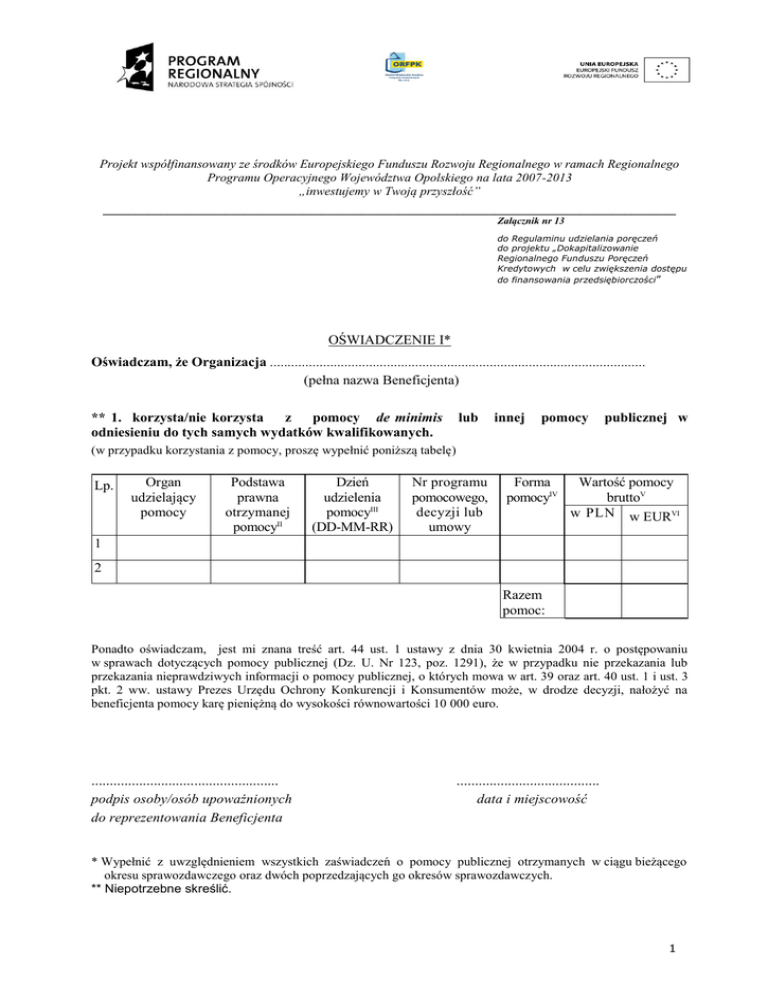 Projekt współfinansowany ze środków Europejskiego Funduszu Rozwoju Regionalnego w ramach Regionalnego Programu Operacyjnego Województwa Opolskiego na lata 2007-2013 „inwestujemy w Twoją przyszłość” _________________________________________________________________________________________ Załącznik nr 13 do Regulaminu udzielania poręczeń do projektu „Dokapitalizowanie Regionalnego Funduszu Poręczeń Kredytowych w celu zwiększenia dostępu do finansowania przedsiębiorczości” OŚWIADCZENIE I* Oświadczam, że Organizacja .......................................................................................................... (pełna nazwa Beneficjenta) ** 1. korzysta/nie korzysta z pomocy de minimis odniesieniu do tych samych wydatków kwalifikowanych. lub innej pomocy publicznej w (w przypadku korzystania z pomocy, proszę wypełnić poniższą tabelę) Lp. Organ udzielający pomocy Podstawa prawna otrzymanej pomocyII Dzień udzielenia pomocyIII (DD-MM-RR) Nr programu pomocowego, decyzji lub umowy Forma pomocyIV Wartość pomocy bruttoV w PLN w EURVI 1 2 Razem pomoc: Ponadto oświadczam, jest mi znana treść art. 44 ust. 1 ustawy z dnia 30 kwietnia 2004 r. o postępowaniu w sprawach dotyczących pomocy publicznej (Dz. U. Nr 123, poz. 1291), że w przypadku nie przekazania lub przekazania nieprawdziwych informacji o pomocy publicznej, o których mowa w art. 39 oraz art. 40 ust. 1 i ust. 3 pkt. 2 ww. ustawy Prezes Urzędu Ochrony Konkurencji i Konsumentów może, w drodze decyzji, nałożyć na beneficjenta pomocy karę pieniężną do wysokości równowartości 10 000 euro. ................................................... podpis osoby/osób upoważnionych do reprezentowania Beneficjenta ....................................... data i miejscowość * Wypełnić z uwzględnieniem wszystkich zaświadczeń o pomocy publicznej otrzymanych w ciągu bieżącego okresu sprawozdawczego oraz dwóch poprzedzających go okresów sprawozdawczych. ** Niepotrzebne skreślić. 1 _________________________________________________________ Pomoc de minimis w rozumieniu art. 2 Rozporządzenia Komisji (WE) nr 1998/2006 z dnia 15 grudnia 2006 r. w sprawie stosowania art. 87 i 88 Traktatu do pomocy de minimis (Dz. Urz. WE L 379/5 z 28.12.2006) oznacza pomoc przyznaną temu samemu podmiotowi gospodarczemu w ciągu bieżącego okresu sprawozdawczego oraz dwóch poprzedzających go okresów sprawozdawczych, która łącznie z pomocą udzieloną na podstawie Wniosku nie przekroczy równowartości 200 000 euro. Wartość pomocy jest wartością brutto, tzn. nie uwzględnia potrąceń z tytułu podatków bezpośrednich. Pułap ten stosuje się bez względu na formę pomocy i jej cel. Udzielenie pomocy de minimis musi być potwierdzone wydaniem zaświadczenia o jej udzieleniu. Zatem Beneficjent powinien wykazać w powyższym oświadczeniu każdą pomoc otrzymaną we wskazanym w oświadczeniu okresie, co do której Beneficjent otrzymał zaświadczenie potwierdzające udzielenie pomocy de minimis. Należy podać pełną podstawę prawną udzielenia pomocy (nazwa aktu prawnego). dzień nabycia przez Beneficjenta prawa do skorzystania z pomocy (dzień podpisania umowy lub wydania decyzji, na podstawie których nastąpiło udzielenie pomocy), a w przypadku gdy udzielenie pomocy w formie ulgi podatkowej następuje na podstawie aktu normatywnego – na zasadach wymienionych w art. 2 pkt.11 lit. a-c ustawy z dnia 30 kwietnia 2004 r. o postępowaniu w sprawach dotyczących pomocy publicznej. Pomocą jest każde wsparcie udzielone ze środków publicznych w szczególności: dotacje, pożyczki, kredyty, gwarancje, poręczenia, ulgi i zwolnienia podatkowe, zaniechanie poboru podatku, odroczenie płatności lub rozłożenie na raty płatności podatku, umorzenie zaległości podatkowej oraz inne formy wsparcia, które w jakikolwiek sposób uprzywilejowują ich beneficjenta w stosunku do konkurentów (katalog form pomocy znajduje się w rozporządzeniu Rady Ministrów z dnia 11 sierpnia 2004 r. w sprawie sprawozdań o udzielonej pomocy publicznej oraz sprawozdań o należnościach przedsiębiorców z tytułu świadczeń na rzecz sektora finansów publicznych (Dz.U. Nr196, poz. 2014)). Należy podać wartość pomocy jako ekwiwalent dotacji, obliczony zgodnie z rozporządzeniem Rady Ministrów z dnia 11 sierpnia 2004 r. w sprawie szczegółowego sposobu obliczania wartości pomocy publicznej udzielanej w różnych formach (Dz. U. Nr 194, poz. 1983 i z 2006 r. Nr 183, poz. 1355), wydanym na podstawie art. 11 ust. 2 ustawy z dnia 30 kwietnia 2004 r. o postępowaniu w sprawach dotyczących pomocy publicznej. Należy podać wartość pomocy w euro ustaloną zgodnie z art. 11 ust. 3 ustawy z dnia 30 kwietnia 2004 r. o postępowaniu w sprawach dotyczących pomocy publicznej (Dz.U. z 2004 r. Nr 123, poz. 1291) - równowartość pomocy w euro ustala się według kursu średniego walut obcych, ogłaszanego przez Narodowy Bank Polski, obowiązującego w dniu udzielenia pomocy (do obliczeń wykorzystujemy kurs euro podany z dokładnością do 4 miejsc po przecinku, po przeliczeniu na złotówki zaokrąglamy do 2 miejsc po przecinku). 2 Pieczęć Beneficjenta OŚWIADCZENIE II* Oświadczam, że Organizacja .......................................................................................................... (pełna nazwa Beneficjenta) ** 1. w ciągu bieżącego okresu sprawozdawczego oraz dwóch poprzedzających go okresów sprawozdawczych otrzymała pomoc de minimis lub inną pomoc publicznąI w następującej wielkości: Lp. Organ udzielający pomocy Podstawa prawna otrzymanej pomocyII Dzień udzielenia pomocyIII (DD-MM-RR) Nr programu pomocowego, decyzji lub umowy Forma pomocyIV Wartość pomocy bruttoV w PLN w EURVI 1. 2. (w razie potrzeby proszę dodać wiersze) Razem pomoc: ** 2. w ciągu bieżącego okresu sprawozdawczego oraz dwóch poprzedzających go okresów sprawozdawczych nie otrzymała pomocy de minimis