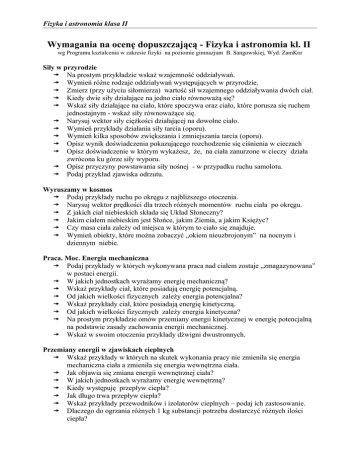 Fizyka i astronomia klasa II Wymagania na ocenę dopuszczającą - Fizyka i astronomia kl. II wg Programu kształcenia w zakresie fizyki na poziomie gimnazjum B. Sangowskiej, Wyd. ZamKor Siły w przyrodzie  Na prostym przykładzie wskaż wzajemność oddziaływań.  Wymień różne rodzaje oddziaływań występujących w przyrodzie.  Zmierz (przy użyciu siłomierza) wartość sił wzajemnego oddziaływania dwóch ciał.  Kiedy dwie siły działające na jedno ciało równoważą się?  Wskaż siły działające na ciało, które spoczywa oraz ciało, które porusza się ruchem jednostajnym - wskaż siły równoważące się.  Narysuj wektor siły ciężkości działającej na dowolne ciało.  Wymień przykłady działania siły tarcia (oporu).  Wymień kilka sposobów zwiększania i zmniejszania tarcia (oporu).  Opisz wynik doświadczenia pokazującego rozchodzenie się ciśnienia w cieczach  Opisz doświadczenie w którym wykażesz, że, na ciała zanurzone w cieczy działa zwrócona ku górze siły wyporu.  Opisz przyczyny powstawania siły nośnej - w przypadku ruchu samolotu.  Podaj przykład zjawiska odrzutu. Wyruszamy w kosmos  Podaj przykłady ruchu po okręgu z najbliższego otoczenia.  Narysuj wektor prędkości dla trzech różnych momentów ruchu ciała po okręgu.  Z jakich ciał niebieskich składa się Układ Słoneczny?  Jakim ciałem niebieskim jest Słońce, jakim Ziemia, a jakim Księżyc?  Czy masa ciała zależy od miejsca w którym to ciało się znajduje.  Wymień obiekty, które można zobaczyć „okiem nieuzbrojonym” na nocnym i dziennym niebie. Praca. Moc. Energia mechaniczna  Podaj przykłady w których wykonywana praca nad ciałem zostaje „zmagazynowana” w postaci energii.  W jakich jednostkach wyrażamy energię mechaniczną?  Wskaż przykłady ciał, które posiadają energię potencjalną.  Od jakich wielkości fizycznych zależy energia potencjalna?  Wskaż przykłady ciał, które posiadają energię kinetyczną.  Od jakich wielkości fizycznych zależy energia kinetyczna?  Na prostym przykładzie omów przemiany energii kinetycznej w energię potencjalną na podstawie zasady zachowania energii mechanicznej.  Wskaż w swoim otoczeniu przykłady dźwigni dwustronnych. Przemiany energii w zjawiskach cieplnych  Wskaż przykłady w których na skutek wykonania pracy nie zmieniła się energia mechaniczna ciała a zmieniła się energia wewnętrzna ciała.  Jak objawia się zmiana energii wewnętrznej ciała?  W jakich jednostkach wyrażamy energię wewnętrzną?  Kiedy występuję przepływ ciepła?  Jak długo trwa przepływ ciepła?  Wskaż przykłady przewodników i izolatorów cieplnych – podaj ich zastosowanie.  Dlaczego do ogrzania różnych 1 kg substancji potrzeba dostarczyć różnych ilości ciepła?