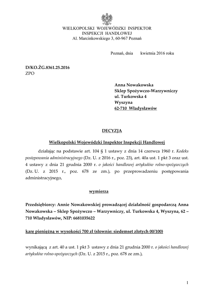 WIELKOPOLSKI WOJEWÓDZKI INSPEKTOR INSPEKCJI HANDLOWEJ Al. Marcinkowskiego 3, 60-967 Poznań Poznań, dnia kwietnia 2016 roku D/KO.ŻG.8361.25.2016 ZPO Anna Nowakowska Sklep Spożywczo-Warzywniczy ul. Turkowska 4 Wyszyna 62-710 Władysławów DECYZJA Wielkopolski Wojewódzki Inspektor Inspekcji Handlowej działając na podstawie art. 104 § 1 ustawy z dnia 14 czerwca 1960 r. Kodeks postępowania administracyjnego (Dz. U. z 2016 r., poz. 23), art. 40a ust. 1 pkt 3 oraz ust. 4 ustawy z dnia 21 grudnia 2000 r. o jakości handlowej artykułów rolno-spożywczych (Dz. U. z 2015 r., poz. 678 ze zm.), po przeprowadzeniu postępowania administracyjnego, wymierza Przedsiębiorcy: Annie Nowakowskiej prowadzącej działalność gospodarczą Anna Nowakowska – Sklep Spożywczo – Warzywniczy, ul. Turkowska 4, Wyszyna, 62 – 710 Władysławów, NIP: 6681035622 karę pieniężną w wysokości 700 zł (słownie: siedemset złotych 00/100) wynikającą z art. 40 a ust. 1 pkt 3 ustawy z dnia 21 grudnia 2000 r. o jakości handlowej artykułów rolno-spożywczych (Dz. U. z 2015 r., poz. 678 ze zm.), 1 z tytułu wprowadzenia do obrotu handlowego w dniu kontroli, tj. w dniu 4 lutego 2016 roku w podległym sklepie spożywczo – przemysłowym LEWIATAN, ul. Turkowska 4, Wyszyna, 62-710 Władysławów, artykułów rolno-spożywczych nieodpowiadających jakości handlowej określonej w przepisach o jakości handlowej, łącznej wartości 165,26 zł. W myśl art. 40 a ust. 1 pkt 3 ustawy z dnia 21 grudnia 2000r. o jakości handlowej artykułów rolno-spożywczych: „kto wprowadza do obrotu artykuły rolno-spożywcze nieodpowiadające jakości handlowej określonej w przepisach o jakości handlowej lub deklarowanej przez producenta w oznakowaniu tych artykułów, podlega karze pieniężnej w wysokości do pięciokrotnej wartości korzyści majątkowej uzyskanej lub która mogłaby zostać uzyskana przez wprowadzenie tych artykułów rolno-spożywczych do obrotu, nie niższej jednak niż 500zł.” Uzasadnienie Podczas kontroli przeprowadzonej przez inspektorów Wojewódzkiego Inspektoratu Inspekcji Handlowej w Poznaniu, Delegatura w Koninie, w dniach od 4 do 10 lutego 2016 roku w sklepie spożywczo – przemysłowym LEWIATAN, ul. Turkowska 4, Wyszyna, 62-710 Władysławów, należącym do przedsiębiorcy Anny Nowakowskiej prowadzącej działalność gospodarczą Anna Nowakowska – Sklep Spożywczo – Warzywniczy, ul. Turkowska 4, Wyszyna, 62 – 710 Władysławów, sprawdzono prawidłowość oznakowania artykułów rolno-spożywczych w stosunku do obowiązujących przepisów. W wyniku przeprowadzonych oględzin zakwestionowano 8 partii artykułów rolno-spożywczych, łącznej wartości 165,26 zł, tj.: • 6 partii artykułów rolno-spożywczych oferowanych do sprzedaży bez opakowań, wartości 110,61, tj: 1) chleb zwykły DOBRA – wg informacji sprzedawcy (brak wywieszki) – 2 szt. wartości 4,70 zł; dowód dostawy z dnia 04.02.2016r. od Zakładu Cukierniczo – Piekarskiego „MARK” TiM Marek Gabryś, 62 – 730 Dobra, Plac Wojska Polskiego 30 (jako: chleb cały), 2) bułka duża 0,1kg - wg informacji sprzedawcy (brak wywieszki) – 10 szt. wartości 8,50 zł; dowód dostawy z dnia 04.02.2016r. od Piekarnia Julian Tomicki, Główna 24, 62-513 Krzymów, 2 nieodpowiadające jakości handlowej z uwagi na niepodanie na wywieszce ani w żaden inny sposób w miejscu dostępnym bezpośrednio konsumentom wymaganych informacji, tj.: − nazwy środka spożywczego wskazanej w sposób określony w art. 17 rozporządzenia Parlamentu Europejskiego i Rady nr 1169/2011 z dnia 25.10.2011 r. w sprawie przekazywania konsumentom informacji na temat żywności, zmiany rozporządzeń Parlamentu Europejskiego i Rady (WE) nr 1924/2006 i (WE) nr 1925/2006 oraz uchylenia dyrektywy Komisji 87/250/EWG, dyrektywy Rady 90/496/EWG, dyrektywy Komisji 1999/10/WE, dyrektywy 2000/13/WE Parlamentu Europejskiego i Rady, dyrektyw Komisji 2002/67/WE i 2008/5/WE oraz rozporządzenia Komisji (WE) nr 608/2004 (Dz. Urz. UE L 304 z 22.11.2011, s. 18 ze zm.) - informacji wymaganej § 19 ust. 1 pkt 1 rozporządzenia Ministra Rolnictwa i Rozwoju Wsi z dnia 23 grudnia 2014 r. w sprawie znakowania poszczególnych rodzajów środków spożywczych (Dz. U. z 2015, poz. 29), tj. nazwy zawierającej opis umożliwiający konsumentom poznanie rzeczywistego charakteru tego środka spożywczego i odróżnienie go od innych produktów tego samego rodzaju poprzez wskazanie np. chleb mieszany, bułka pszenna, − wykazu składników – zgodnie z art. 18-20 rozporządzenia nr 1169/2011, z uwzględnieniem informacji, o których mowa w art. 21 tego rozporządzenia, co jest naruszeniem § 19 ust. 1 pkt 3 oraz ust. 2 ww. rozporządzenia Ministra Rolnictwa i Rozwoju Wsi z dnia 23.12.2014r., − nazwy albo imienia i nazwiska producenta, co jest naruszeniem § 19 ust. 1 pkt 2 ww. rozporządzenia Ministra Rolnictwa i Rozwoju Wsi z dnia 23.12.2014r., − masy jednostkowej, co jest naruszeniem § 19 ust. 1 pkt 6 lit. a) ww. rozporządzenia Ministra Rolnictwa i Rozwoju Wsi z dnia 23.12.2014r. 3) bułka z dynią La Lorraine Polska – wg informacji na wywieszce – 7 szt. wartości 7,70zł; dowód dostawy – faktura VAT z dnia 01.02.2016r. od Przedsiębiorstwo Produkcyjno – Handlowe „IGLOO-MARK” Sp.J. Marek Dudziński – Maria Dudzińska, 87-800 Włocławek, ul. Łęgska 6 - bułka wypiekana na miejscu z ciasta głęboko mrożonego nieodpowiadająca jakości handlowej z uwagi na niepodanie na wywieszce ani w żaden inny sposób w miejscu dostępnym bezpośrednio konsumentom wymaganych informacji, tj.: − nazwy środka spożywczego wskazanej w sposób określony w art. 17 rozporządzenia Parlamentu Europejskiego i Rady nr 1169/2011 z dnia 25.10.2011 r. w sprawie przekazywania konsumentom informacji na temat żywności, 3 zmiany rozporządzeń Parlamentu Europejskiego i Rady (WE) nr 1924/2006 i (WE) nr 1925/2006 oraz uchylenia dyrektywy Komisji 87/250/EWG, dyrekt