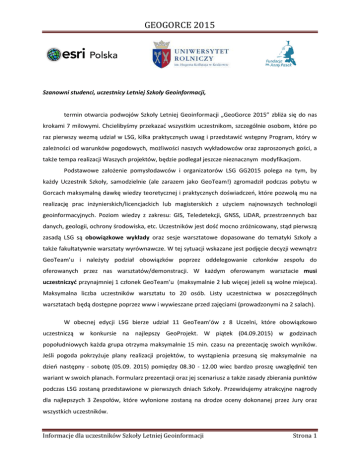 GEOGORCE 2015 Szanowni studenci, uczestnicy Letniej Szkoły Geoinformacji, termin otwarcia podwojów Szkoły Letniej Geoinformacji „GeoGorce 2015” zbliża się do nas krokami 7 milowymi. Chcielibyśmy przekazać wszystkim uczestnikom, szczególnie osobom, które po raz pierwszy wezmą udział w LSG, kilka praktycznych uwag i przedstawić wstępny Program, który w zależności od warunków pogodowych, możliwości naszych wykładowców oraz zaproszonych gości, a także tempa realizacji Waszych projektów, będzie podlegał jeszcze nieznacznym modyfikacjom. Podstawowe założenie pomysłodawców i organizatorów LSG GG2015 polega na tym, by każdy Uczestnik Szkoły, samodzielnie (ale zarazem jako GeoTeam!) zgromadził podczas pobytu w Gorcach maksymalną dawkę wiedzy teoretycznej i praktycznych doświadczeń, które pozwolą mu na realizację prac inżynierskich/licencjackich lub magisterskich z użyciem najnowszych technologii geoinformacyjnych. Poziom wiedzy z zakresu: GIS, Teledetekcji, GNSS, LiDAR, przestrzennych baz danych, geologii, ochrony środowiska, etc. Uczestników jest dość mocno zróżnicowany, stąd pierwszą zasadą LSG są obowiązkowe wykłady oraz sesje warsztatowe dopasowane do tematyki Szkoły a także fakultatywnie warsztaty wyrównawcze. W tej sytuacji wskazane jest podjęcie decyzji wewnątrz GeoTeam’u i należyty podział obowiązków poprzez oddelegowanie członków zespołu do oferowanych przez nas warsztatów/demonstracji. W każdym oferowanym warsztacie musi uczestniczyć przynajmniej 1 członek GeoTeam’u (maksymalnie 2 lub więcej jeżeli są wolne miejsca). Maksymalna liczba uczestników warsztatu to 20 osób. Listy uczestnictwa w poszczególnych warsztatach będą dostępne poprzez www i wywieszane przed zajęciami (prowadzonymi na 2 salach). W obecnej edycji LSG bierze udział 11 GeoTeam’ów z 8 Uczelni, które obowiązkowo uczestniczą w konkursie na najlepszy GeoProjekt. W piątek (04.09.2015) w godzinach popołudniowych każda grupa otrzyma maksymalnie 15 min. czasu na prezentację swoich wyników. Jeśli pogoda pokrzyżuje plany realizacji projektów, to wystąpienia przesuną się maksymalnie na dzień następny - sobotę (05.09. 2015) pomiędzy 08.30 - 12.00 wiec bardzo proszę uwzględnić ten wariant w swoich planach. Formularz prezentacji oraz jej scenariusz a także zasady zbierania punktów podczas LSG zostaną przedstawione w pierwszych dniach Szkoły. Przewidujemy atrakcyjne nagrody dla najlepszych 3 Zespołów, które wyłonione zostaną na drodze oceny dokonanej przez Jury oraz wszystkich uczestników. Informacje dla uczestników Szkoły Letniej Geoinformacji Strona 1 GEOGORCE 2015 Program Szkoły Letniej jest bardzo napięty, ponieważ chcemy przekazać Wam możliwie dużo praktycznych i użytecznych informacji na temat technologii geomatycznych oraz metod prowadzenia projektów naukowych. Kluczem do sukcesu Waszych projektów, będzie przede wszystkim dobra organizacja prac GeoTeam’u oraz zastosowanie się do obowiązujących Reguł Szkoły. Jeśli to możliwe zachęcamy aby przyjechać w Gorce możliwie wcześnie, już w piątek rano by lepiej zapoznawać się z terenem badań, który dla wielu z Was może być nieznany. Szkołę oficjalnie otwieramy w poniedziałek (31.08.2015) o godz. 08.00 - natomiast na poprzedzającą sobotę oraz niedzielę zaplanowane są obowiązkowe warsztaty terenowe połączone z górskimi wędrówkami, pierwsze bardzo ważne wprowadzające obowiązkowe wykłady, warsztaty oraz kursy wyrównawcze. Wykorzystajcie więc każdy moment na wędrówki i wstępny rekonesans w Gorcach oraz zapoznanie się z obiektem badań. W przypadku dobrej pogody warsztaty terenowe rozpoczynamy w sobotę o godz. 09.00. Sprawy techniczne Komputery: - zakładamy, że każdy GeoTeam zabezpieczy się w odpowiednie laptopy minimum 2 na zespół 4 osobowy. Część laptopów (ok. 10 szt.) będzie użyczona przez firmę Esri Polska z zainstalowanym oprogramowaniem ArcGIS (najnowsze wersje) oraz ProGea Consulting (LP360), ale będą one wykorzystywane na warsztatach (wieczorami prawie na pewno będzie istniała możliwość ich użyczenia do prac projektowych); - prosimy by każdy GeoTeem posiadał przenośny HDD USB z najmniej 250 GB wolnej przestrzeni co ułatwi ewentualny transfer danych (pendrive USB nawet 32 GB może być za mały dla wielkoobszarowych projektów); - nie planujemy stworzenia lokalnej sieci komputerowej stąd kopiowanie danych będzie wykonywane w godzinach wieczornych i w przerwach podczas zajęć, by nie tracić cennego czasu. W sali głównej będzie udostępniony PC z danymi, które potrzebne będą do przeprowadzenia warsztatów; - jeśli GeoTeam’y zamierzają wykorzystywać jakieś specyficzne geodane – proszę zabezpieczyć je na własną rękę, np. mapy WIG czy obrazy satelitarne LANDSAT, model ASTER czy SRTM; - w sprawie instalacji najnowszej wersji ArcGIS Esri, ENVI, LP360 (QCoherent) czy innego oprogramowania pojawi się jeszcze odrębny komunikat. Informacje dla uczestników Szkoły Letniej Geoinformacji Strona 2 GEOGORCE 2015 Sprzęt: - trwają jeszcze w tej chwili rozmowy o użyczenie na czas obozu sprzętu od naszych sponsorów czy partnerów LSG, o który trzeba się będzie szczególnie zatroszczyć; - jeśli istnieje taka możliwość prosimy przywieźć ze sobą odbiorniki GPS (nawet turystyczne), aparaty cyfrowe i inny specyficzny sprzęt; - staramy się o wypożyczenie skanerów TLS czy dronów na czas LSG. GeoDane: - każdy zespół zobowiązany jest do samodzielnego pozyskania potrzebnych geodanych do realizacji założonych projektów. Jest to elementem realizacji projektu, za co zespół otrzymuje dodatkowe punkty. W sytuacji braku danych postaramy się je zabezpieczyć (już bez dodatkowych punktów). W tej kwestii wysyłany był odrębny komunikat. - na czas trwania Szkoły użyczone zostaną komercyjne zobrazowania satelitarne ale wyłącznie do celów szkoleniowych LSG i