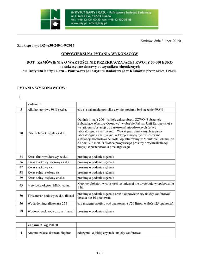 Kraków, dnia 3 lipca 2015r. Znak sprawy: DZ-A30-240-1-9/2015 ODPOWIEDZI NA PYTANIA WYKONACÓW DOT. ZAMÓWIENIA O WARTOŚCI NIE PRZEKRACZAJĄCEJ KWOTY 30 000 EURO na sukcesywne dostawy odczynników chemicznych dla Instytutu Nafty i Gazu – Państwowego Instytutu Badawczego w Krakowie przez okres 1 roku. PYTANIA WYKONAWCÓW: 1. Zadanie 1 Alkohol etylowy 98% cz.d.a. czy nie zaistniała pomyłka czy nie powinno być stężenie 99,8% 20 Czterochlorek węgla cz.d.a. Od dnia 1 maja 2004 istnieje zakaz obrotu SZWO (Substancje Zubażające Warstwę Ozonową) w obrębie Państw Unii Europejskiej z wyjątkiem substancji do zastosowań nieodzownych (prace laboratoryjne i analityczne). Wykaz prac uznawanych za prace laboratoryjne i analityczne, w których mogą być zastosowane substancje kontrolowane został opublikowany w Monitorze Polskim Nr 22 poz. 396 z 2002r Wobec powyższego prosimy o wykreślenie tej pozycji z postępowania przetargowego 34 Kwas fluorowodorowy cz.d.a. prosimy o podanie stężenia 36 Kwas siarkowy stężony cz.d.a. prosimy o podanie stężenia 37 Kwas siarkowy cz. prosimy o podanie stężenia 38 Kwas solny stężony cz prosimy o podanie stężenia 39 Kwas solny stężony cz.d.a. prosimy o podanie stężenia 43 Metyloetyloketon MEK techn. Metyloetyloketon w czystości technicznej nie występuje w opakowaniu 1 litr 50 Tiosiarczan sodowy cz.d.a. fiksnal prosimy o podanie stężenia oraz o odpowiedź czy należy zaoferować 10szt a nie 10 opakowań 56 Woda demineralizowana 25 l czy możemy zaoferować opakowanie a'20 litrów w ilości 25 opakowań 59 Wodorotlenek sodu cz.d.a. fiksnal prosimy o podanie stężenia 5 Zadanie 2 wg POCH 4 Amonu, żelaza siarczan 6hydrat odczynnik o jakiej czystości należy zaoferować 1/3 10 Kwas octowy 86%cz.d.a czy nie zaistniała pomyłka ponieważ nie znajdujemy kwasu octowego o stężeniu 86% 13 Kwas siarkowy stężony cz.d.a. prosimy o podanie stężenia 14 Kwas solny stężony cz.d.a. prosimy o podanie stężenia 19 Potasu chromian odczynnik o jakiej czystości należy zaoferować 20 Potasu dichromian odczynnik o jakiej czystości należy zaoferować 23 Srebra azotan odczynnik o jakiej czystości należy zaoferować 2. Czy Zamawiający wyrazi zgodę na wykreślenie pozycji 6 (produkt firmy JT Baker) z części, w której znajdują się odczynniki firmy Sigma-Aldrich? 3. zad 2 poz 26 Brak żelaza 3 hydrat , prosimy o odpowiedź który z poniższych odczynników należy zaoferować? Żelaza (III) chlorek 6 . hydrat CZDA, ODCZ. FP op. 500 g Żelaza (II) chlorek 4 . hydrat CZDA, ODCZ. FP op. 250 g ODPOWIEDZI ZAMAWIAJĄCEGO: 1. Zadanie 1 5 Alkohol etylowy 98% cz.d.a. Należy zaoferować stężenie 96% 20 Czterochlorek węgla cz.d.a. Pozycję należy wykreślić i jej nie wyceniać. 34 Kwas fluorowodorowy cz.d.a. Stężenie 40% 36 Kwas siarkowy stężony cz.d.a. Stężenie 95% 37 Kwas siarkowy cz. Stężenie 69% 38 Kwas solny stężony cz Stężenie 35-38% 39 Kwas solny stężony cz.d.a. Stężenie 35-38% 43 Metyloetyloketon MEK techn. Można zaoferować 5L (6 szt.) 50 Tiosiarczan sodowy cz.d.a. fiksnal 0,1 mol/l; Należy zaoferować 10 szt. 56 Woda demineralizowana 25 l Tak, Wykonawca może zaoferować opakowanie a'20 litrów w ilości 25 opakowań 2/3 59 Wodorotlenek sodu cz.d.a. fiksnal 0,1 mol/l Zadanie 2 wg POCH 4 Amonu, żelaza siarczan 6hydrat czda 10 Kwas octowy 86%cz.d.a Należy zaoferować 80% 13 Kwas siarkowy stężony cz.d.a. Min. 95% 14 Kwas solny stężony cz.d.a. Stężenie 35-38% 19 Potasu chromian Czda 20 Potasu dichromian Czda 23 Srebra azotan Czda 2. Zamawiający nie wyraża zgody na wykreślenie poz. 6. Jednocześnie przypominamy, że Zamawiający dopuszcza wszelkie odpowiedniki rynkowe nie gorsze niż wskazane. Ponadto zwracamy uwagę, że Zamawiający oczekuje przedstawienia oferty na wszystkie pozycje wymienione w całym zał. 2 (bez podziału na części). 3. Należy zaoferować: Żelaza (III) chlorek 6 . hydrat CZDA, ODCZ. FP op. 500 g 3/3