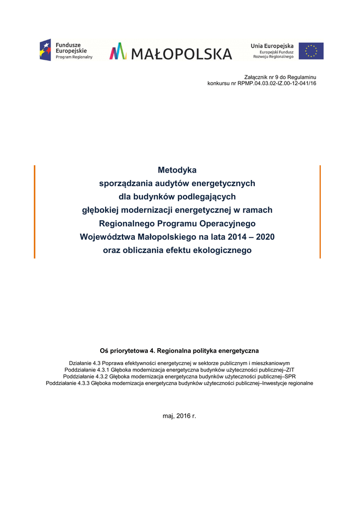 Załącznik nr 9 do Regulaminu konkursu nr RPMP.04.03.02-IZ.00-12-041/16 Metodyka sporządzania audytów energetycznych dla budynków podlegających głębokiej modernizacji energetycznej w ramach Regionalnego Programu Operacyjnego Województwa Małopolskiego na lata 2014 – 2020 oraz obliczania efektu ekologicznego Oś priorytetowa 4. Regionalna polityka energetyczna Działanie 4.3 Poprawa efektywności energetycznej w sektorze publicznym i mieszkaniowym Poddziałanie 4.3.1 Głęboka modernizacja energetyczna budynków użyteczności publicznej–ZIT Poddziałanie 4.3.2 Głęboka modernizacja energetyczna budynków użyteczności publicznej–SPR Poddziałanie 4.3.3 Głęboka modernizacja energetyczna budynków użyteczności publicznej–Inwestycje regionalne maj, 2016 r. Regionalny Program Operacyjny Województwa Małopolskiego na lata 2014-2020 Spis treści 1. Wstęp……………………………………………………………………………………….…….…3 1.1. Wymogi programowe ……………………………………………….…………….…………3 1.2. Wymogi techniczne ……………………………………………………………………….…4 2. Metodyka sporządzania audytu energetycznego dla budynku użyteczności publicznej (załącznik do wniosku o dofinansowanie)…………………………………………………....…6 3. Zestawienia zbiorcze dla projektów kompleksowych (wiele budynków) (załącznik do wniosku o dofinansowanie)………………………………………………………38 4. Obliczanie efektu ekologicznego……………………………………………….……………….41 4.1. Emisja gazów cieplarnianych………………………………………………………………41 4.2. Emisja pyłów…………………………………………………………………………………42 2 Regionalny Program Operacyjny Województwa Małopolskiego na lata 2014-2020 1. Wstęp Celem niniejszego dokumentu jest zapewnienie jednolitego opracowywania i przedstawiania przez Wnioskodawców danych wymaganych do prawidłowego przygotowania wniosku o dofinansowanie w ramach Działania 4.3 Poprawa efektywności energetycznej w sektorze publicznym i mieszkaniowym oraz Poddziałań: • 4.3.1 Głęboka modernizacja energetyczna budynków użyteczności publicznej – ZIT • 4.3.2 Głęboka modernizacja energetyczna budynków użyteczności publicznej – SPR • 4.3.3 Głęboka modernizacja energetyczna budynków użyteczności publicznej – Inwestycje regionalne Opracowanie to dotyczy przede wszystkim wymogów stawianych w zakresie: • Audytu energetycznego – obowiązkowego załącznika do wniosku o dofinansowanie, • Wskaźników rezultatu bezpośredniego – wymaganych do wprowadzenia do wniosku o dofinansowanie, • Efektu ekologicznego – w kontekście wymogów stawianych na etapie oceny projektów oraz wprowadzanych wskaźników rezultatu bezpośredniego do wniosku o dofinansowanie, • Prezentowania zestawień zbiorczych dla projektu - w odniesieniu do projektów w ramach, których modernizacji energetycznej podlega więcej niż jeden budynek. Wymagane jest przedstawienie wyników audytów opracowanych dla każdego budynku oddzielnie w ramach zbiorczych zestawień. 1.1 Wymogi programowe w Poddziałaniach (4.3.1, 4.3.2, 4.3.3) dotyczące głębokiej modernizacji energetycznej budynków użyteczności publicznej Audyt energetyczny: a) Audyt energetyczny sporządza się zgodnie z wymogami metodyki opisanej w rozdziale 2 Metodyka sporządzania audytu energetycznego. b) Audyt energetyczny jest obowiązkowym załącznikiem do wniosku o dofinansowanie i powinien być opracowany dla każdego budynku będącego elementem projektu finansowanego w ramach Działania 4.3 Poprawa efektywności energetycznej w sektorze publicznym i mieszkaniowym (Poddziałania 4.3.1, 4.3.2, 4.3.3). W przypadku projektów kompleksowych w ramach których modernizacji energetycznej podlega kilka budynków audyt jest opracowywany dla każdego z nich. Dodatkowo dla tego rodzaju projektów Wnioskodawca załącza do wniosku o dofinansowanie zestawienie zbiorcze z wyników opracowanych audytów (zgodnie z rozdziałem 3). c) Obowiązek realizacji w projekcie pełnego zakresu rzeczowego ujętego w wybranym w audycie optymalnym wariancie dla przedsięwzięcia. d) Podczas opracowywania audytu należy mieć na uwadze, liczne wymogi stawiane projektom z zakresu modernizacji energetycznej budynków ujęte w Szczegółowym Opisie Osi Priorytetowych (np. warunki dostępowe, kryteria oceny projektów, wskaźniki rezultatu bezpośredniego). e) Poprawa efektywności energetycznej o co najmniej 25% w odniesieniu do projektu – warunek dostępowy. Efekt ekologiczny: a) Redukcji emisji pyłów – obliczana dla projektu w kontekście wymogów stawianych na etapie oceny projektów (kryterium oceny merytorycznej: Wpływ projektu na redukcje emisji pyłów) i opisywana przez Wnioskodawcę we wniosku o dofinansowanie (rozdział 4.2). 3 Regionalny Program Operacyjny Województwa Małopolskiego na lata 2014-2020 b) Redukcja emisji gazów cieplarnianych (CO2) – będąca warunkiem dostępowym dla projektu oraz dodatkowo oceniana na etapie oceny projektów, jako kryterium punktowe (kryterium oceny merytorycznej: Redukcja emisji CO2). Dodatkowo planowane do osiągnięcia wartości są konieczne do przedstawienia, jako wskaźnik rezultatu bezpośredniego przyjmowanego we wniosku o dofinansowanie (Szacowany roczny spadek emisji gazów cieplarnianych) (rozdział 4.1). c) Warunek dostępowy: Redukcja emisji CO2 o co najmniej 30% w przypadku wymiany istniejącego źródła ciepła w odniesieniu do istniejącej instalacji. Warunek będzie dotyczyć projektów w których planowana jest wymiana źródła ciepła, w tym zmiana stosowanego paliwa w piecach indywidualnych, wprowadzenie mikrokogeneracji lub wysokosprawnej kogeneracji. Wskaźniki rezultatu bezpoś