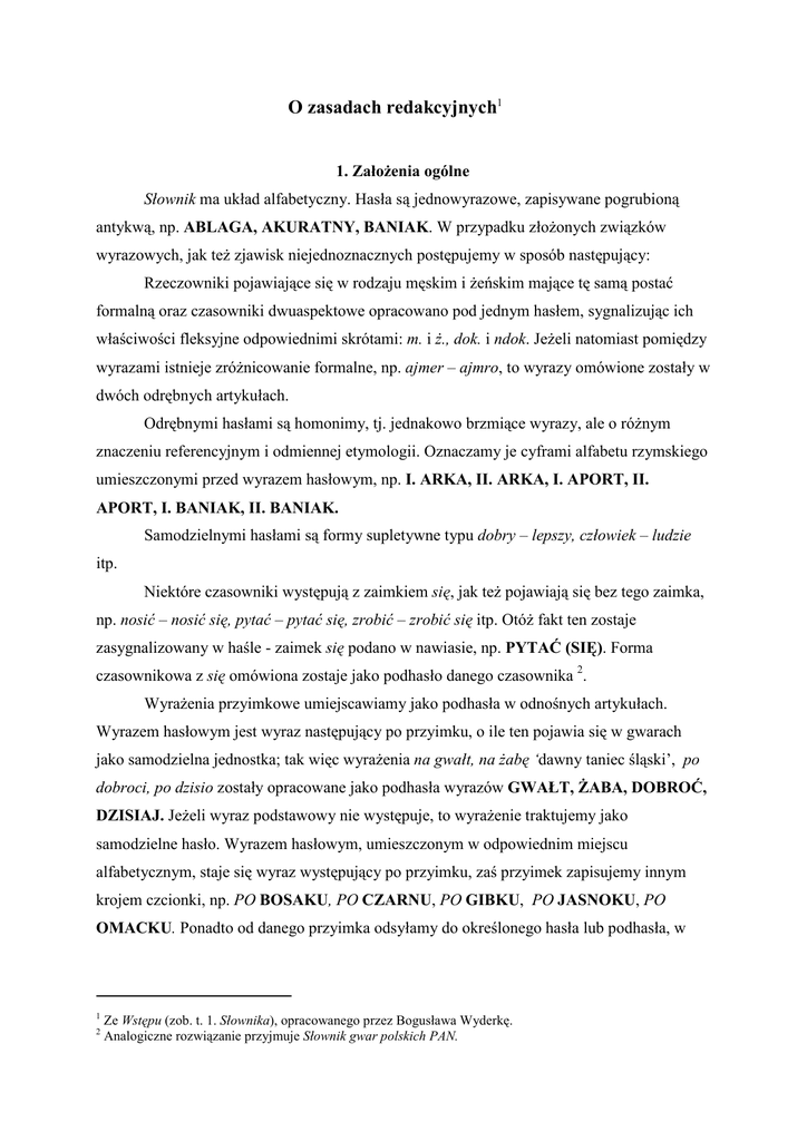 O zasadach redakcyjnych1 1. Założenia ogólne Słownik ma układ alfabetyczny. Hasła są jednowyrazowe, zapisywane pogrubioną antykwą, np. ABLAGA, AKURATNY, BANIAK. W przypadku złożonych związków wyrazowych, jak też zjawisk niejednoznacznych postępujemy w sposób następujący: Rzeczowniki pojawiające się w rodzaju męskim i żeńskim mające tę samą postać formalną oraz czasowniki dwuaspektowe opracowano pod jednym hasłem, sygnalizując ich właściwości fleksyjne odpowiednimi skrótami: m. i ż., dok. i ndok. Jeżeli natomiast pomiędzy wyrazami istnieje zróżnicowanie formalne, np. ajmer – ajmro, to wyrazy omówione zostały w dwóch odrębnych artykułach. Odrębnymi hasłami są homonimy, tj. jednakowo brzmiące wyrazy, ale o różnym znaczeniu referencyjnym i odmiennej etymologii. Oznaczamy je cyframi alfabetu rzymskiego umieszczonymi przed wyrazem hasłowym, np. I. ARKA, II. ARKA, I. APORT, II. APORT, I. BANIAK, II. BANIAK. Samodzielnymi hasłami są formy supletywne typu dobry – lepszy, człowiek – ludzie itp. Niektóre czasowniki występują z zaimkiem się, jak też pojawiają się bez tego zaimka, np. nosić – nosić się, pytać – pytać się, zrobić – zrobić się itp. Otóż fakt ten zostaje zasygnalizowany w haśle - zaimek się podano w nawiasie, np. PYTAĆ (SIĘ). Forma czasownikowa z się omówiona zostaje jako podhasło danego czasownika 2. Wyrażenia przyimkowe umiejscawiamy jako podhasła w odnośnych artykułach. Wyrazem hasłowym jest wyraz następujący po przyimku, o ile ten pojawia się w gwarach jako samodzielna jednostka; tak więc wyrażenia na gwałt, na żabę ‘dawny taniec śląski’, po dobroci, po dzisio zostały opracowane jako podhasła wyrazów GWAŁT, ŻABA, DOBROĆ, DZISIAJ. Jeżeli wyraz podstawowy nie występuje, to wyrażenie traktujemy jako samodzielne hasło. Wyrazem hasłowym, umieszczonym w odpowiednim miejscu alfabetycznym, staje się wyraz występujący po przyimku, zaś przyimek zapisujemy innym krojem czcionki, np. PO BOSAKU, PO CZARNU, PO GIBKU, PO JASNOKU, PO OMACKU. Ponadto od danego przyimka odsyłamy do określonego hasła lub podhasła, w 1 2 Ze Wstępu (zob. t. 1. Słownika), opracowanego przez Bogusława Wyderkę. Analogiczne rozwiązanie przyjmuje Słownik gwar polskich PAN. którym omówione zostało konkretne wyrażenie, czyli na końcu artykułu NA czy PO umieszczamy odesłanie: zob. NA UDRY, PO JASNOKU, GWAŁT, ŻABA itp. Podobna zasada opracowania dotyczy zestawień i złożonych zaimków przymiotnikowych i przysłówkowych. Zostały one umieszczone jako podhasła w artykułach, których wyrazami hasłowymi są człony konstytutywne (nadrzędne) tych grup. Przykładowo, zestawienia dziwoka świnia, grochowa zupa, wielka izba opracowane zostały w artykułach ŚWINIA, ZUPA, IZBA. Zestawienia byle kaj, ten sam odpowiednio pod hasłami KAJ, TEN. Przy czym na końcu artykułu z wyrazem, który w zestawieniu pełni funkcję członu określającego, znajduje się odesłanie do odpowiedniego hasła, np. przy dziwoki zob. ŚWINIA, przy grochowy zob. ZUPA, przy wielki zob. IZBA. Związki frazeologiczne odnotowujemy w odrębnym ustępie artykułu hasłowego, poprzedzonym kwalifikatorem Fraz. O szczegółowych zasadach opracowania frazeologizmów jest mowa niżej, w podrozdziale Związki frazeologiczne. Wielowyrazowe wykrzykniki i mętowania traktujemy podobnie jak Słownik gwar polskich PAN, to jest każdy element zestawienia występuje pod odrębnym hasłem bez odsyłacza, człony mające znaczenie znajdują się w odpowiednich artykułach. Wielowyrazowe połączenia pełniące funkcję syntaktyczną bądź ekspresywną, złożone spójniki, partykuły, jak np. a dyć, a jak itp. potraktowane zostały jako podhasła i zamieszczane pod hasłami odpowiadającymi komponentom połączeń (bez wzajemnych odsyłaczy). 2. Budowa artykułu hasłowego Artykuł hasłowy ma następującą strukturę: 1. Hasło (ewentualnie poprzedzone numerem homonimu). 2. Dział form wprowadzany tytułem Formy. Dział ten pojawia się w zależności od potrzeb, zagadnienia związane z zakresem i sposobem prezentowania form wyrazów omawiamy poniżej w odrębnym podrozdziale. Część fonetyczną działu od części fleksyjnej oddziela znak ♦. 3. Dział znaczeń sygnalizowany skrótem Znacz. 4. Ustęp poświęcony frazeologizmom, wprowadzany kwalifikatorem Fraz. Dział ten pojawia się w zależności od potrzeb. 5. Po dziale znaczeń lub po omówieniu frazeologizmów pojawić się może podhasło. 6. Elementem fakultatywnym jest informacja o pochodzeniu wyrazu. Poprzedzona jest ona znakiem . 7. Na końcu artykułu z reguły pojawia się odsyłacz do synonimu, poprzedzone on jest symbolem . O zasadach opracowania synonimiki zob. podrozdział Odsyłacze do synonimów. 8. Rzadziej pojawiającym się elementem artykułu jest akapit, w którym podawane są dodatkowe informacje o funkcjonowaniu wyrazu. Podajemy tu, jeżeli pozwala i wymaga tego materiał, niezbędne wyjaśnienia dotyczące specyfiki i pragmatyki wyrazu, uogólnienia o zasięgu geograficznym, o niewystępowaniu wyrazu na określonym terenie, o wycofaniu się germanizmu itp. Informacje te podajemy w odrębnym ustępie artykułu, zasygnalizowanym znakiem . W części dokumentacyjnej każdej całostki kompozycyjnej podstawowym znakiem delimitacyjnym jest średnik. Oddziela on od siebie kolejne jednostki dokumentacyjne: cytaty, lokalizacje, źródła, np. D. lp. m aportu Koszarzyska mist RCzes [SGP PAN]; Brenna ciesz; Puńców ciesz [SGP PAN]; Zabrzeg biel; Gierałtowice koz; Kujakowice klucz. Natomiast przecinek pojawia się jako znak rozdzielający wewnątrz jednostki, na przykład oddziela miejscowości leżące w granicach tego samego powiatu czy też poświadczenia pochodzące z tego samego źródła. W ten sposób unikamy częstego powtarzania tych samych informacji. Por. xaptykO;\ xaptykO;\ Kościeliska ol; Dzierżysławice, Przechód, Sowin nys. Nazwy miejscow