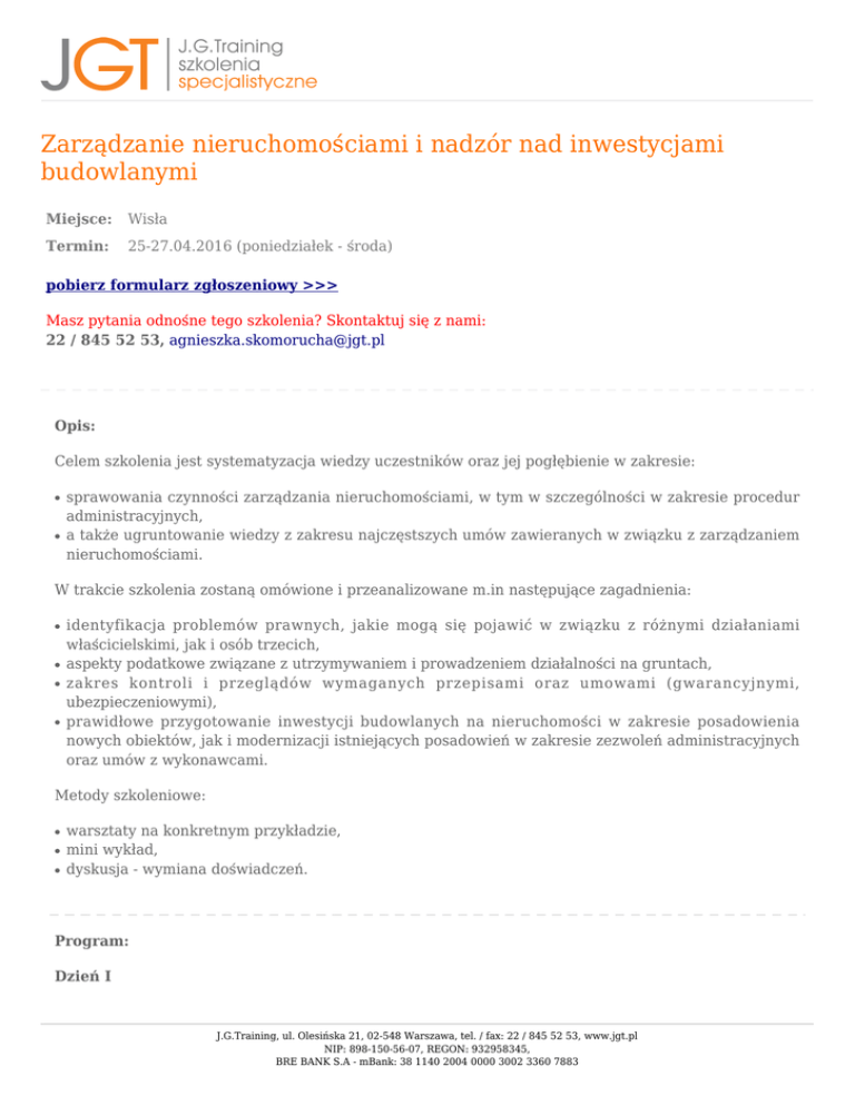 Zarządzanie nieruchomościami i nadzór nad inwestycjami budowlanymi Miejsce: Wisła Termin: 25-27.04.2016 (poniedziałek - środa) pobierz formularz zgłoszeniowy >>> Masz pytania odnośne tego szkolenia? Skontaktuj się z nami: 22 / 845 52 53, [email protected] Opis: Celem szkolenia jest systematyzacja wiedzy uczestników oraz jej pogłębienie w zakresie: ● ● sprawowania czynności zarządzania nieruchomościami, w tym w szczególności w zakresie procedur administracyjnych, a także ugruntowanie wiedzy z zakresu najczęstszych umów zawieranych w związku z zarządzaniem nieruchomościami. W trakcie szkolenia zostaną omówione i przeanalizowane m.in następujące zagadnienia: ● ● ● ● identyfikacja problemów prawnych, jakie mogą się pojawić w związku z różnymi działaniami właścicielskimi, jak i osób trzecich, aspekty podatkowe związane z utrzymywaniem i prowadzeniem działalności na gruntach, zakres kontroli i przeglądów wymaganych przepisami oraz umowami (gwarancyjnymi, ubezpieczeniowymi), prawidłowe przygotowanie inwestycji budowlanych na nieruchomości w zakresie posadowienia nowych obiektów, jak i modernizacji istniejących posadowień w zakresie zezwoleń administracyjnych oraz umów z wykonawcami. Metody szkoleniowe: ● ● ● warsztaty na konkretnym przykładzie, mini wykład, dyskusja - wymiana doświadczeń. Program: Dzień I J.G.Training, ul. Olesińska 21, 02-548 Warszawa, tel. / fax: 22 / 845 52 53, www.jgt.pl NIP: 898-150-56-07, REGON: 932958345, BRE BANK S.A - mBank: 38 1140 2004 0000 3002 3360 7883 Przed godz. 11.00 - przyjazd uczestników i zameldowanie w hotelu. Godz. 11.00 – 17.00 – szkolenie. W trakcie zajęć przerwa na obiad. PROGRAM SZKOLENIA DZIEŃ I I. Systematyzacja norm prawnych dotyczących zarządzania nieruchomościami. II. Regulacja stanu prawnego nieruchomości: 1. 2. 3. 4. 5. 6. Księga wieczysta – podstawowy rejestr danych o stanie prawnym nieruchomości. Formy władania nieruchomościami – zakres uprawnień. Służebności – ustanawianie i znoszenie. Hipoteki – podstawy wpisu i ich wykreślanie. Jakie inne dokumenty mogą opisywać stan prawny nieruchomości? Dysponowanie nieruchomością na cele budowlane. III. Katastr nieruchomości: 1. Zakres danych ujawnianych w ewidencji gruntów i budynków. 2. Charakter prawny danych z ewidencji. 3. Postępowania aktualizacyjne odnośnie danych ujawnianych w katastrze oraz ich konsekwencje. IV. Jak podzielić nieruchomość? 1. Geodezyjny podział i scalenie nieruchomości na działki ewidencyjne. 2. Zasady dotyczące podziału nieruchomości. V. Kwalifikacja gruntów na potrzeby podatków rolnych i lokalnych: 1. Czym się różni odrolnienie od wyłączenia gruntu z produkcji rolnej? VI. Planowanie przestrzenne – możliwości zagospodarowania działki: 1. Akty prawne reglamentujące możliwości inwestycyjne. 2. Miejscowe plany zagospodarowanie przestrzennego – struktura oraz zakres. 3. Decyzji indywidualne – ulcp i wz. Godz. 20.00 – kolacja. Dzień II Godz. 07.00 - 09.00 – śniadanie. J.G.Training, ul. Olesińska 21, 02-548 Warszawa, tel. / fax: 22 / 845 52 53, www.jgt.pl NIP: 898-150-56-07, REGON: 932958345, BRE BANK S.A - mBank: 38 1140 2004 0000 3002 3360 7883 Godz. 09.00 – 15.30 – szkolenie. W trakcie zajęć przerwa na obiad. PROGRAM SZKOLENIA DZIEŃ II I. Analiza nieruchomości pod kątem inwestycyjnym: 1. Skąd czerpać informacje o nieruchomości? 2. Jak wygląda audyt prawny nieruchomości i jakie ryzyka można wykluczyć. II. Przekształcanie gruntów oraz obiektów: 1. 2. 3. 4. Typowe schematy postępowań administracyjnych. Zakres czasowy procedur administracyjnych. Najczęstsze błędy i ryzyka w postępowaniach dotyczących przekształcania. Przewidywalne koszty publiczne jakie należy uwzględnić w budżecie inwestycji. III. Dokumentacja istotna w obrocie nieruchomościami. IV. Kontrola stanu technicznego obiektów posadowionych na nieruchomości: 1. Obiekty budowlane objęte obowiązkiem okresowej kontroli. 2. Książka obiektu budowlanego i archiwizacja dokumentacji. 3. Uprawnienia organów nadzoru. V. Planowanie, przygotowanie i organizacja remontów, adaptacji, modernizacji, rozbiórek: 1. 2. 3. 4. 5. 6. 7. Pozwolenie na budowę - wniosek, niezbędne załączniki i wymogi formalne. Wymagane przepisami szczególnymi pozwolenia, uzgodnienia i opinie. Dostęp do drogi publicznej a lokalizacja zjazdu. Zakres sprawdzenia dokumentacji przez organ. Katalog obiektów na zgłoszenie. Procedura i wymogi formalne zgłoszeń. Formy rozstrzygnięcia i terminy ustawowe. Godz. 16.00 - 19.30 – wycieczka z przewodnikiem po okolicy. Godz. 20.00 – kolacja. Godz. 21.00 – wieczorek integracyjny. Dzień III Godz. 07.00 - 09.00 – śniadanie. J.G.Training, ul. Olesińska 21, 02-548 Warszawa, tel. / fax: 22 / 845 52 53, www.jgt.pl NIP: 898-150-56-07, REGON: 932958345, BRE BANK S.A - mBank: 38 1140 2004 0000 3002 3360 7883 Godz. 09.00 – 14.00 – szkolenie. Około godz. 12.00 wymeldowanie. PROGRAM SZKOLENIA DZIEŃ III I. Zmiana sposobu użytkowania obiektu budowlanego: 1. Dokumentacja niezbędna do dokonania zmiany sposobu użytkowania. 2. Zmiana sposobu użytkowania połączona z pozwoleniem na budowę. 3. Skutki braku zgłoszenia dokonania zmiany sposobu użytkowania. II. Zarządzanie umowami usług i robót w zakresie inwestycji na nieruchomości: 1. 2. 3. 4. 5. 6. 7. Kto reprezentuje firmę? - weryfikacja przedsiębiorców w KRS i CEIDG. Umowa zlecenie czy umowa o dzieło – charakterystyka i różnice. Jakie oświadczenia powinniśmy zawrzeć w umowie i jakie są ich konsekwencje? Zabezpieczenie należytego wykonania. Możliwości nadzoru i dyscyplinowania wykonawcy. Możliwości i konsekwencje rozwiązania umowy. Rękojmia, gwarancja za wady przedmiotu umowy. III. Wybrane umowy w zakresie inwestycji budowlanych. Na jakie aspekty warto zwrócić uwagę? 1. Umowa najmu czy umowa dzierżawy – różnice ustawowe i praktyczne. 2. Umowa na wyko