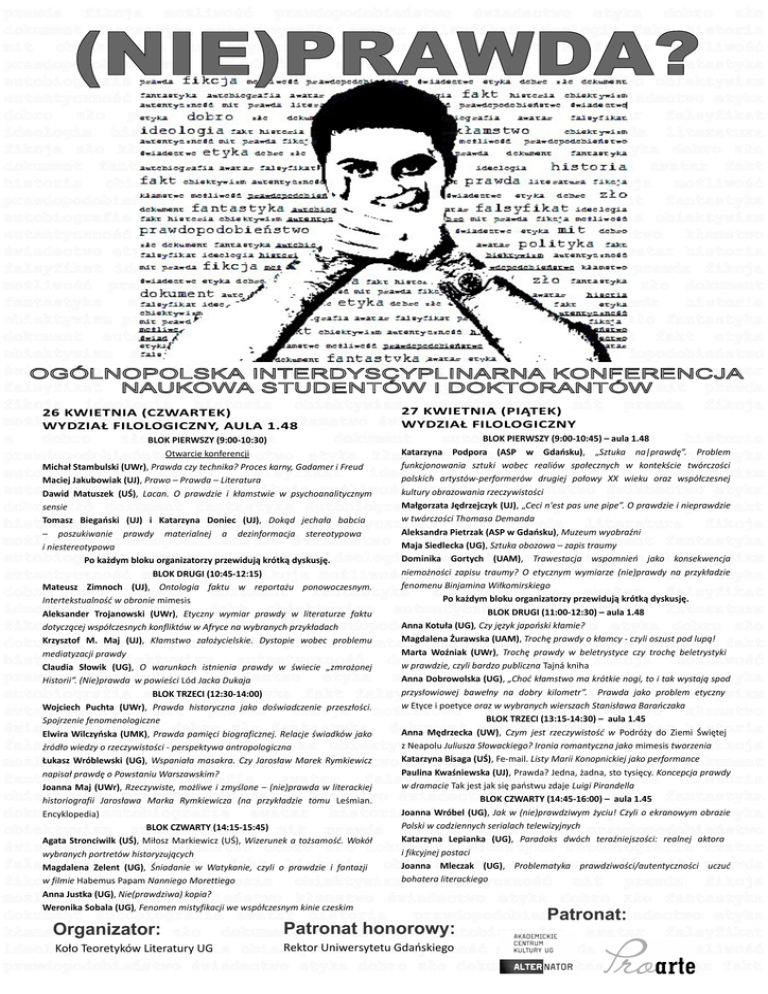 prawda fikcja możliwość prawdopodobieństwo świadectwo etyka dobro zło dokument fantastyka autobiografia awatar falsyfikat ideologia fakt historia mit obiektywizm autentyczność zło prawda literatura fikcja możliwość prawdopodobieństwo świadectwo etyka dobro fakt dokument fantastyka autobiografia awatar falsyfikat ideologia fakt historia kłamstwo obiektywizm autentyczność mit prawda fikcja możliwość prawdopodobieństwo świadectwo etyka dobro zło prawda dokument fantastyka autobiografia awatar falsyfikat ideologia historia fakt obiektywizm autentyczność mit prawda literatura fikcja zło kłamstwo możliwość prawdopodobieństwo świadectwo etyka dobro zło dokument fantastyka autobiografia awatar falsyfikat ideologia awatar fakt historia obiektywizm autentyczność dobro mit prawda fikcja możliwość prawdopodobieństwo świadectwo etyka mit dobro zło dokument fantastyka autobiografia awatar polityka fakt falsyfikat ideologia historia obiektywizm autentyczność mit prawda fikcja możliwość prawdopodobieństwo kłamstwo świadectwo etyka dobro zło fantastyka dokument autobiografia awatar historia falsyfikat ideologia fakt etyka obiektywizm autentyczność mit prawda fikcja możliwość prawdopodobieństwo świadectwo etyka kłamstwo dobro zło dokument fantastyka autobiografia awatar falsyfikat ideologia prawda historia obiektywizm prawdopodobieństwo kłamstwo świadectwo etyka dobro zło fantastyka dokument autobiografia awatar historia falsyfikat ideologia fakt etyka obiektywizm autentyczność mit prawda fikcja możliwość prawdopodobieństwo świadectwo etyka kłamstwo dobro zło dokument fantastyka autobiografia awatar falsyfikat ideologia fakt historia obiektywizm autentyczność mit prawda fikcja ideologia historia obiektywizm27 KWIETNIA autentyczność mit prawda fikcja (PIĄTEK) 26 KWIETNIA (CZWARTEK) możliwość prawdopodobieństwo kłamstwo świadectwo etyk WYDZIAŁ FILOLOGICZNY WYDZIAŁ FILOLOGICZNY, AULA 1.48 BLOK PIERWSZY (9:00-10:45)awatar – aula 1.48 a dobro złoBLOK PIERWSZY fantastyka dokument autobiografia historia (9:00-10:30) Katarzyna Podpora (ASP w Gdańsku), „Sztuka na|prawdę”. Problem Otwarcie konferencji prawdopodobieństwo świadectwo etyka kłamstwo dobro zło dokument fantastyka funkcjonowania sztuki wobec realiów społecznych w kontekście twórczości Michał Stambulski (UWr), Prawda czy technika? Proces karny, Gadamer i Freud autobiografia awatar falsyfikat ideologia fakt historia obiektywizm polskich artystów-performerów drugiej połowy XX wieku oraz współczesnej Maciej Jakubowiak (UJ), Prawo – Prawda – Literatura autentyczność fikcja możliwośćkultury prawdopodobieństwo świadectwo etyka obrazowania rzeczywistości Dawid Matuszek (UŚ), mit Lacan. O prawda prawdzie i kłamstwie w psychoanalitycznym Małgorzataawatar Jędrzejczyk (UJ),falsyfikat „Ceci n'est pas une pipe”.ideologia O prawdzie i nieprawdzie sensiezło dokument fantastyka autobiografia dobro fakt w twórczości Thomasa Demanda Tomasz Biegański (UJ) i Katarzyna Doniec (UJ), Dokąd jechała babcia historia mit obiektywizm autentyczność zło prawda literatura fikcja Aleksandra Pietrzak (ASP w Gdańsku), Muzeum wyobraźni – poszukiwanie prawdy materialnej a dezinformacja stereotypowa możliwość prawdopodobieństwo świadectwo Maja etyka fakt– zapis dokument fantastyka Siedleckadobro (UG), Sztuka obozowa traumy i niestereotypowa Dominika Gortych (UAM), Trawestacja wspomnień jako konsekwencja autobiografia awatar ideologia fakt historia kłamstwo obiektywizm Po każdym bloku organizatorzy falsyfikat przewidują krótką dyskusję. zapisu traumy? O etycznym wymiarze (nie)prawdy na przykładzie BLOK DRUGI (10:45-12:15) autentyczność mit prawda fikcja możliwośćniemożności prawdopodobieństwo świadectwo etyka fenomenu Binjamina Wiłkomirskiego Mateusz Zimnoch (UJ), Ontologia faktu w reportażu ponowoczesnym. dobro zło prawda dokument fantastyka autobiografia awatar falsyfikat Po każdym bloku organizatorzy przewidują krótką dyskusję. Intertekstualność w obronie mimesis ideologia historia fakt obiektywizm autentyczność prawda literatura BLOK DRUGI mit (11:00-12:30) – aula 1.48 Aleksander Trojanowski (UWr), Etyczny wymiar prawdy w literaturze faktu Anna Kotuła (UG), Czy język japoński kłamie? fikcja zło kłamstwo możliwość prawdopodobieństwo świadectwo etyka dobro zło dotyczącej współczesnych konfliktów w Afryce na wybranych przykładach Magdalena Żurawska (UAM), Trochę prawdy o kłamcy - czyli oszust pod lupą! Krzysztof M. fantastyka Maj (UJ), Kłamstwo założycielskie. Dystopie wobec problemu dokument autobiografia awatar falsyfikat ideologia awatar fakt Marta Woźniak (UWr), Trochę prawdy w beletrystyce czy trochę beletrystyki mediatyzacji prawdy historia obiektywizm autentyczność dobro mit prawda możliwość w prawdzie, czyli bardzo publiczna Tajná kniha fikcja Claudia Słowik (UG), O warunkach istnienia prawdy w świecie „zmrożonej prawdopodobieństwo świadectwo etyka mit dobro zło dokument fantastyka Anna Dobrowolska (UG), „Choć kłamstwo ma krótkie nogi, to i tak wystają spod Historii”. (Nie)prawda w powieści Lód Jacka Dukaja przysłowiowej bawełny na dobry kilometr”. Prawda jako obiektywizm problem etyczny BLOK TRZECI (12:30-14:00) autobiografia awatar polityka fakt falsyfikat ideologia historia w Etyce i poetyce oraz w wybranych wierszach Stanisława Barańczaka Wojciech Puchta (UWr), Prawda historyczna jako doświadczenie przeszłości. autentyczność mit prawda fikcja możliwość prawdopodobieństwo kłamstwo BLOK TRZECI (13:15-14:30) – aula 1.45 Spojrzenie fenomenologiczne świadectwo etyka dobro zło fantastyka dokument autobiografia historia Anna Mędrzecka (UW), Czym jest rzeczywistość w awatar Podróży do Ziemi Świętej Elwira Wilczyńska (UMK), Prawda pamięci biograficznej. Relacje świadków jako z Neapolu Juliusza Słowackiego? Ironia romantyczna mimes
