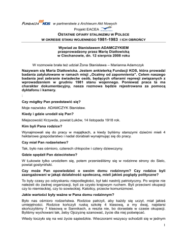 FUNDACJA w partnerstwie z Archiwum Akt Nowych Projekt EACEA OSTATNIE OFIARY STALINIZMU W POLSCE W OKRESIE STANU WOJENNEGO 1981-1983 I ICH OBROŃCY Wywiad ze Stanisławem ADAMCZYKIEM przeprowadzony przez Marię Diatłowicką w Ciechanowie, dn. 12 sierpnia 2008 roku W rozmowie brała też udział Żona Stanisława – Marianna Adamczyk Nazywam się Maria Diatłowicka. Jestem ankieterką Fundacji KOS, która prowadzi badania zatytułowane w ramach misji „Ocalmy od zapomnienia”. Celem naszego badania jest zebranie świadectw osób, będących ofiarami represji związanych z wprowadzeniem w grudniu 1981 stanu wojennego. Ponieważ praca ta ma charakter dokumentacyjny, nasza rozmowa będzie rejestrowana za pomocą dyktafonu i kamery. : Czy mógłby Pan przedstawić się? Moje nazwisko ADAMCZYK Stanisław. Kiedy i gdzie urodził się Pan? Miejscowość Krzywda, powiat Łuków, 14 listopada 1918 rok. Kim byli Pana rodzice? Wynajmowali się do pracy w majątkach, a kiedy byliśmy starszymi dziećmi mieli 4 hektarowe gospodarstwo i nadal dorabiali wynajmując się do pracy. Czy miał Pan rodzeństwo? Tak, było nas ośmioro, czterech chłopców i cztery dziewczyny. Gdzie spędził Pan dzieciństwo? W Łukowie tylko urodziłem się, potem przenieśliśmy się w rodzinne strony do Sielc, powiat gostyniński. Czy może Pan opowiedzieć o swoim domu rodzinnym? Czy rodzice byli zaangażowani w jakąś działalność społeczną, mieli jakieś poglądy polityczne? To były czasy po odzyskaniu niepodległości, był taki nastrój patriotyczny. Po wojnie nie należeli do żadnej organizacji, byli za czysto krajowym ruchem. Byli przeciwni okupacji czy to niemieckiej, czy to sowieckiej. Katolicy, przeciw komunizmowi. Jakie wartości były ważne w Pana domu rodzinnym? Było nas ośmioro rodzeństwa. Rodzice patrzyli, aby każdy się uczył, miał jakieś umiejętności. Rodzice kończyli ruską szkołę 4 klasową, a my dwaj, najstarsi skończyliśmy 7 klasową w Sannikach, a reszta nie, bo dorastała w czasie okupacji. Byliśmy wychowani tak, żeby Ojczyznę szanować, życie dla niej poświęcać. Wtedy toczyło się na wsi życie sąsiedzkie. Wieczorami wszyscy schodzili się w jednym 1 domu. Domy były obszerne, rozmaite, czasem nie było podłogi, tylko klepisko, ale było wesoło –różne opowieści, śpiewy, tańce. Polityką się mało interesowaliśmy. Owszem, słychać było o komunizmie, negatywnie. Ludzie mówili „O! Komunista”. Był taki jeden, dzieci się go bały. Miałem trzy-cztery lata, kiedy była obława, zjechało się wojsko i policja, właśnie na tych komunistów, którzy w 20-tym roku sprzyjali najazdowi bolszewików. Rodzina była biedna, więc kto dorastał, to opuszczał dom, sam musiał sobie radzić. W 39 roku, przed wybuchem wojny pracowałem już w Warszawie. Pamiętam naloty, pomagałem ratować rannych, wygrzebywać spod gruzu. Uciekłem do Sielc, które już były zbombardowane. A tu już Niemcy, prawo niemieckie. Brata zabrali do Oświęcimia, a ja nie poszedłem odebrać niemieckiego dowodu. Uciekłem na rowerze. Przyjechałem do Ciechanowa, a tu wszędzie wysiedlenia. Zaczęło się ukrywanie. Zaczął organizować się ruch, to w tym byłem. Czy to była Armia Krajowa? „Tak, przeważnie to był NSZ, Narodowe Siły Zbrojne. Bo tutaj wszystko to były Kurpie Szlacheckie, raczej wszystko Armia Krajowa.” Czy brał Pan udział w jakiś akcjach zbrojnych? Nie, ale w takich osobistych. Gdzie Pan pracował? Jak weszli Ruski byłem rzemieślnikiem zarejestrowanym w cechu, pracowałem jako budowlaniec. W 45 roku powołali mnie do wojska, zdezerterowałem. To już byłem jako wróg klasowy. W maju zostałem powołany, a już w październiku dostałem się do więzienia. Więzienia przeszedłem w Jeleniej Górze, Wrocławiu, Strzelcach Opolskich. Siedziałem półtora roku, wyszedłem po amnestii. Wyrok był –10 lat, później zmienili na 4 lata. Po wyjściu pracowałem na budowach, w latach 50-tych byłem kierownikiem budowy. Zagrozili, że jeżeli nie zapiszę się do partii, to mnie zwolnią. Pomyślałem, że pójdę do innej firmy, ale porobiłem trzy dni, to przychodzi sekretarz i mówi, że przychodzili z komitetu, żeby mnie nie zatrudniać. Nie było wyjścia, trzeba było zakładać firmę. To nie było łatwe, bo wszystkie materiały były prawie nie do zdobycia cegła wapno itp. na przydziały. Bywało, że domy z gliny stawiało się. Trzeba było stale się tłumaczyć. Kiedy zaangażował się Pan w działalność opozycyjną? Od samego początku ja z nimi w walce i tak jest do dziś. Bo ja jestem nieustępliwy. Bo jak jest moja racja, to jakim prawem ja mam ustępować? Taki się urodziłem, wychowałem w wierze katolickiej, w patriotyzmie. Jakim prawem ja mam szukać swoich przodków w ogrodach zoologicznych czy uznawać partnerstwo jednopłciowe? W październiku 80 go roku pierwsze koło Solidarności Wiejskiej w Ciechanowie z miejsca założyłem. Bardzo wcześnie. Byłem prywatnym budowlańcem. Tak mnie gnębili, że komornik na mnie ciążył. Ściągali z nas kary, a jak nie mieli z czego, to ściągali ze starej teściowej 80-letniej, która u nas na opiece była. To ja rzuciłem to wszystko, wziąłem się za Solidarność – tam ratunku szukałem. Zaczął Pan działać w Solidarności Rolników Indywidualnych? Dla mnie słowo rolnik indywidualny to jest twór bolszewicki. Przed wojną takiego nie było, tylko rolnik samodzielny. Świniarek z PGR-u też jest rolnikiem indywidualnym. Ja 2 dobrze trafiłem, od razu do Solidarności Wiejskiej, która nie uznawała kierowniczej roli partii, nie akceptowała polityki ZSL-owskiej, tych PGR-ów itd. Precz z sowiecką dominacją! Takie to było, więc nas gnębili. Jakie funkcje pełnił Pan w Solidarności Wiejskiej? Był taki okres, że byłem nawet zastępcą Krajówki. Ja na funkcje nie pchałem się. W których to było latach? Myśmy działali, nie zważali na to, że był stan wojenny. Po po