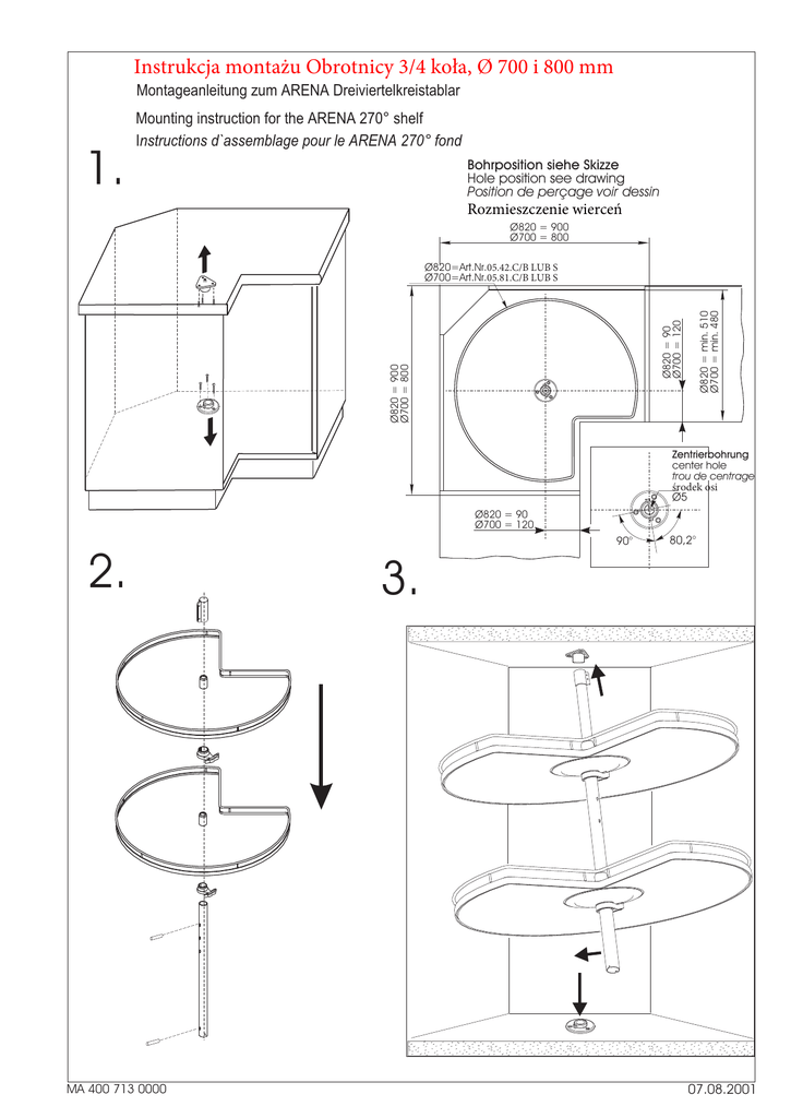 Instrukcja montażu Obrotnicy 3/4 koła, Ø 700 i 800 mm Montageanleitung zum ARENA Dreiviertelkreistablar 1. Mounting instruction for the ARENA 270° shelf Instructions d`assemblage pour le ARENA 270° fond Bohrposition siehe Skizze Hole position see drawing Position de perçage voir dessin Rozmieszczenie wierceń Ø820 = 900 Ø700 = 800 Ø820 = 900 Ø700 = 800 Ø820 = 90 Ø700 = 120 Ø820 = min. 510 Ø700 = min. 480 Ø820=Art.Nr.05.42.C/B LUB S Ø700=Art.Nr.05.81.C/B LUB S Zentrierbohrung center hole trou de centrage środek osi Ø5 Ø820 = 90 Ø700 = 120 90° 2. MA 400 713 0000 80,2° 3. 07.08.2001