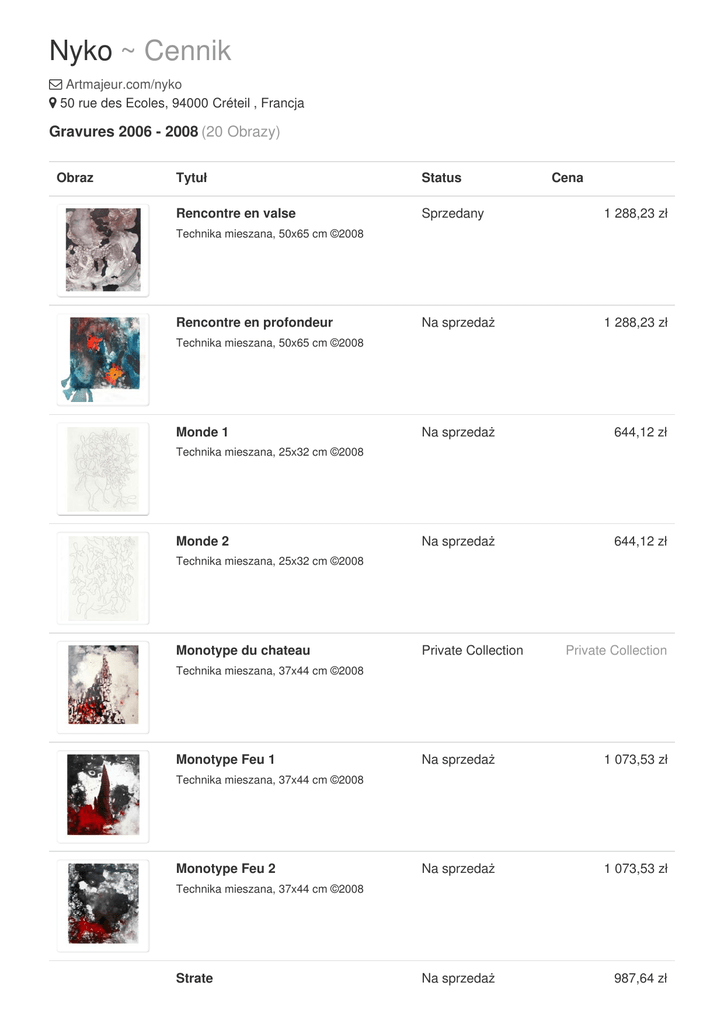 Nyko ~ Cennik Artmajeur.com/nyko 50 rue des Ecoles, 94000 Créteil , Francja Gravures 2006 - 2008 (20 Obrazy) Obraz Tytuł Status Cena Rencontre en valse Sprzedany 1 288,23 zł Na sprzedaż 1 288,23 zł Na sprzedaż 644,12 zł Na sprzedaż 644,12 zł Technika mieszana, 50x65 cm ©2008 Rencontre en profondeur Technika mieszana, 50x65 cm ©2008 Monde 1 Technika mieszana, 25x32 cm ©2008 Monde 2 Technika mieszana, 25x32 cm ©2008 Monotype du chateau Private Collection Private Collection Technika mieszana, 37x44 cm ©2008 Monotype Feu 1 Na sprzedaż 1 073,53 zł Na sprzedaż 1 073,53 zł Na sprzedaż 987,64 zł Technika mieszana, 37x44 cm ©2008 Monotype Feu 2 Technika mieszana, 37x44 cm ©2008 Strate Technika mieszana, 25x32 cm ©2008 Strate 2 Na sprzedaż 1 202,35 zł Na sprzedaż 1 159,41 zł Na sprzedaż 772,94 zł Na sprzedaż 1 073,53 zł Na sprzedaż 1 073,53 zł Na sprzedaż 1 159,41 zł Na sprzedaż 987,64 zł Na sprzedaż 1 202,35 zł Technika mieszana, 25x32 cm ©2008 gravure Technika mieszana, 25x33 cm ©2008 Vol de mammifère Technika mieszana, 28x30 cm ©2008 Modernisme Technika mieszana, 33x50 cm ©2008 Flêche Technika mieszana, 33x50 cm ©2008 Neige Technika mieszana, 25x33 cm ©2008 Monotype, expérimentation Technika mieszana, 25x34 cm ©2008 Parade Technika mieszana, 60x80 cm ©2006 foetus Na sprzedaż 730,00 zł Na sprzedaż 858,82 zł Na sprzedaż 730,00 zł Na sprzedaż 1 202,35 zł Technika mieszana, 50x65 cm ©2006 expérimentation sur polystyrene Technika mieszana, 65x50 cm ©2006 expérimentation sur bois Technika mieszana, 25x35 cm ©2006 Sortir de la gravure Technika mieszana, 28x30 cm ©2008 Powered by Artmajeur.com