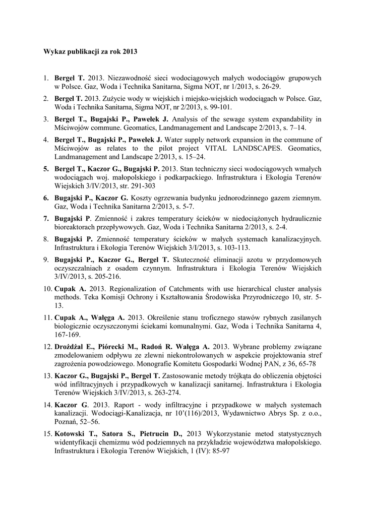 Wykaz publikacji za rok 2013 1. Bergel T. 2013. Niezawodność sieci wodociągowych małych wodociągów grupowych w Polsce. Gaz, Woda i Technika Sanitarna, Sigma NOT, nr 1/2013, s. 26-29. 2. Bergel T. 2013. Zużycie wody w wiejskich i miejsko-wiejskich wodociągach w Polsce. Gaz, Woda i Technika Sanitarna, Sigma NOT, nr 2/2013, s. 99-101. 3. Bergel T., Bugajski P., Pawełek J. Analysis of the sewage system expandability in Mściwojów commune. Geomatics, Landmanagement and Landscape 2/2013, s. 7–14. 4. Bergel T., Bugajski P., Pawełek J. Water supply network expansion in the commune of Mściwojów as relates to the pilot project VITAL LANDSCAPES. Geomatics, Landmanagement and Landscape 2/2013, s. 15–24. 5. Bergel T., Kaczor G., Bugajski P. 2013. Stan techniczny sieci wodociągowych wmałych wodociągach woj. małopolskiego i podkarpackiego. Infrastruktura i Ekologia Terenów Wiejskich 3/IV/2013, str. 291-303 6. Bugajski P., Kaczor G. Koszty ogrzewania budynku jednorodzinnego gazem ziemnym. Gaz, Woda i Technika Sanitarna 2/2013, s. 5-7. 7. Bugajski P. Zmienność i zakres temperatury ścieków w niedociążonych hydraulicznie bioreaktorach przepływowych. Gaz, Woda i Technika Sanitarna 2/2013, s. 2-4. 8. Bugajski P. Zmienność temperatury ścieków w małych systemach kanalizacyjnych. Infrastruktura i Ekologia Terenów Wiejskich 3/I/2013, s. 103-113. 9. Bugajski P., Kaczor G., Bergel T. Skuteczność eliminacji azotu w przydomowych oczyszczalniach z osadem czynnym. Infrastruktura i Ekologia Terenów Wiejskich 3/IV/2013, s. 205-216. 10. Cupak A. 2013. Regionalization of Catchments with use hierarchical cluster analysis methods. Teka Komisji Ochrony i Kształtowania Środowiska Przyrodniczego 10, str. 513. 11. Cupak A., Wałęga A. 2013. Określenie stanu troficznego stawów rybnych zasilanych biologicznie oczyszczonymi ściekami komunalnymi. Gaz, Woda i Technika Sanitarna 4, 167-169. 12. Drożdżal E., Piórecki M., Radoń R. Wałęga A. 2013. Wybrane problemy związane zmodelowaniem odpływu ze zlewni niekontrolowanych w aspekcie projektowania stref zagrożenia powodziowego. Monografie Komitetu Gospodarki Wodnej PAN, z 36, 65-78 13. Kaczor G., Bugajski P., Bergel T. Zastosowanie metody trójkąta do obliczenia objętości wód infiltracyjnych i przypadkowych w kanalizacji sanitarnej. Infrastruktura i Ekologia Terenów Wiejskich 3/IV/2013, s. 263-274. 14. Kaczor G. 2013. Raport - wody infiltracyjne i przypadkowe w małych systemach kanalizacji. Wodociągi-Kanalizacja, nr 10’(116)/2013, Wydawnictwo Abrys Sp. z o.o., Poznań, 52–56. 15. Kotowski T., Satora S., Pietrucin D., 2013 Wykorzystanie metod statystycznych widentyfikacji chemizmu wód podziemnych na przykładzie województwa małopolskiego. Infrastruktura i Ekologia Terenów Wiejskich, 1 (IV): 85-97 16. Krzanowski S., Miler A.T., Wałęga A. 2013. Wpływ warunków wilgotnościowych na estymację wartości parametru CN w zlewni górskiej. Infrastruktura i Ekologia Terenów Wiejskich 3/IV, 105-117 17. Michalec B., Cupak A., Wałęga A. 2013. Retencja zbiornikowa w ochronie przeciwpowodziowej terenów systemu odwadniającego stopnia wodnego Łączany na rzece Wiśle. Infrastruktura i Ekologia Terenów Wiejskich 3/IV, 177-190 18. Pawełek J., Grenda W. 2013 Zmiana wprowadzeniu zbiorników ujęciowych do Rozdział w monografii pt. „Praktyczne kanalizacyjnych w warunkach rosnących i społecznych”. Bielsko-Biała, 41-52. jakości wody oraz ciągłość poboru po układu technologicznego ZUW Rudawa. działanie przedsiębiorstw wodociągowowymagań ekologicznych, ekonomicznych 19. Pawełek J. 2013 Działalność badawcza i dydaktyczna Wydziału Inżynierii Środowiska UR. Aura 7/201, str. 13-14. 20. Knapik K., Pawełek J. 2013 Gospodarowanie wodami w jednostkach osadniczych na tle stanu gospodarki wodnej w kraju. Rozdział w monografii pt. „Praktyczne działanie przedsiębiorstw wodociągowo-kanalizacyjnych w warunkach rosnących wymagań ekologicznych, ekonomicznych i społecznych”. Bielsko-Biała, 53-70. 21. Pietrucin D., Satora S., Kotowski T., 2013 An assessment of water reservoirs as apotential sources of pollution of the quaternary aquifer in Osielsko community. Pol. J. Environ. Stud. Vol. 22, No. 6:1789-1797. 22. Pijanowski J., Radecki-Pawlik R., Wałęga A., Wojkowski J. 2013. Evaluation of soil water erosion risk in the Mściwojów water reservoir drainage basin on the basis of numeric modelling. Geomatics, Landmanagement and Landscape 1, 83-95 23. Radecki-Pawlik A., Wałęga A., Wojkowski J. 2013. Influence of changes in land use on the values of maximal peak flows on example of Winna Góra in the neighbourhood of Mściwojów reservoir. Geomatics, Landmanagement and Landscape 2, 99-110 24. Wałęga A. 2013. Application of HEC-HMS programme for the reconstruction of a flood event in an uncontrolled basin. Journal of Water and Land Development 18 (I-VI), 13-20 25. Walega A. 2013. The role of spatial planning in flood protection. Geomatics, Landmanagement and Landscape 3, 91-104 26. Wałęga A., Cupak A., Michalec B., Wachulec K. 2013. Wpływ parametrów fizycznogeograficznych zlewni i charakterystyk opadu na czas koncentracji odpływu. Czasopismo Inżynierii Lądowej, Środowiska i Architektury t. XXX, z. 60 (3/13) lipiec-wrzesień, 143160 DOI: 10.7862/rb.2013.44 27. Wałęga A., Cupak A. 2013. Wykorzystanie zmodyfikowanego chwilowego hydrogramu jednostkowego Clarka do symulacji wezbrań opadowych. Monografie Komitetu Gospodarki Wodnej PAN, z 36, 55-65 28. Wałęga A., Radecki-Pawlik A., Kaczor G. 2013. Naturalne sposoby zagospodarowania wód opadowych. Wyd. Uniwersytetu Rolniczego w Krakowie. ISBN: 978-83-60633-64-9, s. 235 29. Wąsik E., Chmielowski K. 2013. Skuteczność oczyszczania ścieków bytowych w filtrach piaskowych o przepływie pionowym z dodatkiem ziarnistego węgla aktywnego. Infrastruktura i Ekologia Terenów Wiejskich 3/I/2013, PAN o/Kraków, 7-17 30. Wąsik E., Chmielowski K. 2013. Ocena funkcjonowa