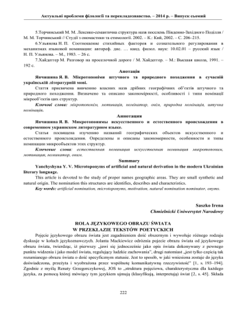 Актуальні проблеми філології та перекладознавства. – 2014 р. – Випуск сьомий 5.Торчинський М. М. Лексико-семантична структура назв поселень Південно-Західного Поділля / М. М. Торчинський // Студії з ономастики та етимології. 2002. – К.: Кий, 2002. – С. 206–215. 6.Ульянова Н. П. Соотношение стихийных факторов и сознательного регулирования в механизмах языковой номинации: автореф. дис. … канд. филол. наук: 10.02.01 – русский язык / Н. П. Ульянова. – М., 1983. – 26 с. 7.Хайдеггер М. Разговор на проселочной дороге / М. Хайдеггер. – М.: Высшая школа, 1991. – 192 с. Анотація Янчишина Я. В. Мікротопоніми штучного та природного походження в сучасній українській літературній мові. Стаття присвячена вивченню власних назв дрібних географічних об‘єктів штучного та природного походження. Визначено та описано закономірності, особливості і типи номінації мікрооб‘єктів цих структур. Ключові слова: мікротопонім, мотивація, номінатор, онім, природна номінація, штучна номінація. Аннотация Янчишина Я. В. Микротопонимы искусственного и естественного происхождения в современном украинском литературном языке. Статья посвящена изучению названий географических объектов искусственного и естественного происхождения. Определены и описаны закономерности, особенности и типы номинации микрообъектов этих структур. Ключевые слова: естественная номинация искусственная номинация микротопоним, мотивация, номинатор, оним. Summary Yanchyshyna Y. V. Microtoponyms of artificial and natural derivation in the modern Ukrainian literary language. This article is devoted to the study of proper names geographic areas. They are small synthetic and natural origin. The nomination this structures are identifies, describes and characteristics. Key words: artificial nomination, microtoponyms, motivation, natural nomination nominator, onyms. Saszko Irena Chmielnicki Uniwersytet Narodowy ROLA JĘZYKOWEGO OBRAZU ŚWIATA W PRZEKŁAZIE TEKSTÓW POETYCKICH Pojęcie językowego obrazu świata jest zagadnieniem dość obszernym i wywołuje różnego rodzaju dyskusje w kołach językoznawczych. Jolanta Mackiewicz odróznia pojecie obrazu świata od językowego obrazu świata, twierdząc, iż pierwszy „jawi się jednocześnie jako opis świata dokonywany z pewnego punktu widzenia i jako model świata, regulujący ludzkie zachowania‖, drugi natomiast „jest tylko częścią tak rozumianego obrazu świata o dość specyficznym statusie. Jest to sposób, w jaki wniesiona zostaje do języka doświadczona, przeżyta i wyobrażona przez wspólnotę komunikatywną rzeczywistość‖ [1, s. 193–194]. Zgodnie z myślą Renaty Grzegorczykowej, JOS to „struktura pojęciowa, charakterystyczna dla każdego języka, za pomocą której mówiący tym językiem ujmują (klasyfikują, interpretują) świat [2, s. 45]. Składa 222 Актуальні проблеми філології та перекладознавства. – 2014 р. – Випуск сьомий się więc na to cały szereg indywidualnych doświadczeń nadawcy, jego sposób myślenia, postrzegania danej rzeczywistości, a niekiedy też zabiegi, przy pomocy których ów nadawca dokonuje kreacji pewnych zjawisk bądź wzorców, próbuje w pewien sposób zwerbalisować swoje przedstawienie o nich. Jest to – zgodnie z myślą Janusza Anusiewicza – „jedno z centralnych pojęć współczesnej semantyki oraz teorii poznania – zajmującej się udziałem języka w procesach poznawczych‖ [3, s. 261]. Jolanta Maćkiewicz twierdzi, iż językowy obraz świata „spełnia dwie podstawowe funkcje: interpretującą i regulującą. Interpretuje rzeczywistość, z którą styka się człowiek i reguluje ludzkie zachowanie wobec tej rzeczywistości. Wiąży się w ten sposób z dwiema dziedzinami aktywności człowieka: z myśleniem i działaniem [4, s. 52]. Natomiast Jerzy Barmiński wyodręnia dwa warianty językowego obrazu świata, mianowicie: podmiotowy, który określa jako „wizję świata‖ oraz przedmiotowy, czyli sam „obraz świata‖ [5, s. 103]. Najwyraźniej – wydawałoby się – sprecyzował owo pojęcie Ryszard Tokarski, twierdząc, iż jest to „zbiór prawidłowości zawartych w kategorialnych związkach gramatycznych (fleksyjnych, słowotwórczych, składniowych) oraz w semantycznych strukturach leksyki, pokazujących swoiste dla danego języka sposoby widzenia poszczególnych składników świata oraz ogólniejsze rozumienie organizacji świata, panujących w nich hierarchii i akceptowanych przez społeczność językową wartości‖ [6, s. 343–370]. Nie istnieje zatem jednolita definicja adekwatna do różnorakich prób sprecyzowania owego zagadnienia, gdyż tworzy ono szerokie ramy teoretyczne i dotyczy niejednoznacznych określeń, często usytuowanych w kategoriach kontekstowych, związanych zarówno z określoną formą wypowiedzi, jak również z inte