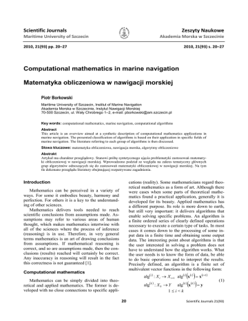 Scientific Journals Zeszyty Naukowe Maritime University of Szczecin Akademia Morska w Szczecinie 2010, 21(93) pp. 20–27 2010, 21(93) s. 20–27 Computational mathematics in marine navigation Matematyka obliczeniowa w nawigacji morskiej Piotr Borkowski Maritime University of Szczecin, Institut of Marine Navigation Akademia Morska w Szczecinie, Instytut Nawigacji Morskiej 70-500 Szczecin, ul. Wały Chrobrego 1–2, e-mail: [email protected] Key words: computational mathematics, marine navigation, computational algorithms Abstract This article is an overview aimed at a synthetic description of computational mathematics applications in marine navigation. The presented classification of algorithms is based on their application in specific fields of marine navigation. The literature referring to each group of algorithms is then discussed. Słowa kluczowe: matematyka obliczeniowa, nawigacja morska, algorytmy obliczeniowe Abstrakt Artykuł ma charakter przeglądowy. Stanowi próbę syntetycznego ujęcia problematyki zastosowań matematyki obliczeniowej w nawigacji morskiej. Wprowadzono podział ze względu na zakres tematyczny głównych grup algorytmów odnoszących się do zastosowań matematyki obliczeniowej w nawigacji morskiej. Na tym tle dokonano przeglądu literatury obejmującej rozpatrywane zagadnienia. Introduction cations (reality). Some mathematicians regard theoretical mathematics as a form of art. Although there were cases when some parts of theoretical mathematics found a practical application, generally it is developed for its beauty. Applied mathematics has a different purpose. Its role is more down to earth, but still very important: it delivers algorithms that enable solving specific problems. An algorithm is a finite ordered series of clearly defined operations necessary to execute a certain type of tasks. In most cases it comes down to the processing of some input data in a finite time and obtaining some output data. The interesting point about algorithms is that the user interested in solving a problem does not have to understand how the algorithm works. What the user needs is to know the form of data, be able to do basic operations and to interpret the results. Precisely defined, an algorithm is a finite set of multivalent vector functions in the following form: Mathematics can be perceived in a variety of ways. For some it embodies beauty, harmony and perfection. For others it is a key to the understanding of other sciences. Mathematics delivers tools needed to reach scientific conclusions from assumptions made. Assumptions may refer to various areas of human thought, which makes mathematics intertwine with all of the sciences where the process of inference (reasoning) is in use. Therefore, in very general terms mathematics is an art of drawing conclusions from assumptions. If mathematical reasoning is correct, and so are assumptions made, then the conclusions (results) reached will certainly be correct. Any inaccuracy in reasoning will result in the fact this correctness is not guaranteed [1]. Computational mathematics alg x y algi : X i X i1 algi x i x i1 Mathematics can be simply divided into theoretical and applied mathematics. The former is developed with no close connections to specific appli- k algk : X k Y 1i<k 20 k (1) Scientific Journals 21(93) Computational mathematics in marine navigation where: k – finite natural number of elementary operations (it need not be known at the start of the algorithm, so that some alg functions may be defined by iteration); Xi – space of all possible input data in an i-th elementary operation of the algorithm (1 i k); Y – space of all possible output data; x(i) = [x1(i), x2(i), ..., xn(i)]T – vector of input data in an i-th elementary operation of the algorithm (1 i k); ni – number of input data in an i-th elementary operation of the algorithm (1 i k); y = [y1, y2, ..., ym]T – vector of output data; m – number of output data. The oldest records of mathematics were in fact those of what we call applied mathematics. All calculations were made for some practical purposes. Initially mathematics was a set of calculating algorithms used for solving concrete computing problems. In the beginning, people were the only users of those algorithms. Errare humanum est, therefore it is not surprising that the final result (problem solution), despite an excellent algorithm, often happened to be burdened with an error. Applied mathematics flourished with the invention of computing machines that took over the role of people in operating algorithms and soon turned out to be far more effective in computing than human mind. In the second half of the 20th century the role of applied mathematics expanded rapidly. Computers led to algorithms much more complex than those the human can use with a pen and paper, algorithms that even an army of mathematicians would not be able to cope with. It was the computer that made it possible to implement complicated algorithms. It was then that computational mathematics was established, also referred to as computer mathematics or mathematics of computing. of science and technology that deals with information processing, which includes technologies of information processing and technologies of manufacturing systems for information processing. In other words, informatics deals with processes of designing, construction, evaluation, use and maintenance of systems for data storage, processing and transmission. These processes relate to hardware, software as well as human and organizational aspects. Most often information (data) processing involves the computer operating according to the algorithm implemented as a computer program. Such program reflects an algorithm recorded in a language the computer understands [4]. In various classifications informatics is often placed within mathematics and partly in engineering sciences. It follows that historically informatics became divided into theory (derived from m