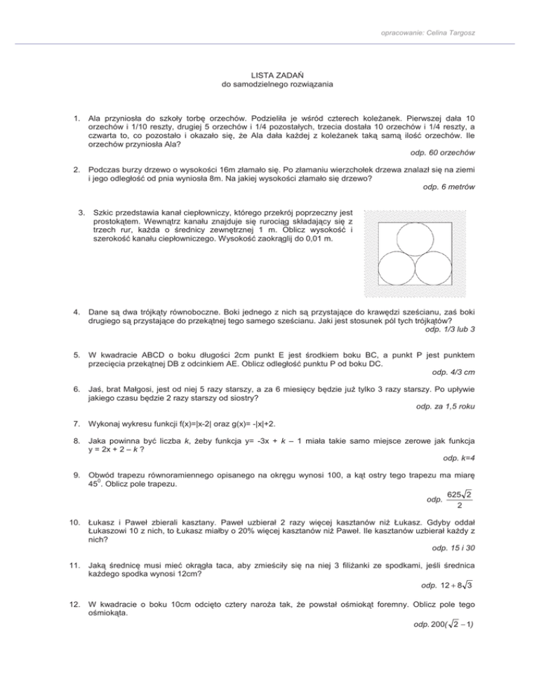 opracowanie: Celina Targosz LISTA ZADA do samodzielnego rozwi zania 1. Ala przyniosła do szkoły torb orzechów. Podzieliła je w ród czterech kole anek. Pierwszej dała 10 orzechów i 1/10 reszty, drugiej 5 orzechów i 1/4 pozostałych, trzecia dostała 10 orzechów i 1/4 reszty, a czwarta to, co pozostało i okazało si , e Ala dała ka dej z kole anek tak sam ilo orzechów. Ile orzechów przyniosła Ala? odp. 60 orzechów 2. Podczas burzy drzewo o wysoko ci 16m złamało si . Po złamaniu wierzchołek drzewa znalazł si na ziemi i jego odległo od pnia wyniosła 8m. Na jakiej wysoko ci złamało si drzewo? odp. 6 metrów 3. Szkic przedstawia kanał ciepłowniczy, którego przekrój poprzeczny jest prostok tem. Wewn trz kanału znajduje si ruroci g składaj cy si z trzech rur, ka da o rednicy zewn trznej 1 m. Oblicz wysoko i szeroko kanału ciepłowniczego. Wysoko zaokr glij do 0,01 m. 4. Dane s dwa trójk ty równoboczne. Boki jednego z nich s przystaj ce do kraw dzi sze cianu, za boki drugiego s przystaj ce do przek tnej tego samego sze cianu. Jaki jest stosunek pól tych trójk tów? odp. 1/3 lub 3 5. W kwadracie ABCD o boku długo ci 2cm punkt E jest rodkiem boku BC, a punkt P jest punktem przeci cia przek tnej DB z odcinkiem AE. Oblicz odległo punktu P od boku DC. odp. 4/3 cm 6. Ja , brat Małgosi, jest od niej 5 razy starszy, a za 6 miesi cy b dzie ju tylko 3 razy starszy. Po upływie jakiego czasu b dzie 2 razy starszy od siostry? odp. za 1,5 roku 7. Wykonaj wykresu funkcji f(x)=|x-2| oraz g(x)= -|x|+2. 8. Jaka powinna by liczba k, eby funkcja y= -3x + k – 1 miała takie samo miejsce zerowe jak funkcja y = 2x + 2 – k ? odp. k=4 9. Obwód trapezu równoramiennego opisanego na okr gu wynosi 100, a k t ostry tego trapezu ma miar 0 45 . Oblicz pole trapezu. 625 2 odp. 2 10. Łukasz i Paweł zbierali kasztany. Paweł uzbierał 2 razy wi cej kasztanów ni Łukasz. Gdyby oddał Łukaszowi 10 z nich, to Łukasz miałby o 20% wi cej kasztanów ni Paweł. Ile kasztanów uzbierał ka dy z nich? odp. 15 i 30 11. Jak rednic musi mie okr gła taca, aby zmie ciły si ka dego spodka wynosi 12cm? na niej 3 fili anki ze spodkami, je li rednica odp. 12 + 8 3 12. W kwadracie o boku 10cm odci to cztery naro a tak, e powstał o miok t foremny. Oblicz pole tego o miok ta. odp. 200( 2 − 1)