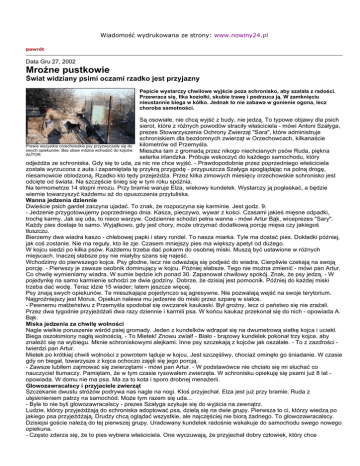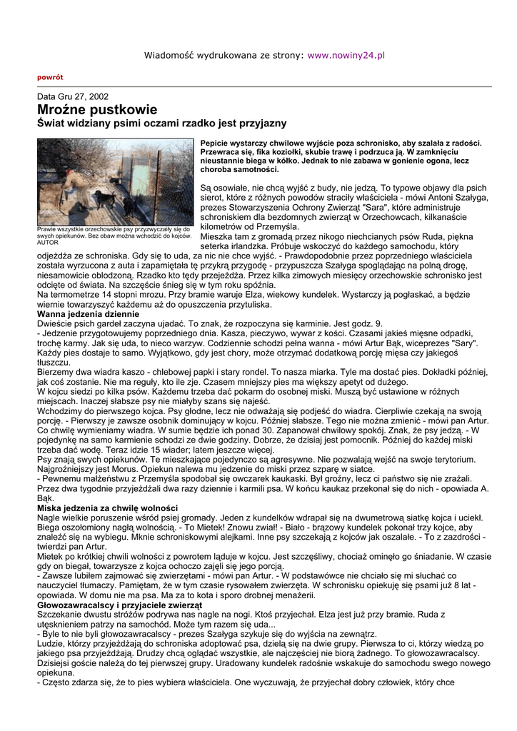 Wiadomość wydrukowana ze strony: www.nowiny24.pl powrót Data Gru 27, 2002 Mroźne pustkowie Świat widziany psimi oczami rzadko jest przyjazny Pepicie wystarczy chwilowe wyjście poza schronisko, aby szalała z radości. Przewraca się, fika koziołki, skubie trawę i podrzuca ją. W zamknięciu nieustannie biega w kółko. Jednak to nie zabawa w gonienie ogona, lecz choroba samotności. Są osowiałe, nie chcą wyjść z budy, nie jedzą. To typowe objawy dla psich sierot, które z różnych powodów straciły właściciela - mówi Antoni Szałyga, prezes Stowarzyszenia Ochrony Zwierząt "Sara", które administruje schroniskiem dla bezdomnych zwierząt w Orzechowcach, kilkanaście kilometrów od Przemyśla. Prawie wszystkie orzechowskie psy przyzwyczaiły się do swych opiekunów. Bez obaw można wchodzić do kojców. Mieszka tam z gromadą przez nikogo niechcianych psów Ruda, piękna AUTOR seterka irlandzka. Próbuje wskoczyć do każdego samochodu, który odjeżdża ze schroniska. Gdy się to uda, za nic nie chce wyjść. - Prawdopodobnie przez poprzedniego właściciela została wyrzucona z auta i zapamiętała tę przykrą przygodę - przypuszcza Szałyga spoglądając na polną drogę, niesamowicie oblodzoną. Rzadko kto tędy przejeżdża. Przez kilka zimowych miesięcy orzechowskie schronisko jest odcięte od świata. Na szczęście śnieg się w tym roku spóźnia. Na termometrze 14 stopni mrozu. Przy bramie waruje Elza, wiekowy kundelek. Wystarczy ją pogłaskać, a będzie wiernie towarzyszyć każdemu aż do opuszczenia przytuliska. Wanna jedzenia dziennie Dwieście psich gardeł zaczyna ujadać. To znak, że rozpoczyna się karminie. Jest godz. 9. - Jedzenie przygotowujemy poprzedniego dnia. Kasza, pieczywo, wywar z kości. Czasami jakieś mięsne odpadki, trochę karmy. Jak się uda, to nieco warzyw. Codziennie schodzi pełna wanna - mówi Artur Bąk, wiceprezes "Sary". Każdy pies dostaje to samo. Wyjątkowo, gdy jest chory, może otrzymać dodatkową porcję mięsa czy jakiegoś tłuszczu. Bierzemy dwa wiadra kaszo - chlebowej papki i stary rondel. To nasza miarka. Tyle ma dostać pies. Dokładki później, jak coś zostanie. Nie ma reguły, kto ile zje. Czasem mniejszy pies ma większy apetyt od dużego. W kojcu siedzi po kilka psów. Każdemu trzeba dać pokarm do osobnej miski. Muszą być ustawione w różnych miejscach. Inaczej słabsze psy nie miałyby szans się najeść. Wchodzimy do pierwszego kojca. Psy głodne, lecz nie odważają się podjeść do wiadra. Cierpliwie czekają na swoją porcję. - Pierwszy je zawsze osobnik dominujący w kojcu. Później słabsze. Tego nie można zmienić - mówi pan Artur. Co chwilę wymieniamy wiadra. W sumie będzie ich ponad 30. Zapanował chwilowy spokój. Znak, że psy jedzą. - W pojedynkę na samo karmienie schodzi ze dwie godziny. Dobrze, że dzisiaj jest pomocnik. Później do każdej miski trzeba dać wodę. Teraz idzie 15 wiader; latem jeszcze więcej. Psy znają swych opiekunów. Te mieszkające pojedynczo są agresywne. Nie pozwalają wejść na swoje terytorium. Najgroźniejszy jest Morus. Opiekun nalewa mu jedzenie do miski przez szparę w siatce. - Pewnemu małżeństwu z Przemyśla spodobał się owczarek kaukaski. Był groźny, lecz ci państwo się nie zrażali. Przez dwa tygodnie przyjeżdżali dwa razy dziennie i karmili psa. W końcu kaukaz przekonał się do nich - opowiada A. Bąk. Miska jedzenia za chwilę wolności Nagle wielkie poruszenie wśród psiej gromady. Jeden z kundelków wdrapał się na dwumetrową siatkę kojca i uciekł. Biega oszołomiony nagłą wolnością. - To Mietek! Znowu zwiał! - Biało - brązowy kundelek pokonał trzy kojce, aby znaleźć się na wybiegu. Mknie schroniskowymi alejkami. Inne psy szczekają z kojców jak oszalałe. - To z zazdrości twierdzi pan Artur. Mietek po krótkiej chwili wolności z powrotem ląduje w kojcu. Jest szczęśliwy, chociaż ominęło go śniadanie. W czasie gdy on biegał, towarzysze z kojca ochoczo zajęli się jego porcją. - Zawsze lubiłem zajmować się zwierzętami - mówi pan Artur. - W podstawówce nie chciało się mi słuchać co nauczyciel tłumaczy. Pamiętam, że w tym czasie rysowałem zwierzęta. W schronisku opiekuję się psami już 8 lat opowiada. W domu nie ma psa. Ma za to kota i sporo drobnej menażerii. Głowozawracalscy i przyjaciele zwierząt Szczekanie dwustu stróżów podrywa nas nagle na nogi. Ktoś przyjechał. Elza jest już przy bramie. Ruda z utęsknieniem patrzy na samochód. Może tym razem się uda... - Byle to nie byli głowozawracalscy - prezes Szałyga szykuje się do wyjścia na zewnątrz. Ludzie, którzy przyjeżdżają do schroniska adoptować psa, dzielą się na dwie grupy. Pierwsza to ci, którzy wiedzą po jakiego psa przyjeżdżają. Drudzy chcą oglądać wszystkie, ale najczęściej nie biorą żadnego. To głowozawracalscy. Dzisiejsi goście należą do tej pierwszej grupy. Uradowany kundelek radośnie wskakuje do samochodu swego nowego opiekuna. - Często zdarza się, że to pies wybiera właściciela. One wyczuwają, że przyjechał dobry człowiek, który chce przygarnąć jednego z nich. Niektóre starają się przymilać. Patrzą tak błagalnie, że nie można się oprzeć - opowiada A. Bąk. Samochód odjeżdża. Elza odchodzi spod bramy. Ruda wciąż tam stoi. Może kiedyś uda się jej wskoczyć do samochodu, z którego jej nikt nie wyrzuci... www.nowiny24.pl | PODKARPACKI PORTAL INFORMACYJNY