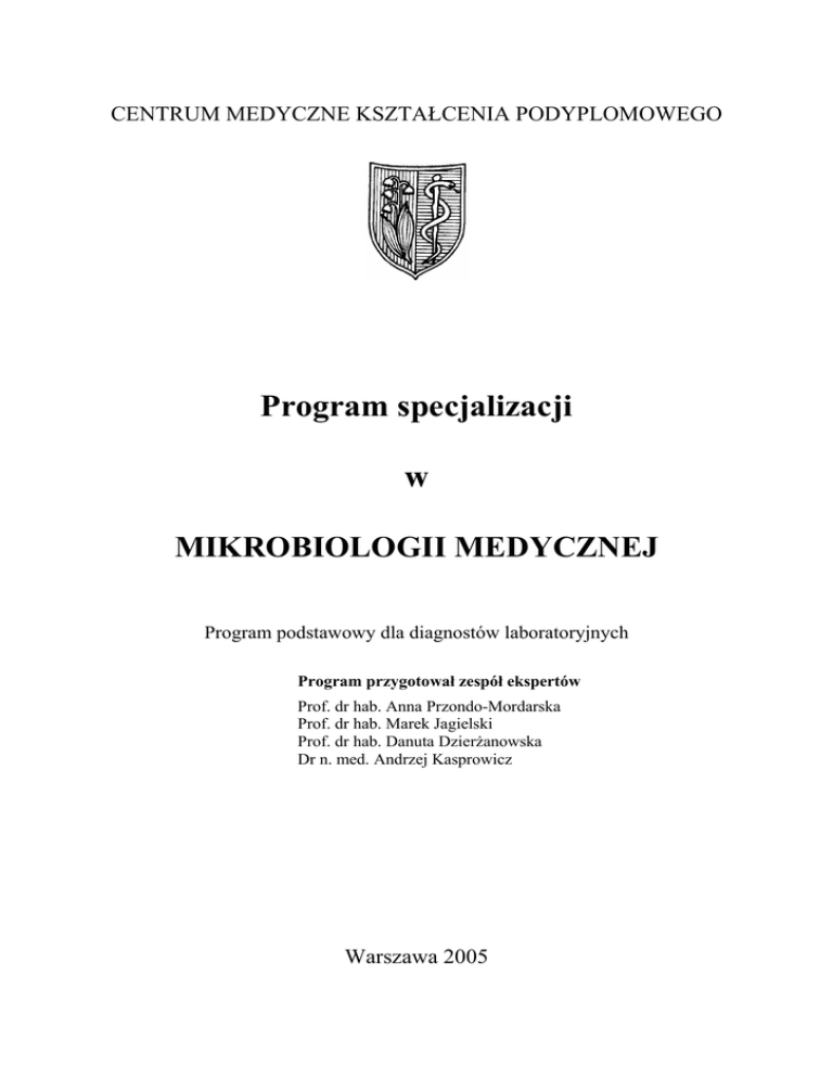 CENTRUM MEDYCZNE KSZTAŁCENIA PODYPLOMOWEGO Program specjalizacji w MIKROBIOLOGII MEDYCZNEJ Program podstawowy dla diagnostów laboratoryjnych Program przygotował zespół ekspertów Prof. dr hab. Anna Przondo-Mordarska Prof. dr hab. Marek Jagielski Prof. dr hab. Danuta Dzierżanowska Dr n. med. Andrzej Kasprowicz Warszawa 2005 Mikrobiologia medyczna – program specjalizacji podstawowy dla diagnostów laboratoryjnych 1. ZAŁOŻENIA ORGANIZACYJNO-PROGRAMOWE A) Cele kształcenia specjalizacyjnego Cele edukacyjne Celem specjalizacji w zakresie mikrobiologii medycznej jest wykształcenie specjalisty o wszechstronnej, ugruntowanej teoretycznie i praktycznie wiedzy na temat podstawowych grup drobnoustrojów (bakterie, wirusy, grzyby, pasożyty) oraz prionów i ich wpływie na organizmy wyższe – w szczególności na zdrowie człowieka (m.in. choroby infekcyjne w tym, zakażenia szpitalne, zoonozy) i ekologię środowiska (m.in. skażenie wody, żywności, leków itd.) oraz technik diagnostycznych, z umiejętnością interpretowania i przetwarzania wyników badań uzyskanych podczas pracy w laboratorium mikrobiologicznym. W dążeniu do osiągnięcia tego celu zakłada się uzyskanie przez specjalizującego się diagnostę laboratoryjnego pełnego zakresu wymaganej wiedzy oraz wymaganych umiejętności praktycznych, nakreślonych przez niniejszy program. Ponadto założeniem kształcenia specjalizacyjnego jest rozwijanie pożądanych cech osobowości specjalizującego się diagnosty laboratoryjnego, kształtowanie postaw etycznych, wypracowanie obowiązku ciągłego samokształcenia, poszerzania i pogłębiania wiedzy i umiejętności praktycznych, oraz wprowadzania nowych osiągnięć do praktyki zawodowej. Uzyskane kompetencje Diagnosta laboratoryjny po ukończeniu specjalizacji w dziedzinie mikrobiologii medycznej uzyska szczególne kwalifikacje umożliwiające: • realizację zadań z zakresu diagnostyki, racjonalnej chemioterapii i profilaktyki chorób zakaźnych i pasożytniczych występujących sporadycznie, endemicznie lub epidemicznie, a także zadań wynikających z zagrożeń biologicznych; • współpracę z lekarzami w realizacji programów kontroli i profilaktyki zakażeń szpitalnych, polityki antybiotykowej szpitala i innych programów z zakresu higieny sanitarnej i epidemiologii, • samodzielne kierowanie laboratorium mikrobiologicznym, • kierowanie kształceniem specjalizacyjnym innych osób w zakresie mikrobiologii medycznej. B) Czas trwania specjalizacji Czas trwania specjalizacji w zakresie mikrobiologii medycznej dla diagnostów laboratoryjnych posiadających, co najmniej 1 rok stażu pracy wynosi 5 lat (60 miesięcy). C) Wymagana wiedza Oczekuje się, że diagnosta laboratoryjny po ukończeniu kształcenia specjalizacyjnego wykaże się przedstawioną poniżej wiedzą: A. Mikrobiologia ogólna: a) systematyka, morfologia, fizjologia, genetyka i budowa antygenowa bakterii, wirusów, grzybów i pasożytów, b) wrażliwość drobnoustrojów na czynniki fizyczne i chemiczne – podstawy sterylizacji i dezynfekcji, c) zasady hodowli i identyfikacji drobnoustrojów, d) antybiotyki i chemioterapeutyki, mechanizmy działania na drobnoustroje, mechanizmy oporności drobnoustrojów na leki: genetyczne podstawy oporności i ekspresja fenotypowa, metody wykrywania najważniejszych z klinicznego punktu widzenia mechanizmów lekooporności. CMKP 2005 2 Mikrobiologia medyczna – program specjalizacji podstawowy dla diagnostów laboratoryjnych B. Mikrobiologia kliniczna. a) zasady pobierania i przesyłania próbek materiału klinicznego do badań, b) czynniki warunkujące chorobotwórczość bakterii, wirusów, grzybów i pasożytów np. właściwości adhezyjne, inwazyjność, wytwarzanie toksyn itp., genetyczne podstawy chorobotwórczości drobnoustrojów, c) etiopatogeneza poszczególnych zakażeń i zarażeń, d) kliniczne postacie zakażeń i zarażeń układowych, uogólnionych i innych, związek między obrazem klinicznym, przebiegiem zakażenia i zarażenia, a cechami drobnoustrojów i odpowiedzią organizmu na infekcje, e) odporność człowieka na zakażenie i zarażenie – odporność wrodzona i nabyta (podstawy immunologii infekcyjnej), f) obrona drobnoustrojów przed mechanizmami obronnymi organizmu zakażonego lub zarażonego, g) diagnostyka zakażeń i interpretacja wyników badania mikrobiologicznego, h) zasady racjonalnej chemioterapii w zależności od klinicznej postaci zakażenia, i ) szczepienia ochronne. C. Zakażenia szpitalne: a) definicja zakażenia szpitalnego, b) kliniczne postacie zakażeń szpitalnych, c) podstawy rozpoznania zakażeń szpitalnych, d) specyfika zakażenia związana z chorobą podstawową i oddziałem szpitalnym, e) czynniki ryzyka zakażeń szpitalnych związane z gospodarzem w tym z klinicznym stanem chorego, florą szpitala, metodami stosowanego leczenia i diagnostyki, f) epidemiologia zakażeń szpitalnych, g) higiena szpitalna, sterylizacja i dezynfekcja, h) organizacja kontroli zakażeń szpitalnych, i) przetwarzanie i analiza danych, j) zasady współpracy z zespołem kontroli zakażeń szpitalnych, k) znajomość funkcjonujących regionalnych lub ogólnopolskich programów zwalczania zakażeń szpitalnych i monitorowania lekooporności. D. Elementy epidemiologii: a) podstawowe pojęcia epidemiologiczne, b) epidemiologia chorób zakaźnych, zakażeń i zarażeń, c) ekologia wybranych drobnoustrojów, d) metody dochodzenia epidemiologicznego, e) podstawy statystyki biomedycznej, f) prawne podstawy profilaktyki i zwalczania chorób zakaźnych, zakażeń i zarażeń. E. Mikrobiologiczne bezpieczeństwo leków: a) mikrobiologiczne problemy jakości leków, b) zakażenia odlekowe, c) metody badania mikrobiologicznej czystości leków, d) kryteria oceny skuteczności działania związków konserwujących. F. Mikrobiologiczne bezpieczeństwo żywności, wody i powietrza: a) źródła i drogi przenoszenia mikrobiologicznych zanieczy