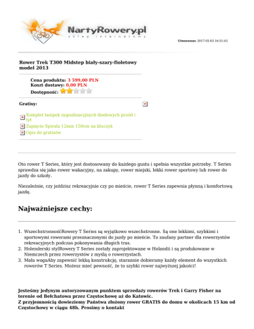 Utworzono: 2017-03-03 16:51:43 Rower Trek T300 Midstep biały-szary-fioletowy model 2013 Cena produktu: 3 599,00 PLN Koszt dostawy: 0,00 PLN Dostępność: Gratisy: Komplet lampek sygnalizacyjnych diodowych przód i tył Zapięcie Spirala 12mm 150cm na kluczyk Opis do gratisów Oto rower T Series, który jest dostosowany do każdego gustu i spełnia wszystkie potrzeby. T Series sprawdza się jako rower wakacyjny, na zakupy, rower miejski, lekki rower sportowy lub rower do jazdy do szkoły. Niezależnie, czy jeździsz rekreacyjnie czy po mieście, rower T Series zapewnia płynną i komfortową jazdę. Najważniejsze cechy: 1. WszechstronnośćRowery T Series są wyjątkowo wszechstronne. Są one lekkimi, szybkimi i sportowymi rowerami przeznaczonymi do jazdy po mieście. To zaufany partner dla rowerzystów rekreacyjnych podczas pokonywania długich tras. 2. Holenderski stylRowery T Series zostały zaprojektowane w Holandii i są produkowane w Niemczech przez rowerzystów z myślą o rowerzystach. 3. Mała wagaAby zapewnić lekką konstrukcję, starannie dobieramy każdy element do wszystkich rowerów T Series. Możesz mieć pewność, że to szybki rower najwyższej jakości! Jesteśmy jedynym autoryzowanym punktem sprzedaży rowerów Trek i Garry Fisher na terenie od Bełchatowa przez Częstochowę aż do Katowic. Z przyjemnością dowieziemy Państwa złożony rower GRATIS do domu w okolicach 15 km od Częstochowy w ciągu 48h. Prosimy o kontakt z obsługą sklepu w celu ustalenia kosztów i terminu dalszego dowozu. Sugerowana wielkość ramy według wzrostu użytkownika dla rowerów trekkingowych : Wzrost Długość nogi Rama stopy & cale cm cale +/- 1 cm +/- 2.5 cale cm 5.0+ 152 28 71 15 38 5.2+ 157 28 71 16 41 5.4+ 162 29 74 17 43 5.6+ 167 29 74 18 46 5.8+ 172 30 76 19 48 5.9+ 175 30 76 20 51 5.10+ 177 31 79 21 53 6.0+ 182 33 84 22 56 6.2+ 187 34 86 23 58 6.4+ 192 35 89 22 56 Dlaczego warto wybrać sklep NartyRowery.pl ? ● ● ● ● ● ● ● ● ● ● ● ● ● Darmowa Przesyłka Kurierska dla zamówień już od 400 PLN Szybka dostawa w 24h Możliwość zwrotu lub wymiany towaru w ciągu 10 dni od zakupu W naszym sklepie internetowym są tylko aktualnie dostępne produkty (zredukowaliśmy do minimum ryzyko braku dostępności zamówionego towaru) Możliwość negocjacji cen Częste promocje i rabaty ( obniżki cen, rabat na akcesoria, gratisy do rowerów) Fachowe doradztwo Pozytywne opinie w niezależnych serwisach m.in. Opineo, Allegro i porównywarkach cen Możliwość zakupu na raty - obsługujemy systemy Żagiel i Cetelem Sprzedajemy rowery wyregulowane i przesmarowane Do każdego zamówienia otrzymasz paragon lub fakturę stanowiący podstawę gwarancji Szczegółowe informacje o statusie zamówienia i wysyłce na adres e-mail podany w zamówieniu Obsługujemy płatności internetowe i Paypal Dołożono wszelkich starań, aby opisy i zdjęcia produktów były dokładne i aktualne. Specyfikacje i ceny mogą ulec zmianie bez uprzedzenia Płeć Widelec/ amortyzator Manetki Przeznaczenie Damski, Męski Widelec z oświetleniem Bontrager Satellite Elite, skok 45 mm Shimano, 24-biegowa Trekkingowy, City/ urban, Miejski Przerzutka przód Shimano M190 Przerzutka tył Shimano Alivio Kaseta/ wolnobieg Korbowód Pedały Piasta przód Piasta tył Shimano HG40 11-32, 8-biegowa Shimano M361, 42/32/22 VP-628 Przednia piasta Shimano Dynamo tylna piasta Shimano RM70 Obręcze obręcze Vuelta Airline III Hamulce Hamulce Shimano M422 z klamkami Shimano EF60 Szprychy b.d. Kolekcja 2013 Opony Schwalbe Road Cruiser Light, 700x35c Stery Gwintowane, częściowo zintegrowane, maszynowe, uszczelnione łożyska Mostek Kierownica Bontrager Satellite Plus, regulowany wznios Bontrager Satellite, wznios 25 mm Chwyty Bontrager Satellite Siodło Selle Royal Sfera z żelowym wyściełaniem Sztyca Amortyzowana, aluminiowa Waga b.d. Rama Alpha Platinum Aluminum z wygładzonymi spoinami Hamulce V-Brake Damper - Ilość biegów 24 Pegi b.d. Łańcuch b.d. Gwarancja Adres: http://nartyrowery.pl/ dożywotnia na ramę i 2 lata na osprzęt Telefon: 34 365 66 09, 793 61 04 29 Email: [email protected] Gadu-Gadu: Skype: