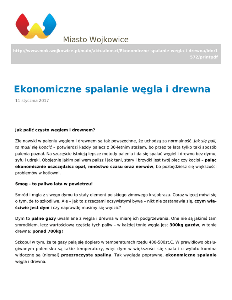 Miasto Wojkowice http://www.mok.wojkowice.pl/main/aktualnosci/Ekonomiczne-spalanie-wegla-i-drewna/idn:1 572/printpdf Ekonomiczne spalanie węgla i drewna 11 stycznia 2017 kategoria: Wojkowice Jak palić czysto węglem i drewnem? Złe nawyki w paleniu węglem i drewnem są tak powszechne, że uchodzą za normalność. Jak się pali, to musi się kopcić – potwierdzi każdy palacz z 30-letnim stażem, bo przez te lata tylko taki sposób palenia poznał. Na szczęście istnieją lepsze metody palenia i da się spalać węgiel i drewno bez dymu, syfu i udręki. Obojętnie jakim paliwem palisz i jak tani, stary i brzydki jest twój piec czy kocioł – paląc ekonomicznie oszczędzisz opał, mnóstwo czasu oraz nerwów, bo pozbędziesz się większości problemów w kotłowni. Smog - to paliwo lata w powietrzu! Smród i mgła z siwego dymu to stały element polskiego zimowego krajobrazu. Coraz więcej mówi się o tym, że to szkodliwe. Ale – jak to z rzeczami oczywistymi bywa – nikt nie zastanawia się, czym właściwie jest dym i czy naprawdę musimy się wędzić? Dym to palne gazy uwalniane z węgla i drewna w miarę ich podgrzewania. One nie są jakimś tam smrodkiem, lecz wartościową częścią tych paliw – w każdej tonie węgla jest 300kg gazów, w tonie drewna: ponad 700kg! Szkopuł w tym, że te gazy palą się dopiero w temperaturach rzędu 400-500st.C. W prawidłowo obsługiwanym palenisku są takie temperatury, więc dym w większości się spala i u wylotu komina widoczne są (niemal) przezroczyste spaliny. Tak wygląda poprawne, ekonomiczne spalanie węgla i drewna. Niestety w większości jesteśmy nauczeni tylko nieekonomicznego palenia – tj. ładowania dużych ilości paliwa prosto na żar. W efekcie takiej polityki temperatura w palenisku jest zbyt niska, aby dym mógł się spalać. Dlatego kominem wylatują siwe kłęby duszącego gazu – oparów smoły węglowej lub drzewnej. Potem wszyscy oddychamy własnym i cudzym niespalonym paliwem! Stąd właśnie biorą się niemal wszystkie problemy związane z ogrzewaniem: duże ilości sadzy, smoły, zatykanie się komina, wybuchy, wycieki smoły na ścianach komina, a przede wszystkim koszmarne marnotrawstwo paliwa, którego człowiek nawet nie jest świadom! Latami przepala tonę, dwie lub kilka ton paliwa więcej niż naprawdę potrzebuje i niczego nie podejrzewa – bo przecież wszyscy robią to samo! Ekonomiczne spalanie - jak to się robi? Ekonomiczne spalanie węgla i drewna to nic odkrywczego, po prostu przeciwieństwo marnotrawstwa. Polega na spalaniu węgla i drewna w całości, czyli wraz z palnymi gazami. Gdy owe gazy zostaną spalone, wtedy kominem nie ma prawa wylecieć nic innego jak (niemal) przejrzyste spaliny. Jest na to kilka metod: Poniższa grafika wyjaśnia, które z metod nadają się do których rodzajów kotłów i pieców. Znakomita większość kotłów i pieców na rynku (wliczając w to wszystkie kominki) to paleniska górnego spalania – z wylotem spalin u góry paleniska. W tego rodzaju urządzeniach można stosować wszystkie trzy metody czystszego palenia, z rozpalaniem od góry włącznie. W kotłach górno-dolnych bez przeróbek przeważnie nie da się palić od góry. Natomiast w kotłach dolnego spalania pali się od dołu, ponieważ jest to jakby kocioł górnego spalania rozpalony od góry i postawiony do góry nogami – ale pod warunkiem, że zasypie się dość paliwa, aby zakryć wylot spalin przy ruszcie. Rodzaje kotłów zostały dokładniej opisane w osobnym artykule. Czy warto cokolwiek zmieniać w kotłowni jeśli uważasz, że jest w miarę dobrze? Oczywiście, bo ekonomiczne palenie to niemałe oszczędności – ok. 30% opału czyli kwoty idące w setki jeśli nie tysiące złotych rocznie! Albo wyższa temperatura w domu za podobne pieniądze. Niczego nie ryzykujesz, bo zmieniasz jedynie sposób obsługi kotła, a możesz sporo zyskać. Sprawdź ile opału potrzebuje twój dom gdy spalasz efektywnie i porównaj ze swoim zużyciem — dowiesz się, ile z grubsza możesz zaoszczędzić. Dokładanie mniejszymi porcjami Wystarczy minimalna zmiana nawyków, aby tradycyjne palenie (“od dołu”) uczynić znośnym. Wściekłe kopcenie przy tym sposobie palenia jest efektem wrzucania zbyt wielkiej porcji paliwa na zbyt małą porcję żaru. Najprościej więc będzie pozbyć się kopcenia dokładając mniejszymi porcjami. Mała porcja to rzecz względna — powinna być na tyle mała, aby po dorzuceniu w kotle stale hulał ogień. Im więcej na ruszcie żaru i im intensywniej się on pali, tym więcej na raz można dołożyć bez zduszenia płomieni. Póki w kotle hula ogień, najgorsze co może wylatywać z komina to półprzejrzysty czarny dym. Nie ma mowy o gęstej siwej chmurze ani o zasmoleniu komina. Palenie kroczące Palenie kroczące można nazwać paleniem od boku, ponieważ w tym przypadku żar wędruje w poziomie. Metoda ta jest niejako kompromisem między paleniem od góry i typowym (od dołu). Umożliwia ciągłe palenie z dokładaniem ale kosztem nie całkiem czystego spalania (wciąż jednak o niebo lepszego niż przy zasypywaniu żaru grubą warstwą świeżego paliwa). Jak działa palenie kroczące? Palenie kroczące rozpoczyna się od rozpalenia niewielkiej ilości opału na ruszcie. Gdy ta porcja porządnie się rozżarzy, przegarnia się żar na tył kotła, a obok żaru dosypuje się świeżą porcję opału, tak by stykała się z żarem bokiem, ale go nie przykrywała. Świeży opał nie jest tutaj gwałtownie podgrzewany jak przy paleniu od dołu, gdyż gorące spaliny nie przelatują przez jego warstwę. Zamiast tego żar pomału obejmuje cały zasyp a uwalniane z opału substancje lotne mają szansę spalić się w wysokiej temperaturze. Zanim zasyp całkowicie się wypali, gdy na ruszcie jest jeszcze rozsądna ilość żaru, całą procedurę zaczyna się od początku. Przegarnia się pozostały żar by usunąć popiół i zgarnia go na tył