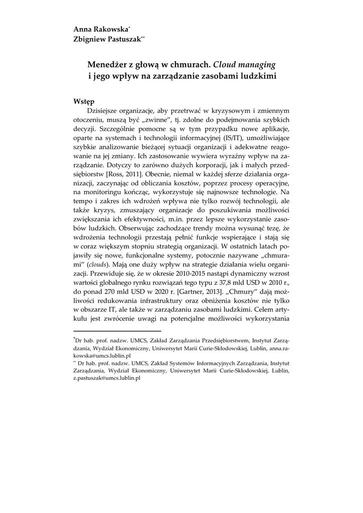 Anna Rakowska* Zbigniew Pastuszak** Menedżer z głową w chmurach. Cloud managing i jego wpływ na zarządzanie zasobami ludzkimi Wstęp Dzisiejsze organizacje, aby przetrwać w kryzysowym i zmiennym otoczeniu, muszą być „zwinne”, tj. zdolne do podejmowania szybkich decyzji. Szczególnie pomocne są w tym przypadku nowe aplikacje, oparte na systemach i technologii informacyjnej (IS/IT), umożliwiające szybkie analizowanie bieżącej sytuacji organizacji i adekwatne reagowanie na jej zmiany. Ich zastosowanie wywiera wyraźny wpływ na zarządzanie. Dotyczy to zarówno dużych korporacji, jak i małych przedsiębiorstw [Ross, 2011]. Obecnie, niemal w każdej sferze działania organizacji, zaczynając od obliczania kosztów, poprzez procesy operacyjne, na monitoringu kończąc, wykorzystuje się najnowsze technologie. Na tempo i zakres ich wdrożeń wpływa nie tylko rozwój technologii, ale także kryzys, zmuszający organizacje do poszukiwania możliwości zwiększania ich efektywności, m.in. przez lepsze wykorzystanie zasobów ludzkich. Obserwując zachodzące trendy można wysunąć tezę, że wdrożenia technologii przestają pełnić funkcje wspierające i stają się w coraz większym stopniu strategią organizacji. W ostatnich latach pojawiły się nowe, funkcjonalne systemy, potocznie nazywane „chmurami” (clouds). Mają one duży wpływ na strategie działania wielu organizacji. Przewiduje się, że w okresie 2010-2015 nastąpi dynamiczny wzrost wartości globalnego rynku rozwiązań tego typu z 37,8 mld USD w 2010 r., do ponad 270 mld USD w 2020 r. [Gartner, 2013]. „Chmury” dają możliwości redukowania infrastruktury oraz obniżenia kosztów nie tylko w obszarze IT, ale także w zarządzaniu zasobami ludzkimi. Celem artykułu jest zwrócenie uwagi na potencjalne możliwości wykorzystania * Dr hab. prof. nadzw. UMCS, Zakład Zarządzania Przedsiębiorstwem, Instytut Zarządzania, Wydział Ekonomiczny, Uniwersytet Marii Curie-Skłodowskiej, Lublin, [email protected] ** Dr hab. prof. nadzw. UMCS, Zakład Systemów Informacyjnych Zarządzania, Instytut Zarządzania, Wydział Ekonomiczny, Uniwersytet Marii Curie-Skłodowskiej, Lublin, [email protected] 344 Anna Rakowska, Zbigniew Pastuszak systemów typu „chmura” w organizacji oraz opis potencjalnego wpływu tych systemów na sukces organizacji. Przygotowanie artykułu zostało dofinansowane ze środków grantu MNiSW pt.: Kompetencje i kultura organizacyjna przedsiębiorstw innowacyjnych w perspektywie międzynarodowej (2011-2014, nr 102561). 1. „Chmura” i „zarządzanie w chmurze” W ogólnym ujęciu, chmura obliczeniowa (cloud computing) jest rozwiązaniem obliczeniowym opartym na użytkowaniu usług dostarczonych przez zewnętrznego usługodawcę, stosującego zewnętrzne oprogramowanie i infrastrukturę informatyczną [NIST, 2011]. Rozwiązane takie eliminuje wiele elementów niezbędnych w przypadku tradycyjnego podejścia do wykorzystania technologii informacyjnych w organizacji, a w szczególności: konieczność zakupu i posiadania licencji oprogramowania, instalację oprogramowania, tworzenie specjalistycznej infrastruktury IT, administrowanie oprogramowaniem, itp. Współczesne modele chmury obliczeniowej odwołują się do rozwiązań opartych na sieci grid, tj. sieci rozproszonych, integrujących i zarządzających zasobami znajdującymi się pod kontrolą różnorodnych domen, i połączonymi siecią komputerową. Prekursorem tego typu rozwiązań jest inicjatywa SETI (Search for Extra-Terrestrial Intelligence), mającą na celu przyspieszenie poszukiwań śladów życia we Wszechświecie [Minoli, 2005, ss. 7-10]. Typowe rozwiązanie cloud computing opiera się na dostępie użytkowników indywidualnych i (lub) instytucjonalnych, do aplikacji o różnym charakterze, rozwijanych przez podmioty zewnętrzne w ramach tzw. IDE (Integrated Development Environment), oferujących składowanie i przetwarzanie danych, gwarantujących ich bezpieczeństwo, a także adekwatną do oczekiwań użytkownika wielkość infrastruktury informatycznej (tj. jej pojemność i poziom rozwoju) oraz możliwość odzyskania danych i tworzenia kopii bezpieczeństwa [Furht, Escalante, 2010, s. 3]. Do prekursorskich rozwiązań w tym zakresie należy zaliczyć m.in. system AWS – Amazon Web Services (Amazon.com z 2006 r.), GAE – Google App. Engine (Google, 2008), Blue Cloud (IBM, 2008), czy np. Azure (Microsoft, 2009). Rozwiązania cloud computing oraz – bardziej zaawansowane – cloud services (usług w chmurze) – posiadają szereg atrybutów, z których najistotniejszymi są [Furht, Escalante, 2010, s. 8; IDC, 2013a]: Menedżer z głową w chmurach. Cloud managing i jego wpływ… 345 udział tzw. 3PP (Third-party Provider) – dostawcy usług zewnętrznych, – dostęp przez Internet, w oparciu o uniwersalne sieci informatyczne, – minimalne, lub żadne wymogi w zakresie umiejętności informatycznych użytkownika, – „skrojenie na miarę”, tj. maksymalne dostosowanie do wymagań użytkownika i ich aktualizowanie w czasie rzeczywistym, – przystępny cennik usług – oparty przede wszystkim na czasie wykorzystania usługi, – interfejs użytkownika – uniwersalny, umożliwiający wykorzystanie różnorodnych urządzeń stacjonarnych i mobilnych, z jednoczesnym uwzględnieniem i elastycznym dopasowaniem systemu do ich możliwości technicznych, – współdzielenie zasobów – z jednoczesnym ich dostosowaniem do potrzeb i oczekiwań użytkownika. Koszty użytkowania rozwiązań typu „chmura” są uzależnione od szeregu parametrów, z których najistotniejsze są m.in. [Furht, Escalante, 2010, s. 15]: – składowanie danych – 3-5 gr. za GB/miesiąc (przy kursie 3,2 PLN/USD), – transfer danych wychodzących – 3-6 gr./GB, – transfer danych przychodzących – 3 gr./GB, – czynsz za użytkowanie oprogramowania – od 3 gr./godz. Pomimo licznych, zagranicznych publikacji odwołujących się do 