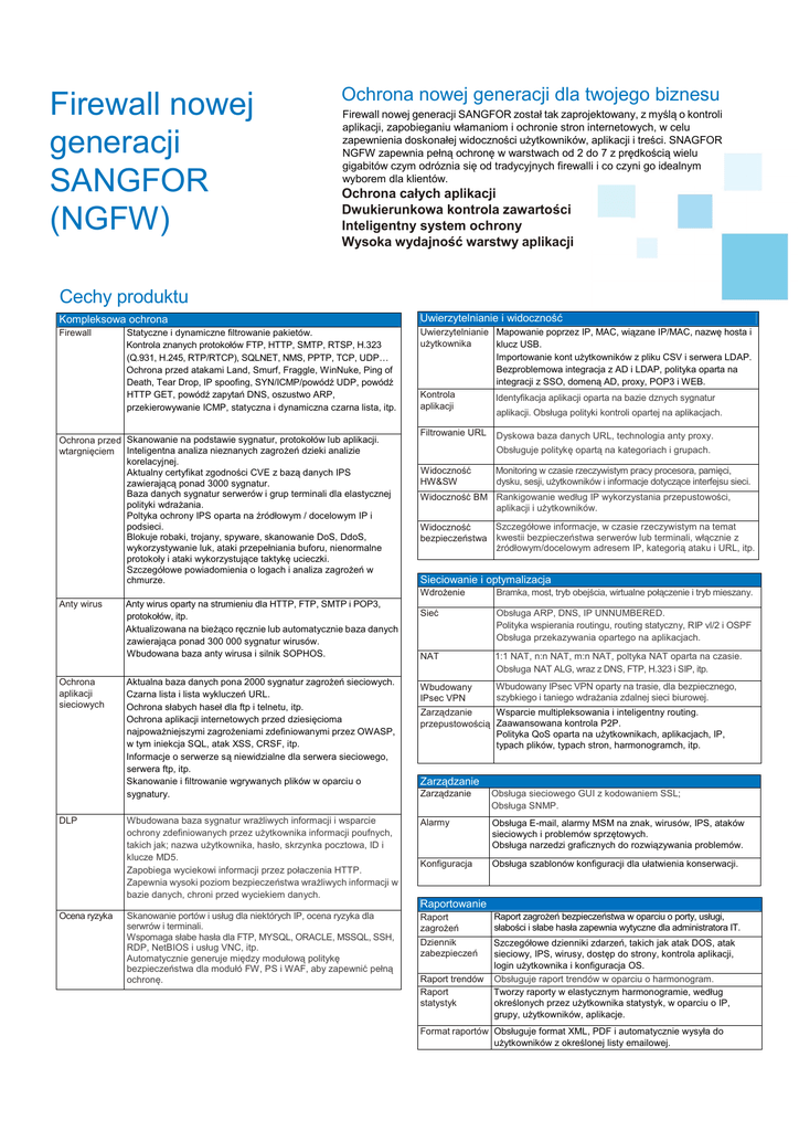 Firewall nowej generacji SANGFOR (NGFW) Ochrona nowej generacji dla twojego biznesu Firewall nowej generacji SANGFOR został tak zaprojektowany, z myślą o kontroli aplikacji, zapobieganiu włamaniom i ochronie stron internetowych, w celu zapewnienia doskonałej widoczności użytkowników, aplikacji i treści. SNAGFOR NGFW zapewnia pełną ochronę w warstwach od 2 do 7 z prędkością wielu gigabitów czym odróznia się od tradycyjnych firewalli i co czyni go idealnym wyborem dla klientów. Ochrona całych aplikacji Dwukierunkowa kontrola zawartości Inteligentny system ochrony Wysoka wydajność warstwy aplikacji Cechy produktu Kompleksowa ochrona Uwierzytelnianie i widoczność yFirewall Uwierzytelnianie Mapowanie poprzez IP, MAC, wiązane IP/MAC, nazwę hosta i użytkownika klucz USB. Importowanie kont użytkowników z pliku CSV i serwera LDAP. Bezproblemowa integracja z AD i LDAP, polityka oparta na integracji z SSO, domeną AD, proxy, POP3 i WEB. Kontrola Identyfikacja aplikacji oparta na bazie dznych sygnatur aplikacji aplikacji. Obsługa polityki kontroli opartej na aplikacjach. Statyczne i dynamiczne filtrowanie pakietów. Kontrola znanych protokołów FTP, HTTP, SMTP, RTSP, H.323 (Q.931, H.245, RTP/RTCP), SQLNET, NMS, PPTP, TCP, UDP… Ochrona przed atakami Land, Smurf, Fraggle, WinNuke, Ping of Death, Tear Drop, IP spoofing, SYN/ICMP/powódź UDP, powódź HTTP GET, powódź zapytań DNS, oszustwo ARP, przekierowywanie ICMP, statyczna i dynamiczna czarna lista, itp. Ochrona przed Skanowanie na podstawie sygnatur, protokołów lub aplikacji. wtargnięciem Inteligentna analiza nieznanych zagrożeń dzieki analizie korelacyjnej. Aktualny certyfikat zgodności CVE z bazą danych IPS zawierającą ponad 3000 sygnatur. Baza danych sygnatur serwerów i grup terminali dla elastycznej polityki wdrażania. Poltyka ochrony IPS oparta na źródłowym / docelowym IP i podsieci. Blokuje robaki, trojany, spyware, skanowanie DoS, DdoS, wykorzystywanie luk, ataki przepełniania buforu, nienormalne protokoły i ataki wykorzystujące taktykę ucieczki. Szczegółowe powiadomienia o logach i analiza zagrożeń w chmurze. Anty wirus Ochrona aplikacji sieciowych DLP Ocena ryzyka Anty wirus oparty na strumieniu dla HTTP, FTP, SMTP i POP3, protokołów, itp. Aktualizowana na bieżąco ręcznie lub automatycznie baza danych zawierająca ponad 300 000 sygnatur wirusów. Wbudowana baza anty wirusa i silnik SOPHOS. Aktualna baza danych pona 2000 sygnatur zagrożeń sieciowych. Czarna lista i lista wykluczeń URL. Ochrona słabych haseł dla ftp i telnetu, itp. Ochrona aplikacji internetowych przed dziesięcioma najpoważniejszymi zagrożeniami zdefiniowanymi przez OWASP, w tym iniekcja SQL, atak XSS, CRSF, itp. Informacje o serwerze są niewidzialne dla serwera sieciowego, serwera ftp, itp. Skanowanie i filtrowanie wgrywanych plików w oparciu o sygnatury. Filtrowanie URL Dyskowa baza danych URL, technologia anty proxy. Obsługuje politykę opartą na kategoriach i grupach. Widoczność HW&SW Monitoring w czasie rzeczywistym pracy procesora, pamięci, dysku, sesji, użytkowników i informacje dotyczące interfejsu sieci. Widoczność BM Rankigowanie według IP wykorzystania przepustowości, aplikacji i użytkowników. Szczegółowe informacje, w czasie rzeczywistym na temat Widoczność bezpieczeństwa kwestii bezpieczeństwa serwerów lub terminali, włącznie z żródłowym/docelowym adresem IP, kategorią ataku i URL, itp. Sieciowanie i optymalizacja Wdrożenie Bramka, most, tryb obejścia, wirtualne połączenie i tryb mieszany. Sieć Obsługa ARP, DNS, IP UNNUMBERED. Polityka wspierania routingu, routing statyczny, RIP vl/2 i OSPF Obsługa przekazywania opartego na aplikacjach. NAT 1:1 NAT, n:n NAT, m:n NAT, poltyka NAT oparta na czasie. Obsługa NAT ALG, wraz z DNS, FTP, H.323 i SIP, itp. Wbudowany IPsec VPN Wbudowany IPsec VPN oparty na trasie, dla bezpiecznego, szybkiego i taniego wdrażania zdalnej sieci biurowej. Wsparcie multipleksowania i inteligentny routing. Zarządzanie przepustowością Zaawansowana kontrola P2P. Polityka QoS oparta na użytkownikach, aplikacjach, IP, typach plików, typach stron, harmonogramch, itp. Zarządzanie Zarządzanie Obsługa sieciowego GUI z kodowaniem SSL; Obsługa SNMP. Wbudowana baza sygnatur wrażliwych informacji i wsparcie ochrony zdefiniowanych przez użytkownika informacji poufnych, takich jak; nazwa użytkownika, hasło, skrzynka pocztowa, ID i klucze MD5. Zapobiega wyciekowi informacji przez połaczenia HTTP. Zapewnia wysoki poziom bezpieczeństwa wrażliwych informacji w bazie danych, chroni przed wyciekiem danych. Alarmy Obsługa E-mail, alarmy MSM na znak, wirusów, IPS, ataków sieciowych i problemów sprzętowych. Obsługa narzedzi graficznych do rozwiązywania problemów. Konfiguracja Obsługa szablonów konfiguracji dla ułatwienia konserwacji. Skanowanie portów i usług dla niektórych IP, ocena ryzyka dla serwrów i terminali. Wspomaga słabe hasła dla FTP, MYSQL, ORACLE, MSSQL, SSH, RDP, NetBIOS i usług VNC, itp. Automatycznie generuje między modułową politykę bezpieczeństwa dla modułó FW, PS i WAF, aby zapewnić pełną ochronę. Raport zagrożeń Raport zagrożeń bezpieczeństwa w oparciu o porty, usługi, słabości i słabe hasła zapewnia wytyczne dla administratora IT. Dziennik zabezpieczeń Szczegółowe dzienniki zdarzeń, takich jak atak DOS, atak sieciowy, IPS, wirusy, dostęp do strony, kontrola aplikacji, login użytkownika i konfiguracja OS. Obsługuje raport trendów w oparciu o harmonogram. Tworzy raporty w elastycznym harmonogramie, według określonych przez użytkownika statystyk, w oparciu o IP, grupy, użytkowników, aplikacje. Raportowanie Raport trendów Raport statystyk Format raportów Obsługuje format XML, PDF i automatycznie wysyła do użytkowników z określonej listy emailowej. Firewall nowej generacji SANGFOR (NGFW) Rodzina produktów Model S5000-F-I M5000-F-I M5100-F-I M5200-F-I M5300-F-I M5400-F-