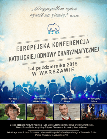 „Przyszedłem ogień rzucić na ziemię!” (Łk. 12, 49) A J C N E R E F ON K A K S J E P O EUR J E N Z C Y T A M Z Y AR H C Y W O N D O KATOLICKIEJ 015 2 a k i n r e i z 1-4 paźd wie a z s r a w W Mary Healy (USA) Michelle Moran (Wielka Brytania) Johannes Hartl (Niemcy) Mocni w Duchu (Polska) Goście specjalni: Kardynał Kazimierz Nycz, Biskup Józef Górzyński, Biskup Bronisław Dembowski, Biskup Roman Pindel, Arcybiskup Zbigniew Stankiewicz, Arcybiskup Kevin McDonald Lokalizacja: Aula Roberta Schumana, Uniwersytet Kardynała Stefana Wyszyńskiego w Warszawie, Polska (Adres: Warszawa, ul. Wóycickiego 1/3) CJA N E R E F N O K A EUROPEJSK YCZNEJ T A M Z Y R A H C DNOWY O J E I K C I L O T A K rnika 2015 1-4 paździe z a w i e w Wa r s MÓWCY Dr. Mary Healy wykłada Pismo Święte w Wyższym Seminarium Najświętszego Serca w Detroit, Michigan (USA) oraz przewodniczy Komisji Doktrynalnej ICCRS. Jest cenionym mówcą zarówno w kraju jak i zagranicą i z wielką pasją służy Duchowi Świętemu w Kościele. Michelle Moran, Prezydent ICCRS, znana Odnowie Charyzmatycznej na całym świecie jako inspirująca prelegentka i nauczycielka. Dr. Johannes Hartl jest założycielem i liderem Domu Modlitwy w Augsburgu (Niemcy). Johannes jest inspirującym mówcą nauczającym na seminariach i konferencjach w całej Europie. OPŁATA REJESTRACYJNA 645 zł 430 zł Dla uczestników z: Austrii, Belgii, Danii, Finlandii, Francji, Niemiec, Giblartaru, Irlandii, Islandii, Włoch, Luksemburga, Malty, Niderlandów, Norwegii, Portugalii, Hiszpanii, Szwecji, Szwajcarii, Turcji, Wielkiej Brytanii Dla uczestników z: Albanii, Białorusi, Bośni i Hercegowiny, Bułgarii, Chorwacji, Cypru, Republiki Czeskiej, Estonii, Grecji, Węgier, Litwy, Łotwy, Mołdawii, Rumunii, Serbii, Słowacji, Słowenii, Ukrainy i Polski. Proszę wziąć pod uwagę że: Ostateczny termin wpłat (z opłatą dodatkową- patrz formularz zgłoszeń) upływa 1 września 2015. Od osób wycofujących się po tym terminie będziemy zmuszeni pobierać opłaty: • do dnia 31 sierpnia zwrot bez potrąceń • 1 - 15 września : 50% potrącenia • od 15 września: 100% potrącenia (brak zwrotu) ZAKWATEROWANIE Proponujemy miejsca o różnych standardach i cenach w hotelach i domach rekolekcyjnych. Poniższe możliwości są dostępne w kolejności zgłosze: ceny za 1 noc od osoby (*) Cena pokoju Cena za miejsce w Cena za miejsce w jednoosobowego pokoju 2-3 osobowym pokoju wieloosobowym Hotel typu A 155 zł 99 zł --- Dom Rekolekcyjny typu B 99 zł 73 zł 56 zł Dom Rekolekcyjny typu C 78 zł 56 zł 47,5 zł (*) w cenie noclegu wliczone jest śniadanie Informacje POSIŁKI zgłoszeniowy, pkt. 1) Podczas trwania obrad Konferencji zapewniamy obiady, kolacje a w przerwach dostęp do kawy, herbaty, ciastek. Cena 215 zł za komplet posiłków od osoby. Jeśli wpłacisz później niż 31.VIII.2015 r. prosimy o zabranie ze sobą potwierdzenia dokonanej płatności. TRANSPORT Fundacja KZK Katolickiej Odnowy w Duchu Św. ul. Ks. Słojewskiego 19, 05-552 Magdalenka Meritum Bank 51 1300 0000 2076 7148 2402 0001 W dniach 1-4 października zapewniamy transport z miejsca zakwaterowania na obrady i z powrotem po ich zakończeniu. Koszt 95 zł od osoby. ODBIÓR Z LOTNISKA/ DWORCA PKP Możemy odebrać przylatujących na lotnisko Chopina 1 października i odwieźć 4 października. Podobnie z dworca PKP Warszawa Centralna. Koszt 43 zł od osoby. ZWIEDZANIE POLSKI Dla gości zagranicznych proponujemy po zakończeniu Konferencji pielgrzymkę do Częstochowy lub wycieczkę do Częstochowy, Krakowa, Łagiewnik i Wieliczki – szczegółowe informacje można uzyskać mailowo. Design: www.kreativbuero-sued.de LOKALIZACJA Konferencja odbędzie się w Auli Roberta Szumana na Uniwersytecie Kardynała Stefana Wyszyńskiego w Warszawie przy ul. Wóycickiego 1/3. Prosimy o wpłacanie należności w jednej transzy na poniższe konto: W tytule wpłaty prosimy wpisać: darowizna na cele statutowe - konferencja ICCRS Jeśli płacisz za więcej niż jedną osobę, zaznacz wyraźnie nazwiska i kwoty w tytule wpłaty, tak abyśmy mogli zarejestrować opłatę każdego z uczestników! REJESTRACJA UCZESTNIKÓW Prosimy o przysłanie kompletnie wypełnionego formularza zgłoszeń na adres pocztowy lub mailowy: [email protected] Fundacja KZK ul. Ks. Słojewskiego 19 05-552 Magdalenka Jeśli masz pytania prosimy o kontakt drogą mailową (opcja preferowana), lub na nr telefonu: 0048 884 808 220 * formularz zgłoszeniowy jest zamieszczony na stronie www.odnowa.org PŁATNOŚCI Ze względów organizacyjnych prosimy o sfinalizowanie płatności do 28.II.2015. Płatność w terminie późniejszym wiąże się z dodatkowymi kosztami (patrz formularz www.iccrs.org www.odnowa.org