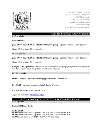 Ośrodek Teatralny KANA pl. św.św. Piotra i Pawła 4/5 70-521 Szczecin tel. +48 91 4330388 email: [email protected] www.kana.art.pl www.facebook.com/teatrkana Ośrodek Teatralny KANA w grudniu 6 – 7 grudnia PREMIERA!!! godz 19:00 Teatr KANA i KREPSKO theatre group – spektakl “Hotel Misery deLuxe” bilety: 15 zł. ulgowe, 20 zł. normalne 10 – 14 grudnia godz 19:00 Teatr KANA i KREPSKO theatre group – spektakl “Hotel Misery deLuxe” bilety: 15 zł. ulgowe, 20 zł. normalne Uwaga! 12.12 – premiera studencka! Za okazaniem ważnej legitymacji studenckiej bilety w tym dniu w cenie 10 zł. Po spektaklu spotkanie z artystami. 14 – 15 grudnia Wokół Tradycji / Spotkanie z tradycją adwentową i kolędniczą 14 – 15.12 warsztaty kolędnicze Scholi Teatru Węgajty Koszt uczestnictwa w warsztatach: 50 zł Zapisy na warsztaty: [email protected] JUŻ NA POCZĄTKU STYCZNIA W TEATRZE KANA!!! 3 – 4 stycznia Projekt OFFenes Berlin 03.01. Piątek 18.00 cobratheater.cobra – spektakl „VICE VERSA” \ sala Teatru Kana 19.30 cobratheater.cobra – spektakl „VICE VERSA” \ sala Teatru Kana 21.00 koncert zespołu DYZMATRONIC \ Piwnica Kany 04.01. Sobota godz. 15.00 Warsztaty dla organizatorów festiwali: Anne Herwanger godz. 18.00 cobratheater.cobra – spektakl „VICE VERSA” \ sala Teatru Kana godz. 19.30 cobratheater.cobra – spektakl „VICE VERSA” \ sala Teatru Kana godz. 21.00 koncert DICTAPHONE \ sala Teatru Kana 16 – 19 stycznia Warsztaty "Zapominanie ciała". Prowadzenie: Przemysław Błaszczaka – Teatr ZAR 16 i 17 stycznia od 17-21.00 (czwartek i piątek) 18 i 19 stycznia od 11-16.30 (sobota i niedziela) koszt 220 zł za 20 godzin, od osoby za cały kurs / brak możliwości wzięcia udziału w części kursu zapisy: [email protected] lub telefonicznie 91 433 03 88 6 – 7 grudnia, godz. 19:00 Premiera Teatru KANA i KREPSKO theatre group – spektakl “Hotel Misery deLuxe” Witamy w sławnym niegdyś Hotelu Misery deLuxe, oferującym swym gościom unikalny widok na morze straconych nadziei, minionych miłości i radości. Każdy stworzony z pasją pokój wyposażono w telewizor, smutną klimatyzację i wesołą obsługę hotelową. Pokoje w hotelu urządzone zostały wyłącznie słodkimi łzami, śladami miłości i cieniami przelotnych związków. Naszym gościom gwarantujemy niezapomniany pobyt z dala od domu oraz doskonałą październikową pogodę, również w lipcu. Zapraszamy do rozkoszowania się pięciogwiazdkowym dramatem w dwugwiazdkowej cenie. W dni deszczowe atrakcyjne zniżki. Czekamy na Ciebie. Specjalność sezonu: utracona chwała i stałe zachmurzenie z serdecznymi pozdrowieniami - pracownicy hotelu: Menedżer recepcji: Linnea Happonen Obsługa hotelowa: Bibianna Chimiak, Dariusz Mikuła, Karolina Sabat, Piotr Starzyński, Jiří Zeman Pokojówka: Andrea Szakál Muzyka w holu: Mayim Alpert Elektryk hotelowy: Kauri Klemelä współkonserwacja: Teatr KANA i KREPSKO theatre group inni współpracownicy sezonowi: Philip Holm, Ville Niska, Patrik Sedlák, Lukáš Teklý, Tony Wallius Międzynarodowa grupa teatralna KREPSKO powstała w Pradze w 2001r. Zaczynając od wymagających odwagi, przekraczających prawo improwizacji KREPSKO stworzyło własny, unikalny język teatralny oparty na magicznej atmosferze, mrocznych baśniach i absurdalnych, tragikomicznych momentach. KREPSKO często zapożycza z cyrku i teatru lalek, aby opowiedzieć historię bez pomocy słów i dosięgnąć najgłębszych sekretów, emocji widza. KREPSKO wykreowało ponad dwadzieścia spektakli prezentowanych na całym świecie zdobywając liczne nagrody. Nasz hotel istnieje od wieków dzięki uprzejmości i wsparciu Międzynarodowego Funduszu Wyszehradzkiego, Miasta Szczecina oraz Samorządu Województwa Zachodniopomorskiego. bilety: 15 zł. ulgowe, 20 zł. normalne Pokazy popremierowe: codziennie 10 – 14 grudnia, godz. 19:00 Uwaga! 12.12 – premiera studencka! Za okazaniem ważnej legitymacji studenckiej bilety w tym dniu w cenie 10 zł. Po spektaklu spotkanie z artystami. 14 – 15 grudnia, Projekt „Wokół Tradycji” Spotkanie z tradycją adwentową i kolędniczą Ostatnia w tym roku edycja projektu zostanie poświęcona tradycjom związanym z okresem adwentu i Bożego Narodzenia. W ramach kilkudniowych warsztatów prowadzonych przez członków Scholi Teatru Węgajty będzie można zapoznać się ze źródłami tradycji muzycznej czasu Bożego Narodzenia – program warsztatów obejmie zarówno fragmenty chorału gregoriańskiego, śpiew bizantyjski, średniowieczne włoskie laudy, jak i stary, niemal zapomniany repertuar kolęd łacińskich, polskich, niemieckich i ukraińskich zachowany częściowo w tradycji ludowej. Koszt uczestnictwa w warsztatach: 50 zł, ilość miejsc ograniczona (zapisy na [email protected] lub nr tel. 914330388, 914341561) SCHOLA TEATRU WĘGAJTY powstała w styczniu 1994 roku i działa w ramach Stowarzyszenia Teatr Węgajty i Centrum Edukacji i Inicjatyw Kulturalnych w Olsztynie. Zespół tworzą śpiewacy, aktorzy, muzycy, plastycy, teatrolodzy i muzykolodzy pochodzący z 6 krajów europejskich. Schola zajmuje się rekonstrukcją średniowiecznych dramatów liturgicznych, prezentacjami muzycznoteatralnymi, badaniami nad tradycjami śpiewu liturgicznego, sakralnego, tradycją ludową i antropologią kultury. Projekt "Wokół Tradycji" zrodził się z naszego przekonania, że tożsamość, wiedza i poczucie przynależności do określonej tradycji są jednym z najważniejszych czynników społecznych i kulturotwórczych, kształtujących zarówno osobowość jednostek jak i zachowania całych grup społecznych. Cykl "Wokół Tradycji" jest projektem artystycznym i edukacyjno-badawczym, stanowiącym zarówno próbę ukazania i udokumentowania zanikających systemów zachowań, obrzędów i praktyk tradycyjnych, które występowały do niedawna dość powszechnie na różnych obszarach Polski, jak i odpowiedzi na ważne dla nas pytania o wsp