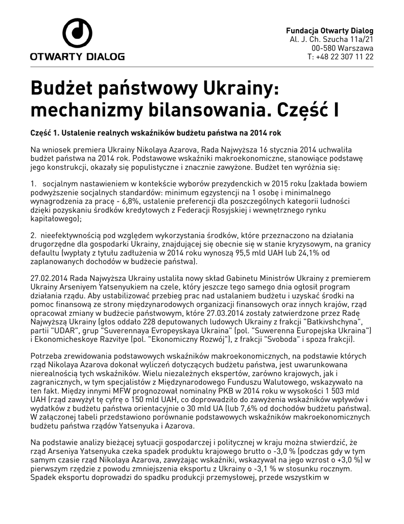 Fundacja Otwarty Dialog Al. J. Ch. Szucha 11a/21 00-580 Warszawa T: +48 22 307 11 22 Budżet państwowy Ukrainy: mechanizmy bilansowania. Część I Część 1. Ustalenie realnych wskaźników budżetu państwa na 2014 rok Na wniosek premiera Ukrainy Nikolaya Azarova, Rada Najwyższa 16 stycznia 2014 uchwaliła budżet państwa na 2014 rok. Podstawowe wskaźniki makroekonomiczne, stanowiące podstawę jego konstrukcji, okazały się populistyczne i znacznie zawyżone. Budżet ten wyróżnia się: 1. socjalnym nastawieniem w kontekście wyborów prezydenckich w 2015 roku (zakłada bowiem podwyższenie socjalnych standardów: minimum egzystencji na 1 osobę i minimalnego wynagrodzenia za pracę - 6,8%, ustalenie preferencji dla poszczególnych kategorii ludności dzięki pozyskaniu środków kredytowych z Federacji Rosyjskiej i wewnętrznego rynku kapitałowego); 2. nieefektywnością pod względem wykorzystania środków, które przeznaczono na działania drugorzędne dla gospodarki Ukrainy, znajdującej się obecnie się w stanie kryzysowym, na granicy defaultu (wypłaty z tytułu zadłużenia w 2014 roku wynoszą 95,5 mld UAH lub 24,1% od zaplanowanych dochodów w budżecie państwa). 27.02.2014 Rada Najwyższa Ukrainy ustaliła nowy skład Gabinetu Ministrów Ukrainy z premierem Ukrainy Arseniyem Yatsenyukiem na czele, który jeszcze tego samego dnia ogłosił program działania rządu. Aby ustabilizować przebieg prac nad ustalaniem budżetu i uzyskać środki na pomoc finansową ze strony międzynarodowych organizacji finansowych oraz innych krajów, rząd opracował zmiany w budżecie państwowym, które 27.03.2014 zostały zatwierdzone przez Radę Najwyższą Ukrainy (głos oddało 228 deputowanych ludowych Ukrainy z frakcji "Batkivshchyna", partii "UDAR", grup "Suverennaya Evropeyskaya Ukraina" (pol. "Suwerenna Europejska Ukraina") i Ekonomicheskoye Razvitye (pol. "Ekonomiczny Rozwój"), z frakcji "Svoboda" i spoza frakcji). Potrzeba zrewidowania podstawowych wskaźników makroekonomicznych, na podstawie których rząd Nikolaya Azarova dokonał wyliczeń dotyczących budżetu państwa, jest uwarunkowana nierealnością tych wskaźników. Wielu niezależnych ekspertów, zarówno krajowych, jak i zagranicznych, w tym specjalistów z Międzynarodowego Funduszu Walutowego, wskazywało na ten fakt. Między innymi MFW prognozował nominalny PKB w 2014 roku w wysokości 1 503 mld UAH (rząd zawyżył tę cyfrę o 150 mld UAH, co doprowadziło do zawyżenia wskaźników wpływów i wydatków z budżetu państwa orientacyjnie o 30 mld UA (lub 7,6% od dochodów budżetu państwa). W załączonej tabeli przedstawiono porównanie podstawowych wskaźników makroekonomicznych budżetu państwa rządów Yatsenyuka i Azarova. Na podstawie analizy bieżącej sytuacji gospodarczej i politycznej w kraju można stwierdzić, że rząd Arseniya Yatsenyuka czeka spadek produktu krajowego brutto o -3,0 % (podczas gdy w tym samym czasie rząd Nikolaya Azarova, zawyżając wskaźniki, wskazywał na jego wzrost o +3,0 %) w pierwszym rzędzie z powodu zmniejszenia eksportu z Ukrainy o -3,1 % w stosunku rocznym. Spadek eksportu doprowadzi do spadku produkcji przemysłowej, przede wszystkim w dziedzinach nastawionych na eksport, a więc w przemyśle metalurgicznym, maszynowym, chemicznym. Z powodu rozpoczętej przez Rosję wojny handlowej oczekuje się zmniejszenia produkcji w branży spożywczej (dodatkowy 1% spadku). Porównanie wskaźników makroekonomicznych i wskaźników budżetu państwowego Ukrainy na 2014 rok, zgłoszonych przez stary i nowy rząd Jednakże uwzględniając wojskową interwencję Rosji w Autonomicznej Republice Krymskiej, destabilizację sytuacji na wschodzie Ukrainy i rozpoczęcie wojny handlowej z Federacją Rosyjską, uściślone makrowskaźniki założone przez rząd Arseniya Yatsenyuka, wyglądają na realistyczne, chociaż są bardziej optymistyczne niż można się było spodziewać, gdyż spadek PKB i produkcji przemysłowej może być większy. Rząd Arseniya Yatsenyuka podjął niepopularną decyzję w sprawie zmniejszenia wydatków z budżetu państwa o kwotę 25,5 mld UAH (lub o 5,8 % wskaźnika dochodów budżetu państwowego), zmniejszenia dochodów o kwotę 22,4 5 mld UAH (lub o 6,0 % wskaźnika dochodów budżetu państwowego) i zmniejszenia deficytu budżetowego o 3,0 mld UAH (do 68,5 mld UAH). Za to zwiększony został wskaźnik maksymalnej wielkości państwowego długu publicznego o 78,6 mld UAH (do kwoty 664 mld UAH lub 43,5 % PKB), kosztem: udzielenia w 2014 roku przez międzynarodowe organizacje finansowe i państwa trzecie środków kredytowych przeznaczonych na stabilizację gospodarki, w kwocie 38,1 mld UAH; udzielenie rządowi prawa do wypuszczania obligacji wewnętrznej pożyczki państwowej powyżej limitów ustalonych w załączniku Nr 2 do budżetu (z wykupem tych obligacji przez państwo w zamian za akcje dodatkowej emisji banków państwowych) zwrot podatku VAT płatnikom (zadeklarowanego do zwrotu do dnia 1 stycznia 2014 po wcześniejszym potwierdzeniu tego faktu w postaci kontroli) w formie zobowiązania do wypuszczenia obligacji wewnętrznej pożyczki państwowej ### Viktor Mazyarchuk Ekspert w dziedzinie zarządzania instytucjami publicznymi Wykształcenie: Lwowska Akademia Handlowa – magister w zakresie "Międzynarodowych stosunków gospodarczych". Harvardzki Instytut Administracji Państwowej im. Johna F. Kennedy – Szkolenie kadry zarządzającej Zajmował różne stanowiska w komerycyjnych firmach działających w dziedzinie consultingu inwestycyjnego i zarządzania projektami. Od 2010 do 2013 roku był zatrudniony w służbie państwowej, jako doradca ministra gospodarki Ukrainy, zastępca dyrektota Departamentu Bezpieczeństwa Finansowego Ministerstwa Sytuacji Nadzywczajnych Ukrainy i zastępca dyrektora Państwowej Agencji do spraw Inwestycji i Zarządzania Narodowymi Projektami Ukrainy. Volodymyr Panchenko Wykształcenie: Uzyskał stopie
