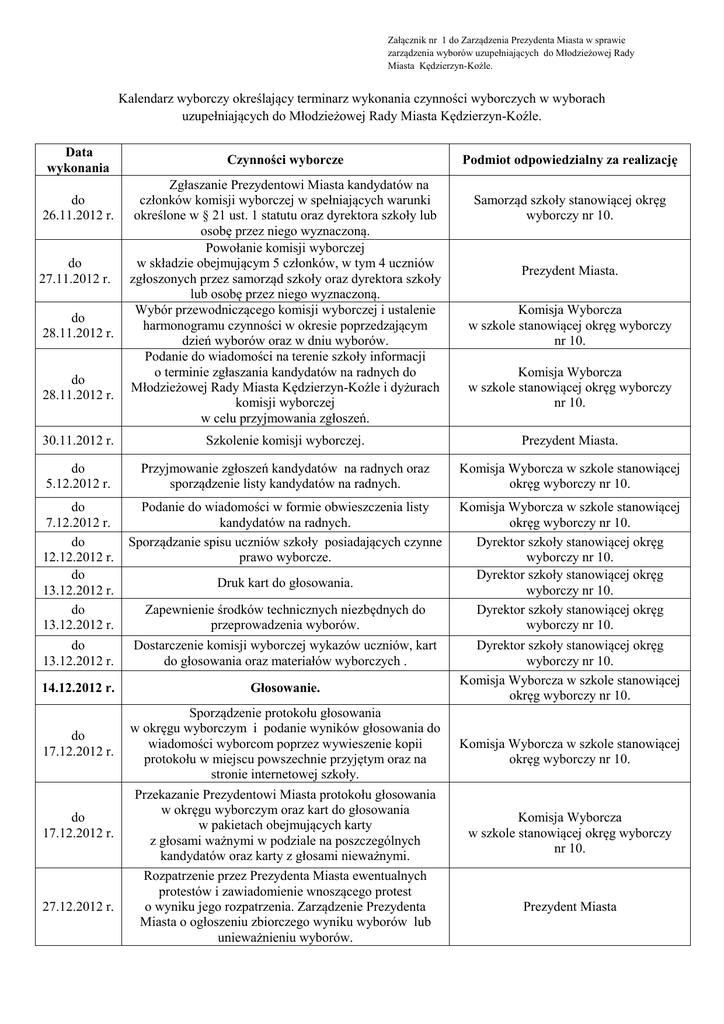Załącznik nr 1 do Zarządzenia Prezydenta Miasta w sprawie zarządzenia wyborów uzupełniających do Młodzieżowej Rady Miasta Kędzierzyn-Koźle. Kalendarz wyborczy określający terminarz wykonania czynności wyborczych w wyborach uzupełniających do Młodzieżowej Rady Miasta Kędzierzyn-Koźle. Data wykonania do 26.11.2012 r. do 27.11.2012 r. do 28.11.2012 r. do 28.11.2012 r. Czynności wyborcze Zgłaszanie Prezydentowi Miasta kandydatów na członków komisji wyborczej w spełniających warunki określone w § 21 ust. 1 statutu oraz dyrektora szkoły lub osobę przez niego wyznaczoną. Powołanie komisji wyborczej w składzie obejmującym 5 członków, w tym 4 uczniów zgłoszonych przez samorząd szkoły oraz dyrektora szkoły lub osobę przez niego wyznaczoną. Wybór przewodniczącego komisji wyborczej i ustalenie harmonogramu czynności w okresie poprzedzającym dzień wyborów oraz w dniu wyborów. Podanie do wiadomości na terenie szkoły informacji o terminie zgłaszania kandydatów na radnych do Młodzieżowej Rady Miasta Kędzierzyn-Koźle i dyżurach komisji wyborczej w celu przyjmowania zgłoszeń. Podmiot odpowiedzialny za realizację Samorząd szkoły stanowiącej okręg wyborczy nr 10. Prezydent Miasta. Komisja Wyborcza w szkole stanowiącej okręg wyborczy nr 10. Komisja Wyborcza w szkole stanowiącej okręg wyborczy nr 10. 30.11.2012 r. Szkolenie komisji wyborczej. Prezydent Miasta. do 5.12.2012 r. Przyjmowanie zgłoszeń kandydatów na radnych oraz sporządzenie listy kandydatów na radnych. Komisja Wyborcza w szkole stanowiącej okręg wyborczy nr 10. do 7.12.2012 r. do 12.12.2012 r. do 13.12.2012 r. do 13.12.2012 r. Podanie do wiadomości w formie obwieszczenia listy kandydatów na radnych. Sporządzanie spisu uczniów szkoły posiadających czynne prawo wyborcze. Komisja Wyborcza w szkole stanowiącej okręg wyborczy nr 10. Dyrektor szkoły stanowiącej okręg wyborczy nr 10. Dyrektor szkoły stanowiącej okręg wyborczy nr 10. Dyrektor szkoły stanowiącej okręg wyborczy nr 10. do 13.12.2012 r. Dostarczenie komisji wyborczej wykazów uczniów, kart do głosowania oraz materiałów wyborczych . 14.12.2012 r. Głosowanie. do 17.12.2012 r. do 17.12.2012 r. 27.12.2012 r. Druk kart do głosowania. Zapewnienie środków technicznych niezbędnych do przeprowadzenia wyborów. Sporządzenie protokołu głosowania w okręgu wyborczym i podanie wyników głosowania do wiadomości wyborcom poprzez wywieszenie kopii protokołu w miejscu powszechnie przyjętym oraz na stronie internetowej szkoły. Przekazanie Prezydentowi Miasta protokołu głosowania w okręgu wyborczym oraz kart do głosowania w pakietach obejmujących karty z głosami ważnymi w podziale na poszczególnych kandydatów oraz karty z głosami nieważnymi. Rozpatrzenie przez Prezydenta Miasta ewentualnych protestów i zawiadomienie wnoszącego protest o wyniku jego rozpatrzenia. Zarządzenie Prezydenta Miasta o ogłoszeniu zbiorczego wyniku wyborów lub unieważnieniu wyborów. Dyrektor szkoły stanowiącej okręg wyborczy nr 10. Komisja Wyborcza w szkole stanowiącej okręg wyborczy nr 10. Komisja Wyborcza w szkole stanowiącej okręg wyborczy nr 10. Komisja Wyborcza w szkole stanowiącej okręg wyborczy nr 10. Prezydent Miasta