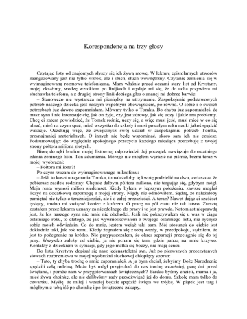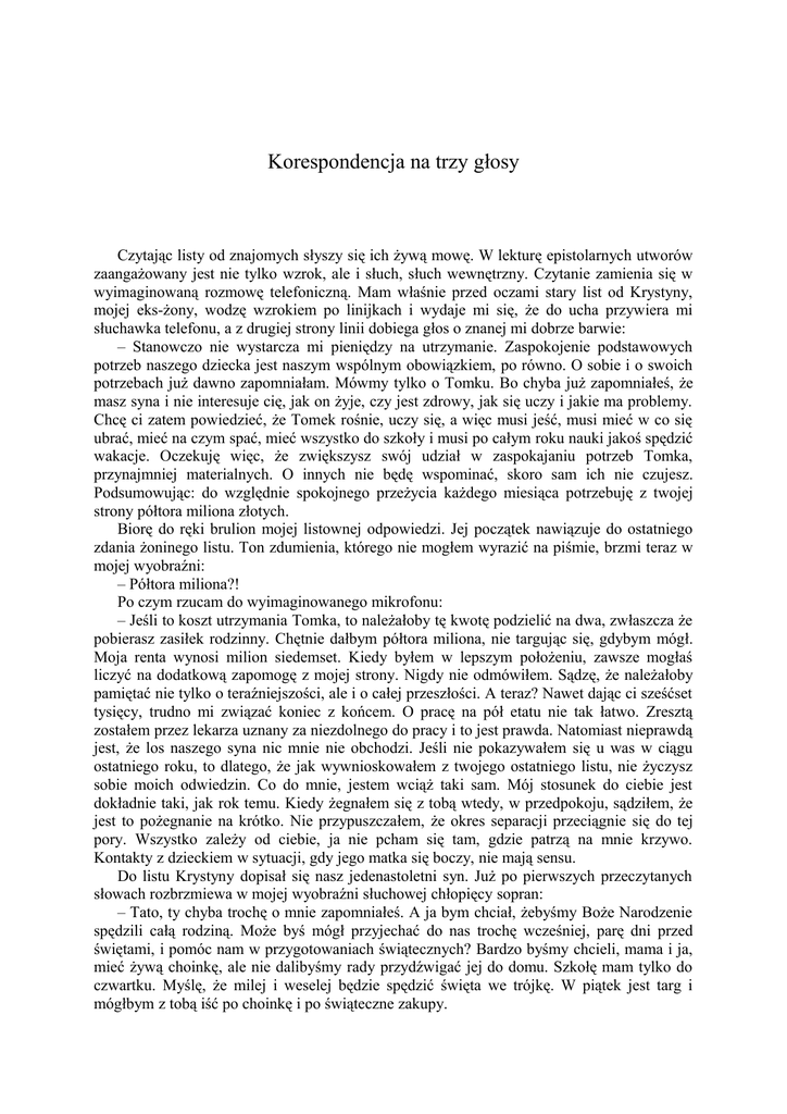 Korespondencja na trzy głosy Czytając listy od znajomych słyszy się ich żywą mowę. W lekturę epistolarnych utworów zaangażowany jest nie tylko wzrok, ale i słuch, słuch wewnętrzny. Czytanie zamienia się w wyimaginowaną rozmowę telefoniczną. Mam właśnie przed oczami stary list od Krystyny, mojej eks-żony, wodzę wzrokiem po linijkach i wydaje mi się, że do ucha przywiera mi słuchawka telefonu, a z drugiej strony linii dobiega głos o znanej mi dobrze barwie: – Stanowczo nie wystarcza mi pieniędzy na utrzymanie. Zaspokojenie podstawowych potrzeb naszego dziecka jest naszym wspólnym obowiązkiem, po równo. O sobie i o swoich potrzebach już dawno zapomniałam. Mówmy tylko o Tomku. Bo chyba już zapomniałeś, że masz syna i nie interesuje cię, jak on żyje, czy jest zdrowy, jak się uczy i jakie ma problemy. Chcę ci zatem powiedzieć, że Tomek rośnie, uczy się, a więc musi jeść, musi mieć w co się ubrać, mieć na czym spać, mieć wszystko do szkoły i musi po całym roku nauki jakoś spędzić wakacje. Oczekuję więc, że zwiększysz swój udział w zaspokajaniu potrzeb Tomka, przynajmniej materialnych. O innych nie będę wspominać, skoro sam ich nie czujesz. Podsumowując: do względnie spokojnego przeżycia każdego miesiąca potrzebuję z twojej strony półtora miliona złotych. Biorę do ręki brulion mojej listownej odpowiedzi. Jej początek nawiązuje do ostatniego zdania żoninego listu. Ton zdumienia, którego nie mogłem wyrazić na piśmie, brzmi teraz w mojej wyobraźni: – Półtora miliona?! Po czym rzucam do wyimaginowanego mikrofonu: – Jeśli to koszt utrzymania Tomka, to należałoby tę kwotę podzielić na dwa, zwłaszcza że pobierasz zasiłek rodzinny. Chętnie dałbym półtora miliona, nie targując się, gdybym mógł. Moja renta wynosi milion siedemset. Kiedy byłem w lepszym położeniu, zawsze mogłaś liczyć na dodatkową zapomogę z mojej strony. Nigdy nie odmówiłem. Sądzę, że należałoby pamiętać nie tylko o teraźniejszości, ale i o całej przeszłości. A teraz? Nawet dając ci sześćset tysięcy, trudno mi związać koniec z końcem. O pracę na pół etatu nie tak łatwo. Zresztą zostałem przez lekarza uznany za niezdolnego do pracy i to jest prawda. Natomiast nieprawdą jest, że los naszego syna nic mnie nie obchodzi. Jeśli nie pokazywałem się u was w ciągu ostatniego roku, to dlatego, że jak wywnioskowałem z twojego ostatniego listu, nie życzysz sobie moich odwiedzin. Co do mnie, jestem wciąż taki sam. Mój stosunek do ciebie jest dokładnie taki, jak rok temu. Kiedy żegnałem się z tobą wtedy, w przedpokoju, sądziłem, że jest to pożegnanie na krótko. Nie przypuszczałem, że okres separacji przeciągnie się do tej pory. Wszystko zależy od ciebie, ja nie pcham się tam, gdzie patrzą na mnie krzywo. Kontakty z dzieckiem w sytuacji, gdy jego matka się boczy, nie mają sensu. Do listu Krystyny dopisał się nasz jedenastoletni syn. Już po pierwszych przeczytanych słowach rozbrzmiewa w mojej wyobraźni słuchowej chłopięcy sopran: – Tato, ty chyba trochę o mnie zapomniałeś. A ja bym chciał, żebyśmy Boże Narodzenie spędzili całą rodziną. Może byś mógł przyjechać do nas trochę wcześniej, parę dni przed świętami, i pomóc nam w przygotowaniach świątecznych? Bardzo byśmy chcieli, mama i ja, mieć żywą choinkę, ale nie dalibyśmy rady przydźwigać jej do domu. Szkołę mam tylko do czwartku. Myślę, że milej i weselej będzie spędzić święta we trójkę. W piątek jest targ i mógłbym z tobą iść po choinkę i po świąteczne zakupy. Czytając swoją listowną odpowiedź wyobrażam sobie, że robię to głośno, ze słuchawką przy uchu, a mój głos jest słyszany zarówno przez matkę, jak i syna. Dzięki temu, że w ich mieszkaniu są dwa aparaty, jeden w kuchni, drugi w pokoju, moja gadka dociera do uszu obojga, gdy mówię: – Nie, Tomeczku, nie zapomniałem o tobie. Jeśli nie przyjeżdżam do Pruszkowa, to dlatego, że takie jest życzenie twojej matki. Jedno, czego ona sobie życzy, to żebym przysyłał pieniądze, jak najwięcej pieniędzy. A teraz ty raptem wspominasz o świętach. Że niby milej i weselej będzie świętować we trójkę. Kochasiu, nie wierzę, żeby święta mogły nam wypaść mile i wesoło. Przypomnij sobie, jak wyglądało nasze ostatnie Boże Narodzenie, mam na myśli grudzień dwa lata temu. Przypomnij sobie zły humor twojej matki i jej demonstracyjne wyjście z domu zaraz po wigilijnej kolacji. Dokąd poszła? Wiadomo, na ulicę Cedrową, do twojej babki. Tam jest wasze ognisko domowe, tam się zbiera wasza rodzina, z którą ja nie mam nic wspólnego. Tam dopiero twoja matka czuje się w swoim żywiole. Ja nie jestem jej do niczego potrzebny. Chyba tylko właśnie do przygotowań świątecznych i taszczenia choinki. Ale jaki mają sens te wszystkie przygotowania i tysiące różnych zabiegów, jaki w tym sens, pytam, jeśli później Wigilia jest ponura. Widzę poza tym, że wciąż nie wyobrażasz sobie świąt bez tak zwanej żywej choinki. One nie są żywe, to są trupy. Ja w tygodniu przedświątecznym staram się jak najrzadziej wychodzić z domu, żeby nie patrzeć na trupy choinek. Ścinanie drzew to obyczaj barbarzyński, mówiłem ci to już milion razy, ale moje słowa na ciebie nie działają, nie jestem dla ciebie żadnym autorytetem. Ze smutkiem stwierdzam, że jesteś wyłącznie pod wpływem mentalności Kilińskich, rodziny twojej matki, a ze swoim ojcem nie masz wspólnego języka. Widocznie taki los. Wiedz, że rozwiodłem się z twoją matką, kiedy miałeś cztery lata. Miałeś zaledwie rok, kiedy musiałem wynieść się z waszego domu, gdyż było nie do wytrzymania. Potem próbowałem zachować mimo wszystko jakąś więź z twoją matką, przyjeżdżałem do was. Uważałem, że lepsze to niż nic, ale ostatnio nawet i te sporadyczne kontakty okazały się niemożliwe. Coś si