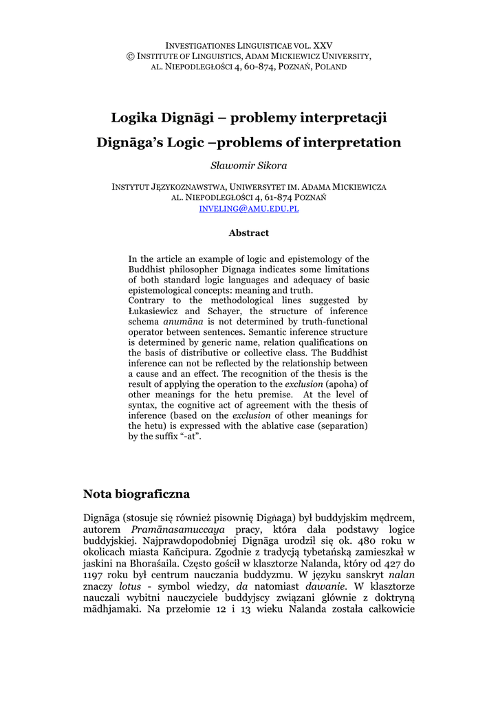 INVESTIGATIONES LINGUISTICAE VOL. XXV © INSTITUTE OF LINGUISTICS, ADAM MICKIEWICZ UNIVERSITY, AL. NIEPODLEGŁOŚCI 4, 60-874, POZNAŃ, POLAND Logika Dignāgi – problemy interpretacji Dignāga’s Logic –problems of interpretation Sławomir Sikora INSTYTUT JĘZYKOZNAWSTWA, UNIWERSYTET IM. ADAMA MICKIEWICZA AL. NIEPODLEGŁOŚCI 4, 61-874 POZNAŃ [email protected] Abstract In the article an example of logic and epistemology of the Buddhist philosopher Dignaga indicates some limitations of both standard logic languages and adequacy of basic epistemological concepts: meaning and truth. Contrary to the methodological lines suggested by Łukasiewicz and Schayer, the structure of inference schema anumāna is not determined by truth-functional operator between sentences. Semantic inference structure is determined by generic name, relation qualifications on the basis of distributive or collective class. The Buddhist inference can not be reflected by the relationship between a cause and an effect. The recognition of the thesis is the result of applying the operation to the exclusion (apoha) of other meanings for the hetu premise. At the level of syntax, the cognitive act of agreement with the thesis of inference (based on the exclusion of other meanings for the hetu) is expressed with the ablative case (separation) by the suffix “-at”. Nota biograficzna Dignāga (stosuje się również pisownię Digṅaga) był buddyjskim mędrcem, autorem Pramānasamuccaya pracy, która dała podstawy logice buddyjskiej. Najprawdopodobniej Dignāga urodził się ok. 480 roku w okolicach miasta Kañcipura. Zgodnie z tradycją tybetańską zamieszkał w jaskini na Bhoraśaila. Często gościł w klasztorze Nalanda, który od 427 do 1197 roku był centrum nauczania buddyzmu. W języku sanskryt nalan znaczy lotus - symbol wiedzy, da natomiast dawanie. W klasztorze nauczali wybitni nauczyciele buddyjscy związani głównie z doktryną mādhjamaki. Na przełomie 12 i 13 wieku Nalanda została całkowicie Sławomir Sikora: Logika Dignāgi – problemy interpretacji zniszczona przez muzułmanów. Spaleniu uległy bezcenne zbiory manuskryptów buddyjskich wielkiej biblioteki klasztornej. Intelektualny dorobek Dignāgi i innych logików buddyjskich, przetrwał dzięki zachowanym tłumaczeniom tybetańskim i chińskim.1 W oparciu o zachowane tłumaczenia tybetańskie, historyk logiki indyjskiej Satis Chandra Vidyabhushna zapoczątkował w końcu XIX wieku, współczesne systematyczne badania dotyczące epistemologicznych i logicznych osiągnięć starożytnego i średniowiecznego buddyzmu indyjskiego. W jego pracy A History of Indian Logic znalazło swoje miejsce pierwsze tłumaczenie z języka tybetańskiego na angielski tekstu Pramānasamuccaya Dignāgi. Kontynuatorów w pracach translacyjnych jak i w pisaniu komentarzy do nich miał Vidyabhushna w osobach wybitnych indologów: Th. Stacherbatsky, S. Mookereje, E. Frauwallner, H. Kitagawa, M.Hattori, S. Katsura, R. Herzberger, H.N. Randle. W ramach projektu Encyclopedia of Indian Philosophies, kierowanego przez H. Pottera, w roku 2003 dorobek Dignāgi został zebrany w jedną całość i opatrzony komentarzami. Poszczególne prace zostały opracowane w następującej kolejności: Abhidharmakośa-Marmapradīpa, Ālambanaparīkṣā, Hastavālanāmaprakaraṇṛavṛtti, Hetucakra, Nyāyamukha, Prajñāpāramitāpiṇḍārtha, Upādā yaprajñaptiprakaraṇa, Traikālyaparīkṣā, Sāmānyalakṣaṇaparīkṣā, Rājaparikathāratnamalasutra, Vivaraṇa. Pierwsza z wymienionych prac napisana była jako komentarz (virrti) do nauczania mistrza Vasubandhu. W kolejnych traktatach Dignāga skupił się już jednak na analitycznym wyłożeniu własnych epistemologicznych podstaw teorii percepcji, teorii języka oraz teorii poprawnych wnioskowań. Uznaje się, że najdoskonalsze rozwinięcie treści dotyczących logiki i teorii argumentacji tego autora zawierają dwa traktaty: Pramāṇasamuccaya i Hetucakra. W VII wieku uczniem, a potem także i wykładowcą w Naladzie był chiński pielgrzym Xuangzang. Dzięki niemu oraz chińskiemu mnichowi Yijing, dorobek średniowiecznej szkoły logiki buddyjskiej przetrwał w chińskich tłumaczeniach do czasów współczesnych. 1 129 Investigationes Linguisticae, vol. XXV Część I Oryginał Pramāṇasamuccaya, podobnie jak wiele indyjskich dzieł filozoficznych, napisanych było wierszem. Służyło to lepszemu zapamiętywaniu przez uczniów myśli mistrza podczas nauki. Traktat cechuje się ekstremalną zwięzłością stosowanych słów, których waga, każdego z osobna jest nie do przecenienia. Legenda głosi że, podczas, gdy Dignāga kończył pisanie ostatniego wersu swojego dzieła, nieopodal miasta Veńdi, zatrzęsło się wzgórze, cała okolica rozbłysła świtałem i słychać było grzmoty. Ktokolwiek staje przed interpretacją Pramāṇasamuccaya, musi liczyć się z przestrogą wyrażoną przez mistrza w słowach: „Let no one wipe these out even in joke or sport, for none should wipe out what are of great importance: if the sense of the words is not right, and one wishes to dispute on that account, let appear before me in person”. Stąd na wstępie, pełen pokory, ograniczę się jedynie do odtworzenia w krótkim zarysie podstawowych tez epistemologiczno-logicznych pramānaṇa - wiedzy ważnej (ang. valid knowledge). Korzystam z tłumaczeń i komentarzy do tekstu podstawowego zawartych w: Vidyabhushna (2005), Randle (1926), Potter (2003), Pind (2009). 1. Całość dzieła Pramānaṇasamuccaya skomponowana jest z sześciu części: Pratyakṣa - percepcja (ang. perception), 2. Svarthanumāna - wnioskowanie dla samego z siebie ( ang. inference for one’s own self), 3. Parārthānumāna - wnioskowanie dla innych ( ang: inference for the sake of others), 4. Dṛṣṭānta – przykład, obrazowanie (ang. example) 5. Apohaparīkṣā – uznanie przez wykluczenie (ang. negation of the opposite) 6. Jāti - anal