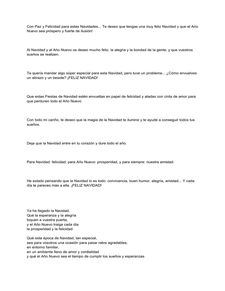 Con Paz y Felicidad para estas Navidades... Te deseo que tengas una muy feliz Navidad y que el Ańo Nuevo sea próspero y fuerte de ilusión! Al Navidad y al Ańo Nuevo os deseo mucho feliz, la alegria y la bondad de la gente, y que vuestros sueńos se realizen. Te quería mandar algo súper especial para esta Navidad, pero tuve un problema... ¿Cómo envuelves un abrazo y un besote? ¡FELIZ NAVIDAD! Que estas Fiestas de Navidad estén envueltas en papel de felicidad y atadas con cinta de amor para que perduren todo el Año Nuevo Con todo mi cariño, te deseo que la magia de la Navidad te ilumine y te ayude a conseguir todos tus sueños. Deja que la Navidad entre en tu corazón y dure todo el año. Para Navidad: felicidad, para Año Nuevo: prosperidad, y para siempre: nuestra amistad. He estado pensando que la Navidad lo es todo: convivencia, buen humor, alegría, amistad... Y cada día te pareces más a ella. ¡FELIZ NAVIDAD! Ya ha llegado la Navidad. Qué la esperanza y la alegría toquen a vuestra puerta, y el Año Nuevo traiga cada día la prosperidad y la felicidad Qué esta época de Navidad, tan especial, sea para vosotros una ocasión para pasar ratos agradables, en entorno familiar, en un ambiente lleno de amor y cordialidad y qué el Año Nuevo sea el tiempo de cumplir los sueños y esperanzas Już nadeszły święta, Niech nadzieja i radość zastukają do Waszych drzwi, a Nowy Rok przyniesie pomyślność i szczęście każdego dnia. Niech ten szczególny czas świąt Bożego Narodzenia będzie dla Was okazją do spędzenia miłych chwil w gronie najbliższych, w atmosferze pełnej miłości i wzajemnej życzliwości a Nowy Rok, by stał się czasem spełnionych marzeń i nadziei.