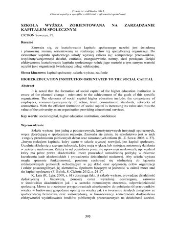 Trendy ve vzdělávání 2013 Obecné aspekty a specifika vzdělávání v informační společnosti SZKOŁA WYŻSZA ZORIENTOWANA KAPITAŁEM SPOŁECZNYM NA ZARZĄDZANIE CICHOŃ Seweryn, PL Resumé Zauważa się, że kształtowanie kapitału społecznego uczelni jest świadomą i planowaną zmianą zorientowaną na realizację celów tej specyficznej organizacji. Do elementów kapitału społecznego szkoły wyższej zalicza się: kompetencje pracowników, wspólnotę/wzajemność działań, zaufanie, zaangażowanie, normy, sieci powiązań. Dzięki efektywnemu kształtowaniu kapitału społecznego rośnie jego wartość a tym samym wartość uczelni jako organizacji świadczącej usługi edukacyjne. Słowa kluczowe: kapitał społeczny, szkoła wyższa, zaufanie HIGHER EDUCATION INSTITUTION ORIENTATED TO THE SOCIAL CAPITAL Abstract It is noted that the formation of social capital of the higher education institution is aware of the planned change - orientated to the achievement of the goals of this specific organization. The elements of social capital higher education include: the competence of employees, community/reciprocity of action, trust, commitment, standards, networks of connections. With the efficient formation of social capital is increasing its value and thus the value of the university as an organization providing educational services. Key words: social capital, higher education institution, confidence Wprowadzenie Szkoła wyższa jest jedną z podstawowych, konstytutywnych instytucji społecznych, wręcz decydującą o społecznym rozwoju. Zauważa sie zatem, że szkolnictwo jest w nich z reguły przedmiotem publicznych debat oraz nieustannych reform (K. Z. Sowa: 2008, s. 37). „Innym rodzajem kapitału, który warto w szkole wyższej rozwijać, jest kapitał społeczny. Uczelnia składa się z szeregu jednostek, które mają większą lub mniejszą autonomię działania w zakresie naukowym. Zależy to od posiadania przez nie uprawnień naukowych, np. wydział który ma pełne prawa akademickie, może prowadzić samodzielną politykę w zakresie kształcenia kadr akademickich i prowadzenia działalności naukowej. Aby szkoła wyższa mogła sprawnie funkcjonować, powinna cechować się zdolnością do łączenia zróżnicowanych jednostek wchodzących w jej skład oraz spójnością celów organizacji i celów poszczególnych jej elementów. Spoiwem łączącym te jednostki w całość może stać sie kapitał społeczny (F. Bylok, S. Cichoń: 2012, s. 241)”. K. Leja (K. Leja: 2008, s. 61) dostrzega fakt, iż szkoły wyższe, prowadząc działalność dydaktyczną i badawczą, ponoszą coraz wyraźniej dostrzeganą, zarówno w środowisku akademickim jak i w szeroko rozumianym otoczeniu, odpowiedzialność społeczną. Mowa tu o zarówno przygotowaniach absolwentów do pełnienia ról pracowników wiedzy w budowanej gospodarce opartej na wiedzy jak i o tworzeniu ścisłych związków ze społecznością biznesową oraz samorządową, w konsekwencji konieczności doskonalenia efektywności wydatkowania środków publicznych przeznaczanych na działalność uczelni. 393 Trendy ve vzdělávání 2013 Obecné aspekty a specifika vzdělávání v informační společnosti Istota kapitału społecznego w organizacji Warto zaznaczyć, że istnieje wiele interpretacji istoty kapitału społecznego w organizacji, w artykule przestawiono tylko niektóre z nich. J. S. Coleman (J. S. Coleman: 1990, s. 300) definiuje kapitał społeczny jako aspekt struktury społecznej tworzącej wartości i ułatwiającej działania jednostek w ramach tej struktury. J. S. Coleman chciał wytłumaczyć korelacje między osiągnięciami w szkole wyższej a nierównościami społecznymi, tak więc w jego koncepcji kapitał społeczny służy podkreśleniu społecznego kontekstu edukacji. Dokonuje analizy znaczenia kapitału społecznego w kształtowaniu kapitału ludzkiego następnego pokolenia. Kapitał społeczny odnosi się do takich cech organizacji społeczeństwa, jak zaufanie, normy i powiązania, które mogą zwiększyć sprawność społeczeństwa ułatwiając skoordynowane działania: „Tak jak i inne postaci kapitału, kapitał społeczny jest produktywny, umożliwia bowiem osiągnięcie pewnych celów, których nie dałoby się osiągnąć, gdyby go zabrakło [...] Na przykład grupa, której członkowie wykazują, że są godni zaufania i ufają innym będzie w stanie osiągnąć znacznie więcej niż porównywalna grupa, w której brak jest zaufania. Spontaniczna współpraca jest łatwiejsza dzięki społecznemu kapitałowi (R. Putnam, R. Leonardi, R. Y. Nanetti: 1995, s. 258)”. Z socjologicznego punktu widzenia kapitał społeczny można ocenić z perspektywy jego wpływu na spójność społeczeństwa. Rozróżnia się wówczas kapitał społeczny występujący w formie mostów, więzi i połączeń (OECD: 2001). Proces kształtowania kapitału społecznego w organizacji polega na świadomym kształtowaniu jego elementów, w taki sposób by skutecznie realizować cele organizacji. Duże znaczenie w tym aspekcie odgrywa osiągany zysk, orientacja na konsumenta, wysoka jakość świadczonych usług. Kształtowanie kapitału społecznego w przedsiębiorstwie usługowym powinno uwzględniać następujące działania (E. Pawłowska, A. Sitko - Lutek: 2008, s. 588): - mierzenie i ocenę istniejącego stanu kapitału społecznego; - określenie pożądanego stanu kapitału społecznego; - identyfikacja luk między rzeczywistym a pożądanym stanem kapitału społecznego; - zaproponowanie działań niwelujących te luki; - wdrożenie działań; - monitorowanie, kontrola działań. Doświadczenia krajów OECD mówią o tym, że zmniejsza się rola zatrudnienia tzw. czystej siły roboczej oraz kapitały fizycznego kosztem stosowania nowoczesnych technologii, kapitału ludzkiego i społecznego w tworzeniu PKB (S. Marciniak: 2006, s. 21). Zarządzanie kapitałem społecznym w szkole wyższej „