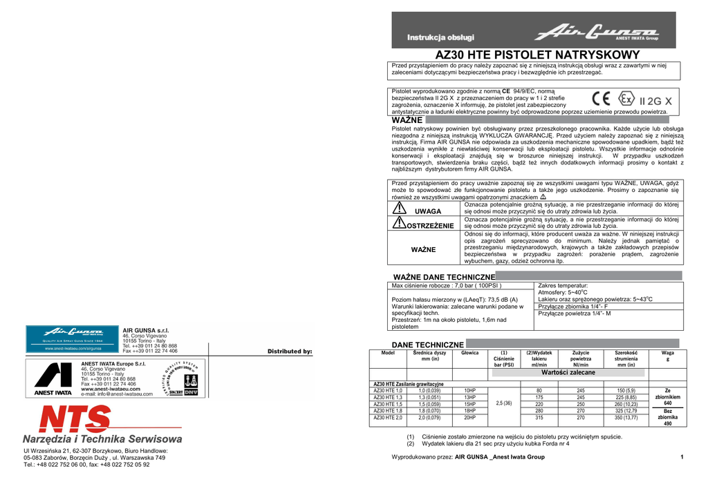 AZ30 HTE PISTOLET NATRYSKOWY Przed przystąpieniem do pracy naleŜy zapoznać się z niniejszą instrukcją obsługi wraz z zawartymi w niej zaleceniami dotyczącymi bezpieczeństwa pracy i bezwzględnie ich przestrzegać. Pistolet wyprodukowano zgodnie z normą CE 94/9/EC, normą bezpieczeństwa II 2G X z przeznaczeniem do pracy w 1 i 2 strefie zagroŜenia, oznaczenie X informuję, Ŝe pistolet jest zabezpieczony antystatycznie a ładunki elektryczne powinny być odprowadzone poprzez uziemienie przewodu powietrza. WAśNE Pistolet natryskowy powinien być obsługiwany przez przeszkolonego pracownika. KaŜde uŜycie lub obsługa niezgodna z niniejszą instrukcją WYKLUCZA GWARANCJĘ. Przed uŜyciem naleŜy zapoznać się z niniejszą instrukcją. Firma AIR GUNSA nie odpowiada za uszkodzenia mechaniczne spowodowane upadkiem, bądź teŜ uszkodzenia wynikłe z niewłaściwej konserwacji lub eksploatacji pistoletu. Wszystkie informacje odnośnie konserwacji i eksploatacji znajdują się w broszurce niniejszej instrukcji. W przypadku uszkodzeń transportowych, stwierdzenia braku części, bądź teŜ innych dodatkowych informacji prosimy o kontakt z najbliŜszym dystrybutorem firmy AIR GUNSA. Przed przystąpieniem do pracy uwaŜnie zapoznaj się ze wszystkimi uwagami typu WAśNE, UWAGA, gdyŜ moŜe to spowodować złe funkcjonowanie pistoletu a takŜe jego uszkodzenie. Prosimy o zapoznanie się równieŜ ze wszystkimi uwagami opatrzonymi znaczkiem Oznacza potencjalnie groźną sytuację, a nie przestrzeganie informacji do której się odnosi moŜe przyczynić się do utraty zdrowia lub Ŝycia. UWAGA Oznacza potencjalnie groźną sytuację, a nie przestrzeganie informacji do której się odnosi moŜe przyczynić się do utraty zdrowia lub Ŝycia. OSTRZEśENIE Odnosi się do informacji, które producent uwaŜa za waŜne. W niniejszej instrukcji opis zagroŜeń sprecyzowano do minimum. NaleŜy jednak pamiętać o przestrzeganiu międzynarodowych, krajowych a takŜe zakładowych przepisów WAśNE bezpieczeństwa w przypadku zagroŜeń: poraŜenie prądem, zagroŜenie wybuchem, gazy, odzieŜ ochronna itp. WAśNE DANE TECHNICZNE Max ciśnienie robocze : 7,0 bar ( 100PSI ) Poziom hałasu mierzony w (LAeqT): 73,5 dB (A) Warunki lakierowania: zalecane warunki podane w specyfikacji techn. Przestrzeń: 1m na około pistoletu, 1,6m nad pistoletem Zakres temperatur: Atmosfery: 5~40oC Lakieru oraz spręŜonego powietrza: 5~43oC Przyłącze zbiornika 1/4”- F Przyłącze powietrza 1/4”- M DANE TECHNICZNE Model Średnica dyszy mm (in) Głowica (1) Ciśnienie bar (PSI) (2)Wydatek lakieru ml/min ZuŜycie powietrza NI/min Szerokość strumienia mm (in) Waga g 150 (5,9) 225 (8,85) 260 (10,23) 325 (12,79 350 (13,77) Ze zbiornikiem 640 Bez zbiornika 490 Wartości zalecane AZ30 HTE Zasilanie grawitacyjne AZ30 HTE 1,0 1,0 (0,039) AZ30 HTE 1,3 1,3 (0,051) AZ30 HTE 1,5 1,5 (0,059) AZ30 HTE 1,8 1,8 (0,070) AZ30 HTE 2,0 2,0 (0,079) (1) (2) Ul Wrzesińska 21, 62-307 Borzykowo, Biuro Handlowe: 05-083 Zaborów, Borzęcin DuŜy , ul. Warszawska 749 Tel.: +48 022 752 06 00, fax: +48 022 752 05 92 10HP 13HP 15HP 18HP 20HP 2,5 (36) 80 175 220 280 315 245 245 250 270 270 Ciśnienie zostało zmierzone na wejściu do pistoletu przy wciśniętym spuście. Wydatek lakieru dla 21 sec przy uŜyciu kubka Forda nr 4 Wyprodukowano przez: AIR GUNSA _Anest Iwata Group 1 BEZPIECZENSTWO NOTATKI ZAGROśENIE POśAREM LUB EKSPLOZJĄ 1. 2. 3. Stosowane materiały mogą być łatwopalne lub wybuchowe. Stosować w dobrze wentylowanych kabinach lakierniczych. Unikać źródeł zapłonu takich jak otwarty ogień, łuk elektryczny itp. Nigdy nie stosować jako rozpuszczalników chlorowanych węglowodorów jak np.: trójchloroetylen, chlorek etylu, itp. które mogą reagować chemicznie z częściami aluminiowymi i cynkowanymi powodując eksplozję. Upewnić się czy stosowane rozpuszczalniki są bezpieczne w zetknięciu z aluminium oraz cynkiem. W razie wątpliwości naleŜy skontaktować się z dostawcą rozpuszczalnika. W celu uniknięcia wyładowań statycznych – uziemić obiekt malowany oraz sprzęt natryskowy. ZAGROśENIA WYNIKAJACE Z NIEPRAWIDŁOWEGO UśYCIA 1. 2. 3. 4. Nigdy nie kierować pistoletu w stronę ludzkiego ciała. Nigdy nie przekraczać maksymalnego ciśnienia roboczego. Wszystkie czynności obsługowe wykonywać po odłączeniu przewodu zasilającego spręŜonym powietrzem oraz zbiornika z materiałem lakierniczym. Iglica pistoletu jest ma ostrą końcówkę. Nie wolno dotykać końcówki iglicy ani zbliŜać jej do ludzkiego ciała. OCHRONA LUDZKIEGO CIAŁA 1. 2. 3. 4. Lakieruj tylko w duŜych wentylowanych pomieszczeniach (kabiny lakiernicze). Nieprzestrzeganie grozi zatruciem lub moŜe spowodować poŜar. Zawsze noś ubranie robocze (ochronne gogle, maskę, rękawice). Lakiery i substancje uŜywane w lakiernictwie są trujące. Jeśli poczujesz, Ŝe coś jest nie w porządku z oczami lub skórą natychmiast skontaktuj się z lekarzem. Jeśli to konieczne, noś zatyczki do uszu. Poziom hałasu powstały podczas malowania nie przekracza 85dB(A). Jeśli poczujesz się zmęczony przerwij pracę. Wciskanie spustu męczy dłoń, a proces lakierowania moŜe wpłynąć na samopoczucie. INNE ZAGROśENIA 1. 2. • • • 3. Nie dokonywać Ŝadnych przeróbek. Nie wykonywać prac w zasięgu działania robotów, przenośników, itp. o ile te urządzenia nie są unieruchomione. Nigdy nie natryskiwać środków spoŜywczych lub związków chemicznych. Ten pistolet powinien być obsługiwany przez przeszkolonego pracownika. Sprawdzić czy pistolet nie został uszkodzony w czasie transportu. Powietrze zasilające musi być suche i czyste. 4. Jeśli cokolwiek nie działa lub działa nieprawidłowo natychmiast przerwij pracę i kontynuuj dopiero po usunięciu usterki. 2 7 WAśNE: Przygotowanie do pracy 1. Podłączyć przewód spręŜonego powietrza. 2. Zamocować zbiornik farby. 3. Przepłukać pistolet odpowiednim rozpuszczalnikiem. 4. 