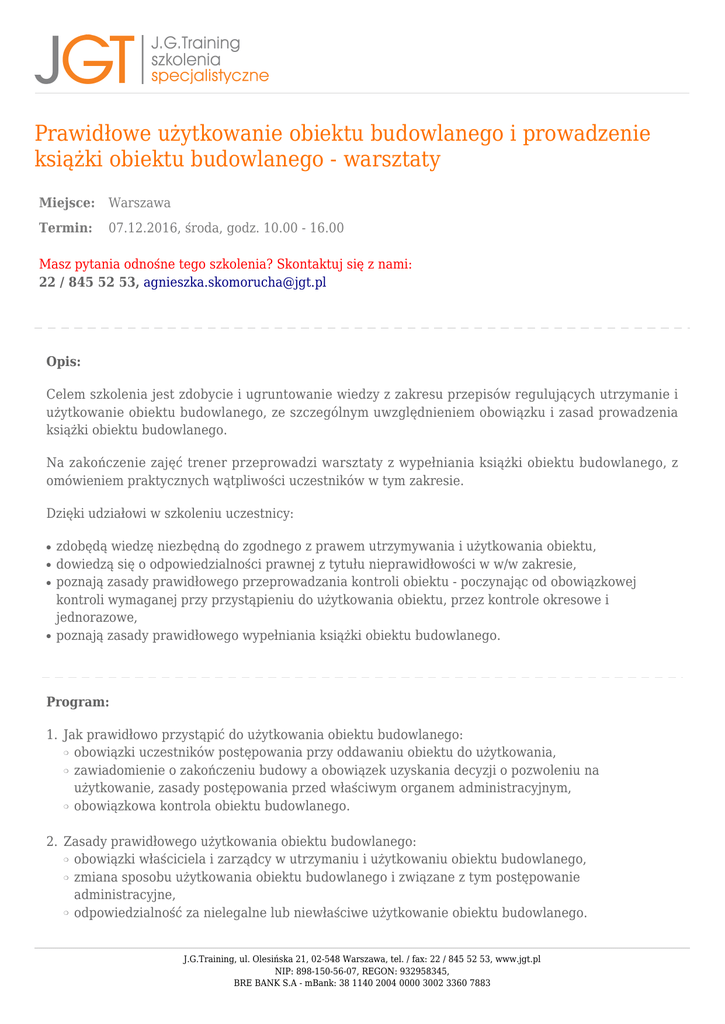 Prawidłowe użytkowanie obiektu budowlanego i prowadzenie książki obiektu budowlanego - warsztaty Miejsce: Warszawa Termin: 07.12.2016, środa, godz. 10.00 - 16.00 Masz pytania odnośne tego szkolenia? Skontaktuj się z nami: 22 / 845 52 53, [email protected] Opis: Celem szkolenia jest zdobycie i ugruntowanie wiedzy z zakresu przepisów regulujących utrzymanie i użytkowanie obiektu budowlanego, ze szczególnym uwzględnieniem obowiązku i zasad prowadzenia książki obiektu budowlanego. Na zakończenie zajęć trener przeprowadzi warsztaty z wypełniania książki obiektu budowlanego, z omówieniem praktycznych wątpliwości uczestników w tym zakresie. Dzięki udziałowi w szkoleniu uczestnicy: ● ● ● ● zdobędą wiedzę niezbędną do zgodnego z prawem utrzymywania i użytkowania obiektu, dowiedzą się o odpowiedzialności prawnej z tytułu nieprawidłowości w w/w zakresie, poznają zasady prawidłowego przeprowadzania kontroli obiektu - poczynając od obowiązkowej kontroli wymaganej przy przystąpieniu do użytkowania obiektu, przez kontrole okresowe i jednorazowe, poznają zasady prawidłowego wypełniania książki obiektu budowlanego. Program: 1. Jak prawidłowo przystąpić do użytkowania obiektu budowlanego: obowiązki uczestników postępowania przy oddawaniu obiektu do użytkowania, zawiadomienie o zakończeniu budowy a obowiązek uzyskania decyzji o pozwoleniu na użytkowanie, zasady postępowania przed właściwym organem administracyjnym, obowiązkowa kontrola obiektu budowlanego. ❍ ❍ ❍ 2. Zasady prawidłowego użytkowania obiektu budowlanego: obowiązki właściciela i zarządcy w utrzymaniu i użytkowaniu obiektu budowlanego, zmiana sposobu użytkowania obiektu budowlanego i związane z tym postępowanie administracyjne, odpowiedzialność za nielegalne lub niewłaściwe użytkowanie obiektu budowlanego. ❍ ❍ ❍ J.G.Training, ul. Olesińska 21, 02-548 Warszawa, tel. / fax: 22 / 845 52 53, www.jgt.pl NIP: 898-150-56-07, REGON: 932958345, BRE BANK S.A - mBank: 38 1140 2004 0000 3002 3360 7883 3. Obowiązek przeprowadzania kontroli obiektu budowlanego: rodzaje i zakres kontroli okresowych obiektu budowlanego, kontrola bezpiecznego użytkowania obiektu oraz obowiązkowe kontrole jednorazowe, kwalifikacje i odpowiedzialność osób przeprowadzających kontrole obiektu budowlanego. ❍ ❍ ❍ 4. Uprawnienia organu nadzoru budowlanego w przypadku stwierdzenia nieodpowiedniego stanu technicznego obiektu lub innych nieprawidłowości w jego użytkowaniu: konsekwencje prawnej decyzji o zakazie użytkowania obiektu, obowiązek usunięcia stwierdzonych nieprawidłowości, obowiązek rozbiórki lub opróżnienia obiektu budowlanego. ❍ ❍ ❍ 5. Obowiązek prowadzenia książki obiektu budowlanego: podmiot odpowiedzialny za prowadzenie książki obiektu budowlanego, zasady prowadzenia książki obiektu budowlanego, obowiązkowe elementy książki obiektu budowlanego. ❍ ❍ ❍ 6. Warsztaty z wypełniania książki obiektu budowlanego, z omówieniem praktycznych wątpliwości uczestników w tym zakresie. 7. Panel dyskusyjny. Wykładowca: Radca prawny posiadający bogate doświadczenie w obsłudze prawnej inwestycyjnego procesu budowlanego. Członek Okręgowej Izby Radców Prawnych w Warszawie. Prowadzi kancelarię prawną specjalizującą się w obsłudze prawnej inwestycji budowlanych. Posiada doświadczenie w przygotowywaniu i negocjowaniu umów o roboty budowlane i prace projektowe, w tym umów zawieranych w ramach zamówień publicznych oraz umów opartych na Warunkach Kontraktowych FIDIC. Doradza Klientom - zamawiającym, wykonawcom, podwykonawcom i projektantom - jak skutecznie zabezpieczyć swoje interesy i zminimalizować ryzyko prawne wynikające z prowadzonej inwestycji. Wspiera inwestorów w postępowaniach administracyjnych związanych z ustaleniem warunków zabudowy i zagospodarowania terenu, uzyskaniem pozwolenia na budowę lub dokonaniem zgłoszenia robót budowlanych, jak również przystąpieniem do użytkowania wybudowanego obiektu. Reprezentuje uczestników procesu budowlanego w sporach sądowych i pozasądowych. Prowadzi wykłady i szkolenia dotyczące prawa budowlanego i umów zawieranych w procesie budowlanym, planowania i zagospodarowania przestrzennego oraz przepisów regulujących gospodarkę nieruchomościami. Jest autorką licznych publikacji o tematyce prawnej z zakresu swojej specjalizacji. Biegle posługuje się językiem angielskim. J.G.Training, ul. Olesińska 21, 02-548 Warszawa, tel. / fax: 22 / 845 52 53, www.jgt.pl NIP: 898-150-56-07, REGON: 932958345, BRE BANK S.A - mBank: 38 1140 2004 0000 3002 3360 7883 Miejsce: Miejsce szkolenia zlokalizowane w centrum Warszawy, czas dojazdu tramwajem z Dworca Centralnego - około 5 minut. Na 4 dni robocze przed planowanym terminem szkolenia skontaktujemy się z Państwem i przekażemy szczegółowe informacje na temat lokalizacji szkolenia. Hotele w pobliżu miejsca szkolenia: Hotel Campanile, ul. Towarowa 2, Warszawa Cena noclegu zależy od terminu i wolnych miejsc w Hotelu. Koszt od 279 zł (jedynka ze śniadaniem), tel. 22 582 72 00, http://www.campanile-varsovie.pl/pl/index.aspx Hotel Golden Tulip, ul. Towarowa 2, Warszawa Cena noclegu zależy od terminu i wolnych miejsc w Hotelu. Koszt od 315 zł (jedynka ze śniadaniem), tel. 22 582 75 00, http://www.goldentulipwarsawcentre.com/default.aspx Hotel Premiere Classe, ul. Towarowa 2, Warszawa Cena noclegu zależy od terminu i wolnych miejsc w Hotelu. Koszt od 177 zł (jedynka ze śniadaniem), tel. 22 624 08 00, http://www.premiere-classe-warszawa.pl/pl/index.aspx Cena: 590,00 zł + 23% VAT = 725,70 zł brutto 590,00 zł + VAT zw = 590,00 zł brutto - w przypadku, gdy udział w szkoleniu jest finansowany co najmniej w 70% ze środków publicznych. Cena obejmuje: wykłady, materiały szkoleniowe, serwis kawowy, lunch, certyfikat ukończenia szkolenia, możliwość konsultacji poszkoleniowych. J.G.Training, ul. Olesińska 21, 02-548 W