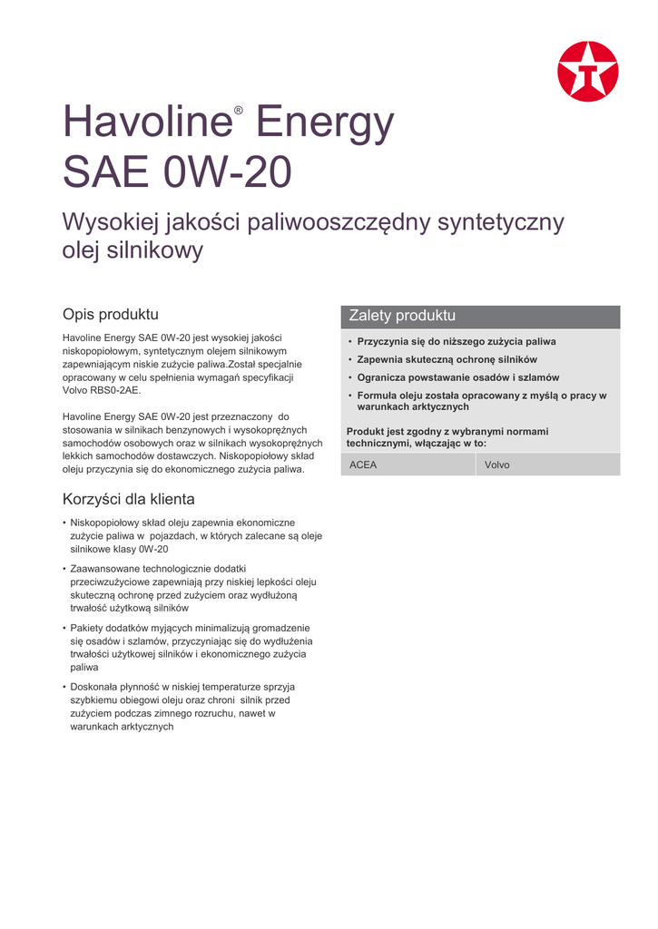 Havoline Energy SAE 0W-20 ® Wysokiej jakości paliwooszczędny syntetyczny olej silnikowy Opis produktu Zalety produktu Havoline Energy SAE 0W-20 jest wysokiej jakości niskopopiołowym, syntetycznym olejem silnikowym zapewniającym niskie zużycie paliwa.Został specjalnie opracowany w celu spełnienia wymagań specyfikacji Volvo RBS0-2AE. • Przyczynia się do niższego zużycia paliwa Havoline Energy SAE 0W-20 jest przeznaczony do stosowania w silnikach benzynowych i wysokoprężnych samochodów osobowych oraz w silnikach wysokoprężnych lekkich samochodów dostawczych. Niskopopiołowy skład oleju przyczynia się do ekonomicznego zużycia paliwa. Korzyści dla klienta • Niskopopiołowy skład oleju zapewnia ekonomiczne zużycie paliwa w pojazdach, w których zalecane są oleje silnikowe klasy 0W-20 • Zaawansowane technologicznie dodatki przeciwzużyciowe zapewniają przy niskiej lepkości oleju skuteczną ochronę przed zużyciem oraz wydłużoną trwałość użytkową silników • Pakiety dodatków myjących minimalizują gromadzenie się osadów i szlamów, przyczyniając się do wydłużenia trwałości użytkowej silników i ekonomicznego zużycia paliwa • Doskonała płynność w niskiej temperaturze sprzyja szybkiemu obiegowi oleju oraz chroni silnik przed zużyciem podczas zimnego rozruchu, nawet w warunkach arktycznych • Zapewnia skuteczną ochronę silników • Ogranicza powstawanie osadów i szlamów • Formuła oleju została opracowany z myślą o pracy w warunkach arktycznych Produkt jest zgodny z wybranymi normami technicznymi, włączając w to: ACEA Volvo Havoline® Energy SAE 0W-20 ─ ciąg dalszy Zastosowania Normy, zatwierdzenia i zalecenia • Havoline Energy SAE 0W-20 jest odpowiedni do stosowania w wielu samochodach osobowych i w lekkich pojazdach dostawczych wyposażonych w turbodoładowane lub bez turbodoładowania silniki benzynowe i wysokoprężne. Ten specjalnie opracowany olej o niskim tarciu i lepkości zapewnia wydłużone przebiegi oraz spełnia wymagania specyfikacji ACEA A1/B1 dla olejów o niskim tarciu i lepkości, zwykle stosowanych przez Hondę, Mazdę i innych japońskich producentów pojazdów (OEM). Zatwierdzenia • Volvo RBS0-2AE Zgodność ze standardami • ACEA A1/B1 • Havoline Energy SAE 0W-20 przeznaczony jest do nowej generacji samochodów osobowych Volvo VEA (Volvo Engine Architecture) z silnikiem Drive-E, wymagających oleju silnikowego spełniającego specyfikację Volvo RBS0-2AE • Havoline Energy SAE 0W-20 może być nieodpowiedni w niektórych silnikach. W razie wątpliwości należy odnieść się do książki serwisowej lub instrukcji obsługi pojazdu Dane Typowe Test Metody badań Klasa lepkości Wartość SAE 0W-20 Dopuszczalny okres magazynowania: 60 miesięcy od daty napełnienia, podanej na produkcie Gęstość w temp. 15°C, kg/l ASTM D4052 0.848 Lepkość kinematyczna w temperaturze 40°C, mm²/s ASTM D445 48.6 Lepkość kinematyczna w temperaturze 100°C, mm²/s ASTM D445 9.2 Wskaźnik lepkości ASTM D2270 175 Temperatura płynięcia, ºC ASTM D5950 -48 Temperatura zapłonu COC, ºC ASTM D92 224 Podane informacje są danymi typowymi dla bieżącej produkcji, nie stanowią wymagań technicznych produktu i mogą podlegać zmianom w ramach dopuszczalnych tolerancji produkcyjnych. Zastrzega się prawo do dokonywania zmian w specyfikacji produktu. Powyższa Karta Produktu zastępuje wszelkie poprzednie wersje Karty Produktu i zawarte w nich informacje. Chevron nie bierze odpowiedzialności: za jakiekolwiek straty oraz szkody powstałe wskutek używania tego produktu niezgodnie z przeznaczeniem opisanym w Karcie Produktu. Zdrowie, bezpieczeństwo, przechowywanie i ochrona środowiska: zgodnie z aktualnie dostępnymi informacjami nie przypuszcza się, żeby produkt mógł powodować negatywne skutki oddziaływania na zdrowie, w przypadku kiedy jest używany zgodnie z przeznaczeniem oraz zgodnie z informacjami zawartymi w Karcie Charakterystyki Preparatu Niebezpiecznego. Karty Charakterystyki dostępne są na życzenie w lokalnym biurze handlowym lub poprzez stronę internetową. Produkt ten nie powinien być używany niezgodnie z przeznaczeniem. W postępowaniu ze zużytym produktem zadbać o ochronę środowiska naturalnego i zastosować się do lokalnych przepisów. © 2016 Chevron Products UK Limited. All rights reserved. All trademarks are property owned by Chevron Intellectual Property LLC. EU v4 16 August 2016 Havoline® Energy SAE 0W-20