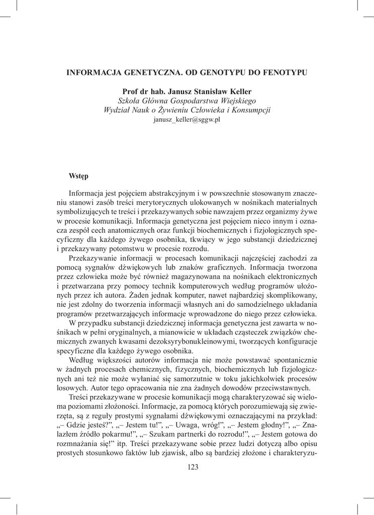 INFORMACJA GENETYCZNA. OD GENOTYPU DO FENOTYPU Prof dr hab. Janusz Stanisław Keller Szkoła Główna Gospodarstwa Wiejskiego Wydział Nauk o Żywieniu Człowieka i Konsumpcji [email protected] Wstęp Informacja jest pojęciem abstrakcyjnym i w powszechnie stosowanym znaczeniu stanowi zasób treści merytorycznych ulokowanych w nośnikach materialnych symbolizujących te treści i przekazywanych sobie nawzajem przez organizmy żywe w procesie komunikacji. Informacja genetyczna jest pojęciem nieco innym i oznacza zespół cech anatomicznych oraz funkcji biochemicznych i fizjologicznych specyficzny dla każdego żywego osobnika, tkwiący w jego substancji dziedzicznej i przekazywany potomstwu w procesie rozrodu. Przekazywanie informacji w procesach komunikacji najczęściej zachodzi za pomocą sygnałów dźwiękowych lub znaków graficznych. Informacja tworzona przez człowieka może być również magazynowana na nośnikach elektronicznych i przetwarzana przy pomocy technik komputerowych według programów ułożonych przez ich autora. Żaden jednak komputer, nawet najbardziej skomplikowany, nie jest zdolny do tworzenia informacji własnych ani do samodzielnego układania programów przetwarzających informacje wprowadzone do niego przez człowieka. W przypadku substancji dziedzicznej informacja genetyczna jest zawarta w nośnikach w pełni oryginalnych, a mianowicie w układach cząsteczek związków chemicznych zwanych kwasami dezoksyrybonukleinowymi, tworzących konfiguracje specyficzne dla każdego żywego osobnika. Według większości autorów informacja nie może powstawać spontanicznie w żadnych procesach chemicznych, fizycznych, biochemicznych lub fizjologicznych ani też nie może wyłaniać się samorzutnie w toku jakichkolwiek procesów losowych. Autor tego opracowania nie zna żadnych dowodów przeciwstawnych. Treści przekazywane w procesie komunikacji mogą charakteryzować się wieloma poziomami złożoności. Informacje, za pomocą których porozumiewają się zwierzęta, są z reguły prostymi sygnałami dźwiękowymi oznaczającymi na przykład: „– Gdzie jesteś?”, „– Jestem tu!”, „– Uwaga, wróg!”, „– Jestem głodny!”, „– Znalazłem źródło pokarmu!”, „– Szukam partnerki do rozrodu!”, „– Jestem gotowa do rozmnażania się!” itp. Treści przekazywane sobie przez ludzi dotyczą albo opisu prostych stosunkowo faktów lub zjawisk, albo są bardziej złożone i charakteryzu123 ją m. in. procesy, poglądy, odkryte prawidłowości, obowiązujące prawa, panujące zwyczaje, wyznawane wierzenia czy formułowane teorie. Cechą charakterystyczną informacji genetycznej jest obejmowanie przez nią różnych poziomów organizacji i funkcjonowania organizmów żywych, a więc: biosyntezy łańcuchów peptydowych, ekspresji genów, współdziałania genów ze sobą, różnicowania się komórek, organogenezy i programu rozwoju osobniczego (ontogenezy). Tworzenie i przekazywanie informacji odbywa się zawsze przy pomocy jakiegoś kodu. Kod musi charakteryzować się określonym zakresem i mieć zawsze charakter w pełni spójnego, celowego projektu. Każdy kod musi być zaprogramowany przez inteligentnego nadawcę i może być rozszyfrowany jedynie przez inteligentnego odbiorcę, który potrafi kojarzyć znaki z treściami. Przekazywanie informacji genetycznej na poziomie biosyntezy peptydów. Gen jako jednostka dziedziczności Rola białka w organizmie człowieka. Pojedynczy gen jest najmniejszą jednostką dziedziczności przekazywaną z pokolenia na pokolenie i odpowiada za zdolność organizmu żywego do biosyntezy jakiegoś konkretnego peptydu, czyli łańcucha cząsteczek chemicznych zbudowanego z określonych aminokwasów uszeregowanych w odpowiednim porządku. Z jednego lub kilku peptydów utworzone są cząsteczki białek, czyli – według współczesnej definicji – bardzo precyzyjnych maszyn molekularnych przetwarzających materię, energię i informację. Białka są jakby tworzywem życia, materialnym nośnikiem wszystkich procesów zachodzących w organizmie. Jako enzymy trawią one pożywienie oraz regulują w każdej komórce ciała przemianę materii i energii. Jako główne elementy krwi transportują do tkanek tlen, dwutlenek węgla i wchłonięte składniki pokarmowe oraz umożliwiają wydalanie produktów przemiany materii. Wchodząc w skład błon komórkowych, decydują o kierunku i tempie przenikania przez nie różnych związków chemicznych. Z uwagi na posiadanie zdolności rozpoznawania ciał obcych tworzą złożone systemy obronne, bez których organizm nie mógłby funkcjonować w nieprzyjaznym dla niego środowisku. Jako hormony koordynują w organizmie wielonarządowym wszystkie procesy fizjologiczne. W organizmie człowieka funkcjonuje około 30 tysięcy białek. Do ich budowy służy 20 aminokwasów, które łączą się ze sobą wiązaniami peptydowymi i tworzą łańcuchy zbudowane z kilkudziesięciu do kilkuset ogniw. W skład pojedynczego łańcucha może wchodzić od kilku do kilkunastu rodzajów aminokwasów. Na skutek oddziaływań fizyko-chemicznych występujących między poszczególnymi aminokwasami łańcuchy peptydowe mogą łączyć się w większe jednostki, a ponadto ulegają zawsze różnego rodzaju zmianom konfiguracyjnym, tworząc cząsteczki białek o kształtach kulistych, włókienkowych, harmonijkowych itp. Dla własności funkcjonalnej określonego białka fundamentalne znaczenie ma rodzaj i kolejność ułożenia poszczególnych aminokwasów w łańcuchu peptydowym. Ten właśnie rodzaj aminokwasów oraz kolejność ich ułożenia w peptydzie są zakodowane gene124 tycznie i w odniesieniu do każdego białka zostają w procesie rozrodu przekazywane ściśle z pokolenia na pokolenie. Mechanizm biosyntezy peptydów. Informacja genetyczna kodująca strukturę wszystkich peptydów syntetyzowanych w danym organizmie znajduje się (w 99,999 %) w chromosomach jądrowych oraz (w około