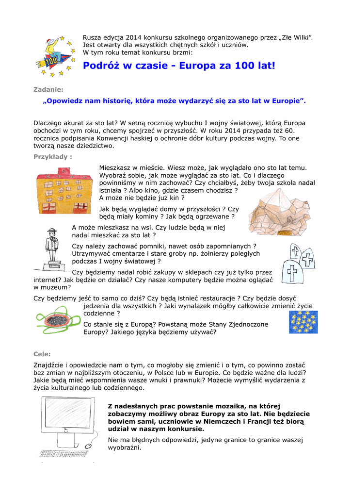 Rusza edycja 2014 konkursu szkolnego organizowanego przez „Złe Wilki”. Jest otwarty dla wszystkich chętnych szkół i uczniów. W tym roku temat konkursu brzmi: Podróż w czasie - Europa za 100 lat! Zadanie: „Opowiedz nam historię, która może wydarzyć się za sto lat w Europie”. Dlaczego akurat za sto lat? W setną rocznicę wybuchu I wojny światowej, którą Europa obchodzi w tym roku, chcemy spojrzeć w przyszłość. W roku 2014 przypada też 60. rocznica podpisania Konwencji haskiej o ochronie dóbr kultury podczas wojny. To one tworzą nasze dziedzictwo. Przykłady : Mieszkasz w mieście. Wiesz może, jak wyglądało ono sto lat temu. Wyobraź sobie, jak może wyglądać za sto lat. Co i dlaczego powinniśmy w nim zachować? Czy chciałbyś, żeby twoja szkoła nadal istniała ? Albo kino, gdzie czasem chodzisz ? A może nie będzie już kin ? Jak będą wyglądać domy w przyszłości ? Czy będą miały kominy ? Jak będą ogrzewane ? A może mieszkasz na wsi. Czy ludzie będą w niej nadal mieszkać za sto lat ? Czy należy zachować pomniki, nawet osób zapomnianych ? Utrzymywać cmentarze i stare groby np. żołnierzy poległych podczas I wojny światowej ? Czy będziemy nadal robić zakupy w sklepach czy już tylko przez internet? Jak będzie on działać? Czy nasze komputery będzie można oglądać w muzeum? Czy będziemy jeść to samo co dziś? Czy będą istnieć restauracje ? Czy będzie dosyć jedzenia dla wszystkich ? Jaki wynalazek mógłby całkowicie zmienić życie codzienne ? Co stanie się z Europą? Powstaną może Stany Zjednoczone Europy? Jakiego języka będziemy używać? Cele: Znajdźcie i opowiedzcie nam o tym, co mogłoby się zmienić i o tym, co powinno zostać bez zmian w najbliższym otoczeniu, w Polsce lub w Europie. Co będzie ważne dla ludzi? Jakie będą mieć wspomnienia wasze wnuki i prawnuki? Możecie wymyślić wydarzenia z życia kulturalnego lub codziennego. Z nadesłanych prac powstanie mozaika, na której zobaczymy możliwy obraz Europy za sto lat. Nie będziecie bowiem sami, uczniowie w Niemczech i Francji też biorą udział w naszym konkursie. Nie ma błędnych odpowiedzi, jedyne granice to granice waszej wyobraźni. Format: Teksty (Word, PDF) | Cykle fotograficzne (powerpoint, diaporama, JPEG) | Filmy (mov, MEPG) maks. : 4 min. | Ilustracje (rysunki, kolaże, komiksy…) | Pliki dźwiękowe (mp3, mp4, wave) maks. : 3 min. | Języki: niemiecki, francuski, polski. Uwaga: Prac trόjwymiarowych nie możemy przyjąć. Format A4 i mniejszy najmilej widziany. Grupa docelowa: uczniowie szkόł podstawowych, gimnazjόw i szkόł ponadgimnazjalnych Jury: dziennikarze, nauczyciele, artyści oraz redakcja „Złych wilków” Początek konkursu: w Dniu francusko-niemieckim 22 stycznia 2014 Termin nadsyłania prac: 30 maja 2014 Zgłoszenia: Online albo drogą pocztową (patrz formularz) Adres pocztowy: Grand méchant loup | Böser Wolf Apostel-Paulus-Straße 7 10823 Berlin/ Niemcy Adres emailowy: [email protected] Pytania, propozycje, sugestie: Tel.: 030 / 80 57 59 98 lub [email protected]