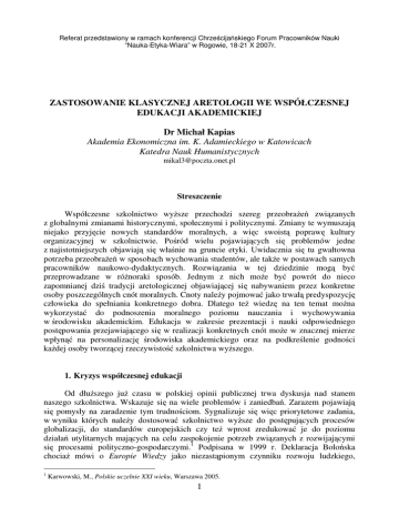 Referat przedstawiony w ramach konferencji Chrześcijańskiego Forum Pracowników Nauki “Nauka-Etyka-Wiara” w Rogowie, 18-21 X 2007r. ZASTOSOWANIE KLASYCZNEJ ARETOLOGII WE WSPÓŁCZESNEJ EDUKACJI AKADEMICKIEJ Dr Michał Kapias Akademia Ekonomiczna im. K. Adamieckiego w Katowicach Katedra Nauk Humanistycznych [email protected] Streszczenie Współczesne szkolnictwo wyższe przechodzi szereg przeobrażeń związanych z globalnymi zmianami historycznymi, społecznymi i politycznymi. Zmiany te wymuszają niejako przyjęcie nowych standardów moralnych, a więc swoistą poprawę kultury organizacyjnej w szkolnictwie. Pośród wielu pojawiających się problemów jedne z najistotniejszych objawiają się właśnie na gruncie etyki. Uwidacznia się tu gwałtowna potrzeba przeobrażeń w sposobach wychowania studentów, ale także w postawach samych pracowników naukowo-dydaktycznych. Rozwiązania w tej dziedzinie mogą być przeprowadzane w różnoraki sposób. Jednym z nich może być powrót do nieco zapomnianej dziś tradycji aretologicznej objawiającej się nabywaniem przez konkretne osoby poszczególnych cnót moralnych. Cnoty należy pojmować jako trwałą predyspozycję człowieka do spełniania konkretnego dobra. Dlatego też wiedzę na ten temat można wykorzystać do podnoszenia moralnego poziomu nauczania i wychowywania w środowisku akademickim. Edukacja w zakresie prezentacji i nauki odpowiedniego postępowania przejawiającego się w realizacji konkretnych cnót może w znacznej mierze wpłynąć na personalizację środowiska akademickiego oraz na podkreślenie godności każdej osoby tworzącej rzeczywistość szkolnictwa wyższego. 1. Kryzys współczesnej edukacji Od dłuższego już czasu w polskiej opinii publicznej trwa dyskusja nad stanem naszego szkolnictwa. Wskazuje się na wiele problemów i zaniedbań. Zarazem pojawiają się pomysły na zaradzenie tym trudnościom. Sygnalizuje się więc priorytetowe zadania, w wyniku których należy dostosować szkolnictwo wyższe do postępujących procesów globalizacji, do standardów europejskich czy też wprost zredukować je do poziomu działań utylitarnych mających na celu zaspokojenie potrzeb związanych z rozwijającymi się procesami polityczno-gospodarczymi.1 Podpisana w 1999 r. Deklaracja Bolońska chociaż mówi o Europie Wiedzy jako niezastąpionym czynniku rozwoju ludzkiego, 1 Karwowski, M., Polskie uczelnie XXI wieku, Warszawa 2005. 1 w rzeczywistości zmierza do kompatybilności i pewnej standaryzacji szkolnictwa w Europie oraz podniesienia efektywności kształcenia.2 W rezultacie powstający proces zmian zmierza ku zaistnieniu podziału na uczelnie elitarne, krajowe i regionalne, ku odpłatnym studiom, dywersyfikacji dyplomów oraz tendencjom zastępowania rektorów przez menadżerów.3 Takim trendom sprzyja tzw. cywilizacja bitowa, która: a) korzysta z ciągle zmieniających się postaci informacji oraz sposobów korzystania z danych zgromadzonych na nośnikach elektronicznych, b) zrywa z encyklopedyzmem na rzecz budowy stale poszukujących struktur poznawczych, c) pogłębia interaktywność jako walor korzystania z czyichś informacji oraz umożliwia prowadzenie dyskusji, d) daje globalność zasięgu korzystania z informacji ze względu na możliwość podłączenia się do sieci internetowej.4 Zmiany takie doprowadzają stopniowo do postaci, w której wiedza będzie oscylacyjna, tzn. będzie wypadkową wielu stanów poznawczych, emocjonalnych i sprawczych, rozpatrywanych z perspektywy różnorodnych wartości społecznokulturowych, w układach oscylujących pomiędzy porządkiem a chaosem, koniecznością a przypadkiem, schematem a permanentnym przeobrażaniem się. Tendencje te wikłają jednak edukację w szereg sprzeczności i konfliktów natury społecznej, politycznej, materialnej, a przede wszystkim – moralnej. Wynika to pośrednio z faktu zarzucenia dziś postrzegania szkoły jako rzeczywistości mającej spełniać pewne konkretne posłannictwo, które przede wszystkim powinno wyrażać się w działaniach szerokiej rzeszy nauczycieli. Taka postawa nie ujawnia się wyłącznie w podkreślaniu konkretnych obowiązków czy też zadań stawianych przed pedagogami, posłannictwo bowiem zawiera w swej istocie nade wszystko wymiar personalistyczny. Z tego też powodu podnosząc głos nad kryzysem dzisiejszej edukacji, nie tyle chodzi o jej wymiar instytucjonalny, co raczej osobowy – a nawet można by rzec – osobisty, który pojawia się w relacjach pomiędzy nauczycielem a uczniem. Trzeba bowiem wyraźnie podkreślić, iż właśnie owa relacja nie zasadza się na różnorakich regulaminach, obowiązkach czy programach, ale raczej na bliskiej więzi opartej na moralnej odpowiedzialności za drugą osobę. Nauczanie to przecież spotkanie co najmniej dwu osób nastawionych na wspólny dialog w poszukiwaniu prawdy. Tymczasem we współczesnej edukacji można wyróżnić co najmniej dwa specyficzne modele. Jeden można nazwać anarchistycznym, gdzie promuje się bezstresowość postaw, zafałszowaną tolerancję oraz nieograniczony naturalizm. Idee te wywodzą się z nurtów psychoanalitycznych oraz postmodernistycznych. Drugi model oparty jest na postawie spryciarza. Liczą się tu przede wszystkim umiejętności lawirowania, cwaniactwa oraz trzeźwego pragmatyzmu (zwłaszcza ekonomicznego). Nastawienie takie wynika z fascynacji ideologią globalistyczną oraz z zaślepienia poradami z zakresu marketingu czy public relations.5 Postawy tego typu nie są nastawione 2 Realizacja europejskiego obszaru szkolnictwa wyższego. Materiały związane procesem bolońskim, Warszawa 2003, s. 11–13. 3 Musiał, G., Dylematy uczelni wyższych w dobie globalizacji, [w:] Kojs, W., Dawid, Ł., (red.), Edukacyjne konteksty procesów globalizacji, Cieszyn 2001. 4 Gnitecki, J., Przemiany informatyki oraz cywilizacji i edukacji informatycznej, Poznań 2005. 5 Zalewski, D., „Klasycyzm zamiast modernizmu. Rzecz o e