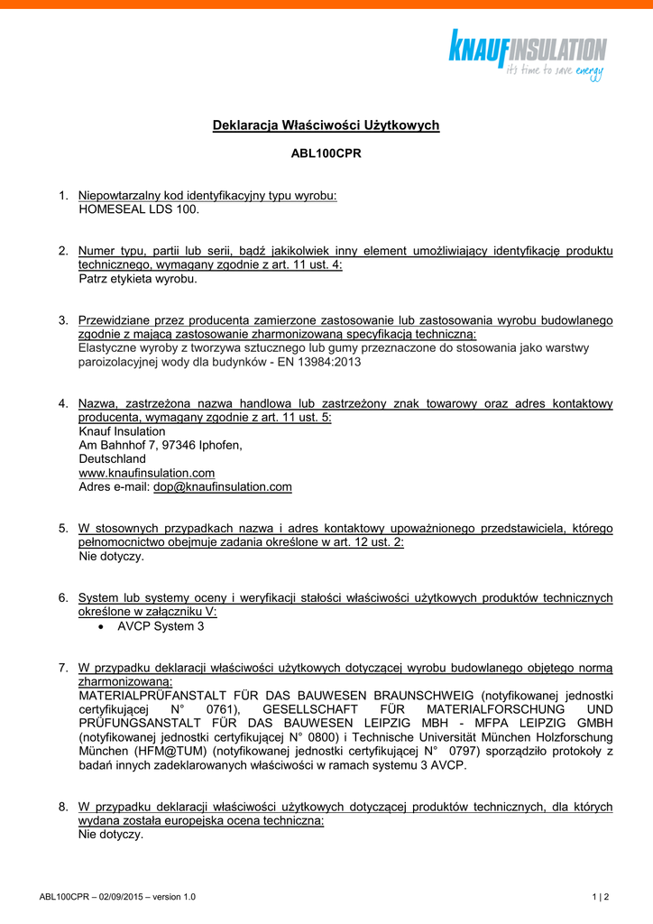 Deklaracja Właściwości Użytkowych ABL100CPR 1. Niepowtarzalny kod identyfikacyjny typu wyrobu: HOMESEAL LDS 100. 2. Numer typu, partii lub serii, bądź jakikolwiek inny element umożliwiający identyfikację produktu technicznego, wymagany zgodnie z art. 11 ust. 4: Patrz etykieta wyrobu. 3. Przewidziane przez producenta zamierzone zastosowanie lub zastosowania wyrobu budowlanego zgodnie z mającą zastosowanie zharmonizowaną specyfikacją techniczną: Elastyczne wyroby z tworzywa sztucznego lub gumy przeznaczone do stosowania jako warstwy paroizolacyjnej wody dla budynków - EN 13984:2013 4. Nazwa, zastrzeżona nazwa handlowa lub zastrzeżony znak towarowy oraz adres kontaktowy producenta, wymagany zgodnie z art. 11 ust. 5: Knauf Insulation Am Bahnhof 7, 97346 Iphofen, Deutschland www.knaufinsulation.com Adres e-mail: [email protected] 5. W stosownych przypadkach nazwa i adres kontaktowy upoważnionego przedstawiciela, którego pełnomocnictwo obejmuje zadania określone w art. 12 ust. 2: Nie dotyczy. 6. System lub systemy oceny i weryfikacji stałości właściwości użytkowych produktów technicznych określone w załączniku V: AVCP System 3 7. W przypadku deklaracji właściwości użytkowych dotyczącej wyrobu budowlanego objętego normą zharmonizowaną: MATERIALPRÜFANSTALT FÜR DAS BAUWESEN BRAUNSCHWEIG (notyfikowanej jednostki certyfikującej N° 0761), GESELLSCHAFT FÜR MATERIALFORSCHUNG UND PRÜFUNGSANSTALT FÜR DAS BAUWESEN LEIPZIG MBH - MFPA LEIPZIG GMBH (notyfikowanej jednostki certyfikującej N° 0800) i Technische Universität München Holzforschung München (HFM@TUM) (notyfikowanej jednostki certyfikującej N° 0797) sporządziło protokoły z badań innych zadeklarowanych właściwości w ramach systemu 3 AVCP. 8. W przypadku deklaracji właściwości użytkowych dotyczącej produktów technicznych, dla których wydana została europejska ocena techniczna: Nie dotyczy. ABL100CPR – 02/09/2015 – version 1.0 1|2 9. Deklarowane właściwości użytkowe: ABL100CPR Wydajność Norma Zharmonizowana Zasadnicze charakterystyki Jednostki Wartość Nominalna Pass/Fail Pass - - [ mm ] NPD - - Trwałość oporu pary wodnej przeciw starzeniu Pass/Fail Pass - - Trwałość -Chemical Odporność Pass/Fail NPD - - [N] ≥100/≥100 - - [N/50mm] NPD - - [m] 100 -0 + 20 [N/50mm] ≥140/≥110 - - [class] E - - - NPD - - Wodoszczelność Odporność na uderzenia Odporność na rozdzieranie MD / CMD Wspólna Siła Opór pary wodnej (Sd) Właściwości mechaniczne przy rozciąganiu - maksymalna siła rozciągająca MD / CMD Reakcja na ogień substancje niebezpieczne Tolerancja EN13984:2013 10. Właściwości użytkowe wyrobu określone w pkt 1 i 2 są zgodne z właściwościami użytkowymi deklarowanymi w pkt 9. Niniejsza deklaracja właściwości użytkowych wydana zostaje na wyłączną odpowiedzialność producenta określonego w pkt 4. W imieniu producenta podpisał(-a): Sasa Bavec – Group Marketing Director (Nazwisko i stanowisko) Mont-Saint-Guibert - 27/03/2015 (Miejsce i data wydania) ABL100CPR – 02/09/2015 – version 1.0 (Podpis) 2|2