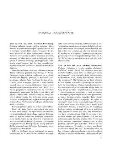 DYSKUSJA – PODSUMOWANIE Prof. dr hab. in . arch. Wojciech Bonenberg: wietnie dobrany temat, bardzo aktualny. Mo!e bardziej w potrzebach naszych dydaktycznych, ni! w realnym "wiecie, który my"l#, !e jeszcze troch# musi poczeka$ na pe%ne zastosowanie metod cyfrowych, szczególnie na etapie realizacji. Chocia!, mo!emy ju! obserwowa$ takie mo!liwo"ci, szczególnie w zakresie szybkiego prototypowania, w%a"ciwie przenoszonego ju! do fazy produkcyjnej dzi#ki platformom cyfrowym, o których mówi% Pan Dziekan. Mam tak& reßeksj#, zwi&zan& z histori& wprowadzania cyfryzacji procesu projektowego w Polsce. Pami#tam, b#d&c m%odym studentem na wydziale Politechniki l&skiej, pracuj&c u Profesora Gaw%owskiego, w%a"nie Pana Profesora Stefana Wron# – mo!e troch# starszego asystenta – który demonstrowa% wówczas naszym studentom i nam, przede wszystkim mo!liwo"ci rysowania ko%a i kreski przy u!yciu programów komputerowych. To wywo%a%o niesamowity entuzjazm. To by%o czym" takim, jak gdyby „z krainy Oz”. Teraz widzimy do czego dosz%y te eksperymenty. Jest to bardzo cenn& rzecz&, !e wci&! te eksperymenty s& prowadzone pod kierunkiem Pana Profesora i prowadz& do takich ciekawych rezultatów. Powstaje pytanie: gdzie ma to nas zaprowadzi$? Rodzi si# teraz bardzo interesuj&ca inicjatywa w sieci, która nazywa si# open-source architecture, czyli architektura, która podlega ci&g%emu doskonaleniu, w wyniku dodawania kolejnych elementów przez osoby, które nie s& w%a"ciwie w%a"cicielami praw autorskich, do kolejnych etapów tych rozwi&za' projektowych. Funkcjonuje to troch# podobnie do idei systemu Linux, który jest doskonalony przez kolejnych u!ytkowników. (eby to spotkanie mog%o zako'czy$ si# czym" konkretnym, to ja bym chcia% postawi$ wniosek, !eby nasze o"rodki uniwersyteckie udost#pni%y rozwi&zania na zasadzie open-source do kolejnych etapów udoskonale', zwi&zanych ze stosowaniem metod cyfrowych. Uwa!am, !e taka sie$ uczelni, które by wpisa%y si# w ten projekt, by%aby mo!e jak&" odpowiedzi& na wcze"niej postawione pytanie: co dalej? To by$ mo!e z naszej strony jest niewielki krok, ale konkretny. Prof. dr hab. in . arch. Andrzej Baranowski: Profesor Habraken w swojej ksi&!ce „Palladio’s Children”, mówi: „In the past architects were monument builders, today they are shaping everyday environment”, czyli „kiedy" byli"my budowniczymi monumentów, dzie%, dzisiaj kszta%tujemy "rodowisko codzienne”. Dla Habrakena, co dalej obja"nia, to by%a w%a"nie ta rewolucja paradygmatu architektury. On opowiada% si# w%a"nie za "rodowiskiem codziennym jako miejscem dzia%ania. My"l# sobie, !e tutaj zbiega si# idea – niefortunnie nazwana u nas – zrównowa!onym rozwojem, z tym my"leniem o niezwykle gospodarnym traktowaniu procesu budowania, funkcjonowania budynku. Tutaj chcia%bym wspomnie$ jeszcze o poj#ciu „life cycle assessment”, czyli ocenie cyklu !yciowego. Otó! ona nieuchronnie zmierza w stron# jeszcze mniej przez architektów lubian&, a mianowicie, !e projektuj&c budynek nale!y projektowa$ tak!e jego rozbiórk#, !eby przywróci$ status quo ante, !eby mo!na by%o co" dalej na tym miejscu robi$. To na razie w niewielkim stopniu jest praktykowane, a to nas nieuchronnie czeka. Rzetelna analiza cyklu !yciowego, która obejmuje zagadnienia energetyczne, a tak!e problem odpadów jest potrzebna. Natura nie zna poj#cia odpadów. To my"my w naszej cywilizacji wytworzyli odpad jako taki. Wyobra!am sobie, !e bez cyfryzacji takiego my"lenia, to nie jest mo!liwe, aby"my to zrobili standardowo, tradycyjnymi spo71 sobami. By$ mo!e cyfryzacja jest jakim" ratunkiem dla idei zrównowa!onego rozwoju. Prof. zw. dr hab. in . arch. Stefan Wrona: Nasz& rol& na uczelni, zadaniem dydaktycznym jest przyzwyczaja$ i zach#ca$ studentów do tego typu my"lenia. Prawd& jest, !e studenci nie lubi& my"le$ o tym, co b#dzie pó)niej, zw%aszcza o rozbiórce budynku. Dawniej ten problem rozwi&zywa%y liczne wojny. Zarówno problem odpadów, jak i rozbiórki. Stadion X-lecia by% usypany z gruzów warszawskich. To jest bardzo wa!na sprawa, ale to nie jest %atwe zadanie. Tak jak powiedzia%em, w pocz&tkach nauki AutoCada akurat opcje budowania bloków i doczepiania do nich atrybutów, a pó)niej ich wyci&gania, to by%a najbardziej nielubiana procedura w AutoCadzie, któr& studenci musieli pozna$. Na naszych uczelniach, widz# przysz%o"$ id&c& w tym kierunku, !e cz#"$ studentów, która w tej chwili wynosi zupe%nie now& wiedz# matematyczn&, techniczn&, komputerow& – z wcze"niejszych faz kszta%cenia, ze szkó% "rednich, których to interesuje, pójdzie kierunkiem, który tutaj prezentowa% Dr S%yk: eksperymenty, obliczenia, korzystanie z zaawansowanych narz#dzi komputerowych. Cz#"$ z nich pójdzie t& drug& drog& – i nie mo!na tej drogi przekre"li$ – t& intuicyjn& prac& rze)biarza, tworz&c tylko na zasadzie bod)ców, jakich" chwilowych odczu$ co" na ekranie komputera czy drukuj&c przy u!yciu drukarki 3D. Nie wszyscy nasi studenci s& przygotowani edukacyjnie i psychicznie to takiego pojmowania projektowania i modelowania. Pod&!aj&c t& "cie!k&, wydaje mi si#, !e chyba nie jest mo!liwa koncentracja wokó% takiej problematyki ca%ych szkó%, ale mniejszych zespo%ów, w ramach wybranych $wicze'. Prof. nzw. dr hab. in . arch. Jan S!yk: W "rodowisku second-life, w Ameryce w dosy$ popularnej platformie dost#pu do wirtualnej rzeczywisto"ci, w której ludzie maj& drugie !ycie, jest kilka tysi#cy Þrm architektonicznych, które tworz& tak& open-source architecture na zasadzie kolaboracji pomi#dzy jednostkami z u!ytkownikiem, w bardzo ró!ny sposób, gdzie te granice praw autorskich zacieraj& si#, w sposób wr#cz niebezpieczny dla nas. Prof. zw. dr hab. in . arch. Stefan Wrona: Second-life to profesjonalna implementacja, nie spo%eczna. Oczywi"cie powsta%y nowe narz#dzia takie, jak Facebook czy Twitter, gdzie zarejestrowani 72 u!ytkownicy maj& setki dziennie wezwa' do przeczytania ciekawych informacji. M%odzi ludzie przyj#li to jako sposób kon