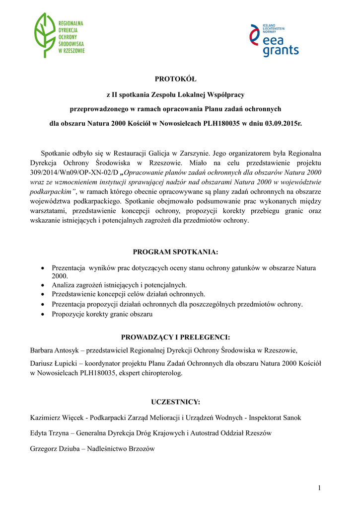 PROTOKÓŁ z II spotkania Zespołu Lokalnej Współpracy przeprowadzonego w ramach opracowania Planu zadań ochronnych dla obszaru Natura 2000 Kościół w Nowosielcach PLH180035 w dniu 03.09.2015r. Spotkanie odbyło się w Restauracji Galicja w Zarszynie. Jego organizatorem była Regionalna Dyrekcja Ochrony Środowiska w Rzeszowie. Miało na celu przedstawienie projektu 309/2014/Wn09/OP-XN-02/D „Opracowanie planów zadań ochronnych dla obszarów Natura 2000 wraz ze wzmocnieniem instytucji sprawującej nadzór nad obszarami Natura 2000 w województwie podkarpackim”, w ramach którego obecnie opracowywane są plany zadań ochronnych na obszarze województwa podkarpackiego. Spotkanie obejmowało podsumowanie prac wykonanych między warsztatami, przedstawienie koncepcji ochrony, propozycji korekty przebiegu granic oraz wskazanie istniejących i potencjalnych zagrożeń dla przedmiotów ochrony. PROGRAM SPOTKANIA: Prezentacja wyników prac dotyczących oceny stanu ochrony gatunków w obszarze Natura 2000. Analiza zagrożeń istniejących i potencjalnych. Przedstawienie koncepcji celów działań ochronnych. Prezentacja propozycji działań ochronnych dla poszczególnych przedmiotów ochrony. Propozycje korekty granic obszaru PROWADZĄCY I PRELEGENCI: Barbara Antosyk – przedstawiciel Regionalnej Dyrekcji Ochrony Środowiska w Rzeszowie, Dariusz Łupicki – koordynator projektu Planu Zadań Ochronnych dla obszaru Natura 2000 Kościół w Nowosielcach PLH180035, ekspert chiropterolog. UCZESTNICY: Kazimierz Więcek - Podkarpacki Zarząd Melioracji i Urządzeń Wodnych - Inspektorat Sanok Edyta Trzyna – Generalna Dyrekcja Dróg Krajowych i Autostrad Oddział Rzeszów Grzegorz Dziuba – Nadleśnictwo Brzozów 1 Robert Pieszczoch - Agencja Restrukturyzacji i Modernizacji Rolnictwa w Sanoku Mateusz Nawalaniec - Starostwo Powiatowe Sanok Magdalena Lorenc – Urząd Gminy Zarszyn Magiera Krzysztof – Komag Consulting PRZEBIEG SPOTKANIA Rozpoczęcie spotkania i prezentacje: Spotkanie rozpoczęła Pani Barbara Antosyk, która przywitała uczestników oraz przedstawiła w skrócie zagadnienia, które zostaną zaprezentowane podczas II spotkania ZLW. Następnie głos zabrał Pan Dariusz Łupicki, który przedstawił wyniki badań nad projektem planu zadań ochronnych tj. ocenę stanu przedmiotów ochrony objętych planem, zagrożenia, cele działań ochronnych, planowane działania ochronne i propozycje zmiany granic obszaru. Przy omawianiu zagadnień posłużono się sporządzoną dokumentacją pzo Przedstawione prezentacje zamieszczone są na stronie internetowej RDOŚ w Rzeszowie (http://rzeszow.rdos.gov.pl) w zakładce „Plany zadań ochronnych”. DYSKUSJA Mateusz Nawalaniec Zapytał, jaki jest potencjalny kierunek rozwoju kolonii rozrodczej nietoperzy, ponieważ liczebność pomiędzy liczeniami (maj – lipiec 2015) wzrosła dwukrotnie, oraz ile może pomieścić nietoperzy strych kościoła w Nowosielcach. Dariusz Łupicki Wyjaśnił, że w trakcie liczenia majowego w kolonii były osobniki dorosłe i one zostały policzone. Natomiast podczas liczenia w lipcu liczba wzrosła, gdyż oprócz dorosłych pojawiły się już młode osobniki. Nie oznacza to jednak, że w następnym roku liczba osobników w kolonii przekroczy ponad 500, gdyż nastąpi naturalna selekcja gatunku (część młodocianych nietoperzy np. nie przeżyje okresu hibernacji) oraz część odleci do innych obszarów. Co do pytania, ile może pomieścić nietoperzy strych kościoła w Nowosielcach, odpowiedź brzmi dużo więcej, niż jest 2 obecnie, ponieważ w porównywalnym gabarytowo kościele we Wleniu (woj. dolnośląskie) kolonia rozrodcza nocka dużego wynosi ponad 2000 osobników. Kazimierz Więcek Zapytał, iż patrząc na pokazane podczas prezentacji trasy przelotu nietoperzy na miejsca żerowania, jedna z tych tras przebiega przy potoku Pielnica, gdzie ma powstać polder przeciwpowodziowy i czy ten obszar zostanie objęty zadaniami ochronnymi w dokumentacji projektu PZO. Dariusz Łupicki Wyjaśnił, że cała dokumentacja projektu PZO, a tym samym przedstawione zadania ochronne dotyczą tylko obszaru na którym przedmiot ochrony. Nie obejmuje on działek poza granicami obszaru Natura 2000 Kościół w Nowosielcach. Z uwagi na małą powierzchnię przedmiotowego obszaru, trasy przelotów nietoperzy i ich miejsca żerowania będą znajdować się poza granicami obszaru, gdyż przedmiot ochrony nocek duży w okresie poza hibernacyjnym w poszukiwaniu pożywienia może przemieszczać się na żerowiska nawet do 25 km od kolonii rozrodczej. Co do samych przedstawionych tras przelotów nietoperzy, zostaną one tylko pokazane w raporcie z prac terenowych. W przedmiotowej dokumentacji projektu PZO i w projekcie zarządzenia nie zostaną one pokazane i nie mają żadnego wpływu na budowę polderu przeciwpowodziowego. Jednakże dodał, iż więcej okresowych zbiorników wodnych rejonie kolonii, tym lepiej dla nietoperzy, gdyż będą one miały bliżej do wodopoju oraz do bazy pokarmowej. Barbara Antosyk Dodała że prace na projektem dotyczą działań w granicach obszaru na którym znajduje się przedmiot ochrony, a jedyną tabelą która uwzględnia teren poza granicami obszaru Natura 2000 są wskazania do dokumentów planistycznych. Edyta Trzyna Zapytała, czy podczas lotów nietoperzy do miejsc żerowania lub wodopoju obniżają swój lot i to powoduje wzrost śmiertelności nietoperzy w kolizji z samochodami. Dariusz Łupicki Wyjaśnił, iż nocek duży unika miejsc z hałasem, światłami, a że jest to duży i silny nietoperz potrafi ominąć takie przeszkody i nie giną zbyt często. Dodał także, że wyniku badań nad nietoperzami tj. np. drogi o dużym natężeniu, gdzie odległość pomiędzy pojazdami nie jest zbyt duża i samochody jadą w swoich światłach, nietoperze potrafią zauważyć takie zagrożenia i ominąć takie przeszkody. Mateusz Nawalaniec Zapytał, czy w kolonii mogą występować inne 