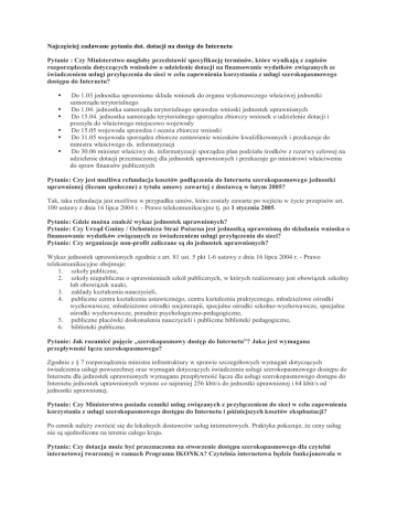 Najczęściej zadawane pytania dot. dotacji na dostęp do Internetu Pytanie : Czy Ministerstwo mogłoby przedstawić specyfikację terminów, które wynikają z zapisów rozporządzenia dotyczących wniosków o udzielenie dotacji na finansowanie wydatków związanych ze świadczeniem usługi przyłączenia do sieci w celu zapewnienia korzystania z usługi szerokopasmowego dostępu do Internetu? § § § § § § Do 1.03 jednostka uprawniona składa wniosek do organu wykonawczego właściwej jednostki samorządu terytorialnego Do 1.04. jednostka samorządu terytorialnego sprawdza wnioski jednostek uprawnionych Do 15.04. jednostka samorządu terytorialnego sporządza zbiorczy wniosek o udzielenie dotacji i przesyła do właściwego miejscowo wojewody Do 15.05 wojewoda sprawdza i ocenia zbiorcze wnioski Do 31.05 wojewoda sporządza zbiorcze zestawienie wniosków kwalifikowanych i przekazuje do ministra właściwego ds. informatyzacji Do 30.06 minister właściwy ds. informatyzacji sporządza plan podziału środków z rezerwy celowej na udzielenie dotacji przeznaczonej dla jednostek uprawnionych i przekazuje go ministrowi właściwemu do spraw finansów publicznych Pytanie: Czy jest możliwa refundacja kosztów podłączenia do Internetu szerokopasmowego jednostki uprawnionej (liceum społeczne) z tytułu umowy zawartej z dostawcą w lutym 2005? Tak, taka refundacja jest możliwa w przypadku umów, które zostały zawarte po wejściu w życie przepisów art. 100 ustawy z dnia 16 lipca 2004 r. - Prawo telekomunikacyjne tj. po 1 stycznia 2005. Pytanie: Gdzie można znaleźć wykaz jednostek uprawnionych? Pytanie: Czy Urząd Gminy / Ochotnicza Straż Pożarna jest jednostką uprawnioną do składania wniosku o finansowanie wydatków związanych ze świadczeniem usługi przyłączenia do sieci? Pytanie: Czy organizacje non-profit zaliczane są do jednostek uprawnionych? Wykaz jednostek uprawnionych zgodnie z art. 81 ust. 5 pkt 1-6 ustawy z dnia 16 lipca 2004 r. - Prawo telekomunikacyjne obejmuje: 1. szkoły publiczne, 2. szkoły niepubliczne o uprawnieniach szkół publicznych, w których realizowany jest obowiązek szkolny lub obowiązek nauki, 3. zakłady kształcenia nauczycieli, 4. publiczne centra kształcenia ustawicznego, centra kształcenia praktycznego, młodzieżowe ośrodki wychowawcze, młodzieżowe ośrodki socjoterapii, specjalne ośrodki szkolno-wychowawcze, specjalne ośrodki wychowawcze, poradnie psychologiczno-pedagogiczne, 5. publiczne placówki doskonalenia nauczycieli i publiczne biblioteki pedagogiczne, 6. biblioteki publiczne. Pytanie: Jak rozumieć pojęcie „szerokopasmowy dostęp do Internetu”? Jaka jest wymagana przepływność łącza szerokopasmowego? Zgodnie z § 7 rozporządzenia ministra infrastruktury w sprawie szczegółowych wymagań dotyczących świadczenia usługi powszechnej oraz wymagań dotyczących świadczenia usługi szerokopasmowego dostępu do Internetu dla jednostek uprawnionych wymagana przepływność łącza dla usługi szerokopasmowego dostępu do Internetu jednostek uprawnionych wynosi co najmniej 256 kbit/s do jednostki uprawnionej i 64 kbit/s od jednostki uprawnionej. Pytanie: Czy Ministerstwo posiada cenniki usług związanych z przyłączeniem do sieci w celu zapewnienia korzystania z usługi szerokopasmowego dostępu do Internetu i późniejszych kosztów eksploatacji? Po cennik należy zwrócić się do lokalnych dostawców usług internetowych. Praktyka pokazuje, że ceny usług nie są ujednolicone na terenie całego kraju. Pytanie: Czy dotacja może być przeznaczona na stworzenie dostępu szerokopasmowego dla czytelni internetowej tworzonej w ramach Programu IKONKA? Czytelnia internetowa będzie funkcjonowała w jednostce uprawnionej znajdującej się na liście, o której mowa w art. 81 ust. 5 pkt 1-6 ustawy z dnia 16 lipca 2004 r. - Prawo telekomunikacyjne. TAK. Pytanie: Z rozporządzenia wynika, iż dotacja może być udzielona wyłącznie na przyłącze do sieci. Czy zatem można to interpretować w ten sposób, iż zalicza się do tego również okablowanie strukturalne w pomieszczeniach jednostki uprawnionej, czy zakup sprzętu sieciowego (przełączniki)? Pytanie: Jedyny obecnie w Gminie X dostawca usług internetowych nie przewiduje w najbliższej przyszłości zbudowania węzła DSL w gminie, pomimo zapotrzebowania na dostęp szerokopasmowy zgłoszonego przez wielu klientów instytucjonalnych i indywidualnych. Czy dotacja celowa mogłaby posłużyć na zbudowanie węzła DSL w naszej centrali telefonicznej ? Pytanie: Czy dotacja może być przyznana na wyposażenie w nowy sprzęt pracowni komputerowej w jednostce uprawnionej? Pytanie: Czy dotacja może być przeznaczona na refundowanie zleceń dla pracowników Starostwa Powiatowego w Y związanych z przygotowywaniem przez nich wniosków o dofinansowanie (nasz projekt obejmuje powiat ziemski Y i wszystkie jego gminy)? Nie. Kwestie dotyczące kryteriów i zakresu finansowania przyłączenia do Internetu określa § 2 rozporządzenia, którego ust. 1 nie przewiduje kwalifikowalności tego typu kosztów. Wynika to jednoznacznie z delegacji, jaką daje art. 100 ust. 3 ustawy z dnia 16 lipca 2004 r. - Prawo telekomunikacyjne (Dz. U. Nr 171, poz. 1800 i Nr 273, poz. 2703). Pytanie: Jednostki uprawnione z gminy zamierzają wystąpić o dotację na finansowanie wydatków związanych ze świadczeniem usługi przyłączenia do sieci w celu zapewnienia korzystania z usługi szerokopasmowego dostępu do Internetu. Niestety, tylko jeden dostawca gwarantuje nam tego typu podłączenie drogą radiową / satelitarną. Inni dostawcy nie widzą możliwości uruchomienia tego typu usług na terenie gminy co najmniej do roku 2007. Czy wobec tego jest możliwe dofinansowanie w ramach ww. dotacji takiego podłączenia? Jeśli sytuacja lokalna ma taki charakter jak wyżej opisany, w naszej ocenie mogłyby mieć zastosowanie obiektywne wyłączenia w ust. 4 § 2. Sytuację należy przedstawić we